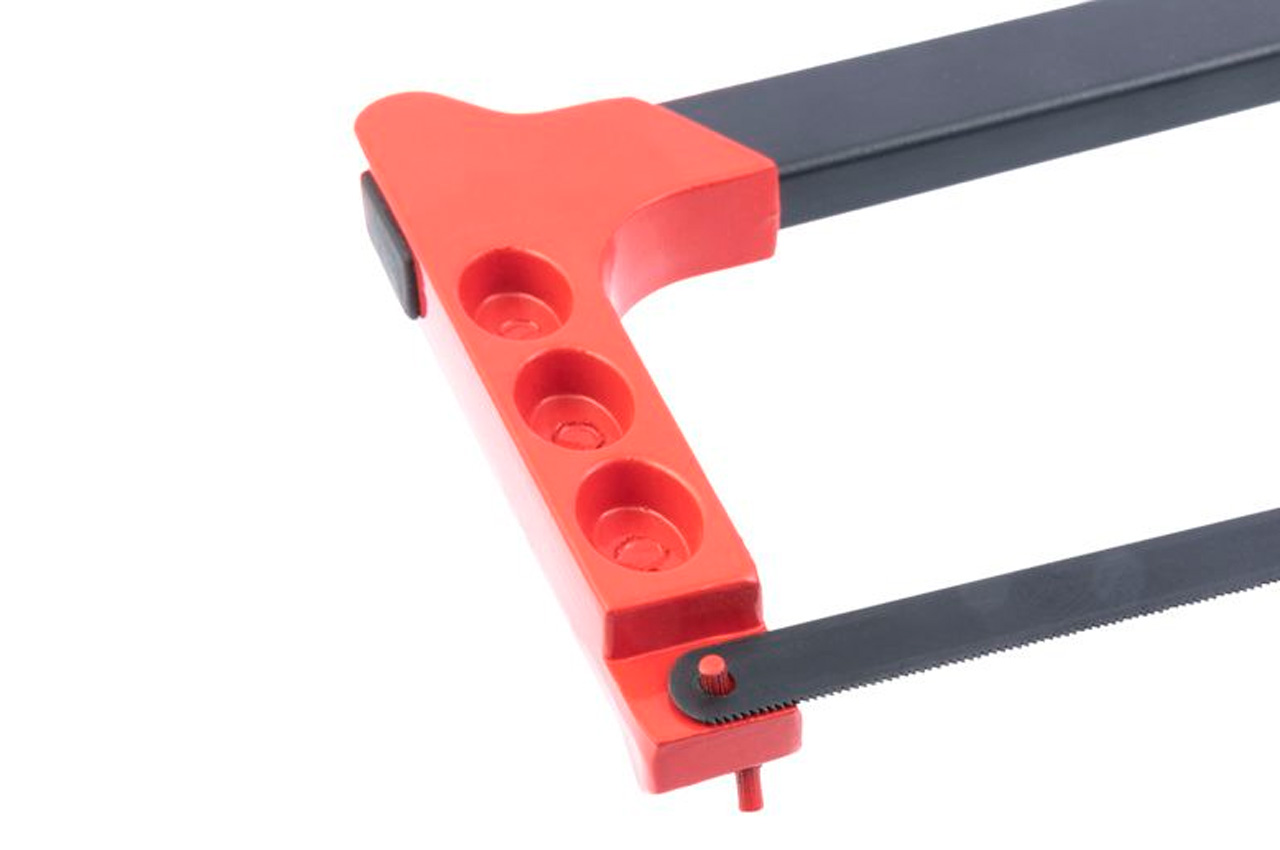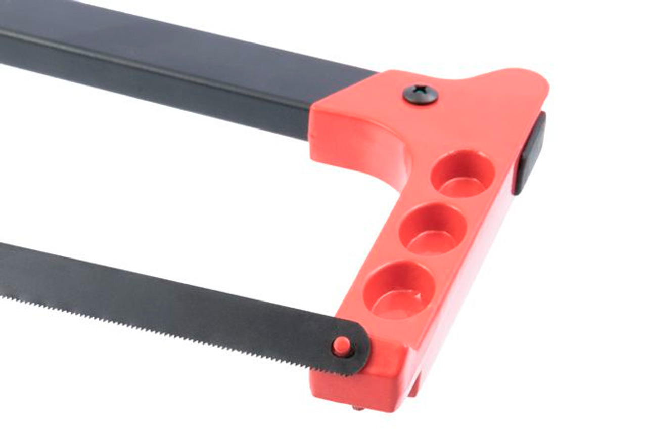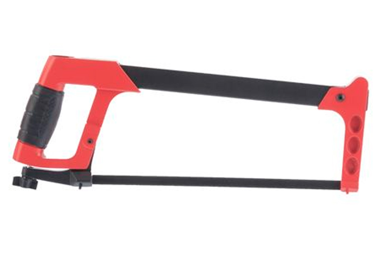 Ножовка по металлу под полотно 300 мм имеет стальную раму и оснащена эргономичной алюминиевой прорезиненной рукояткой. Применяется рычажный механизм фиксирования и натяжения полотна. Возможность установки полотна под углом в 90° и 45°. Материал рукоятки: алюминий с резиновым покрытием