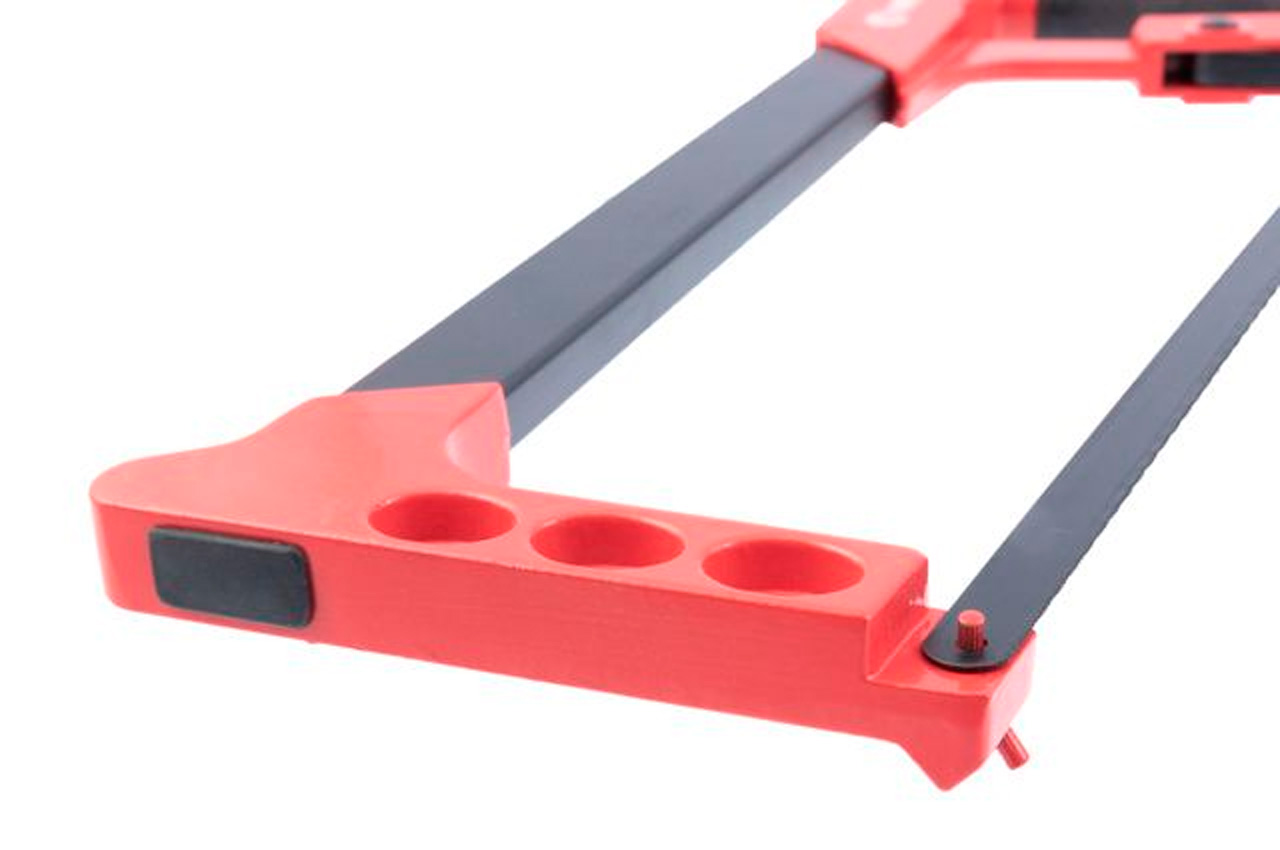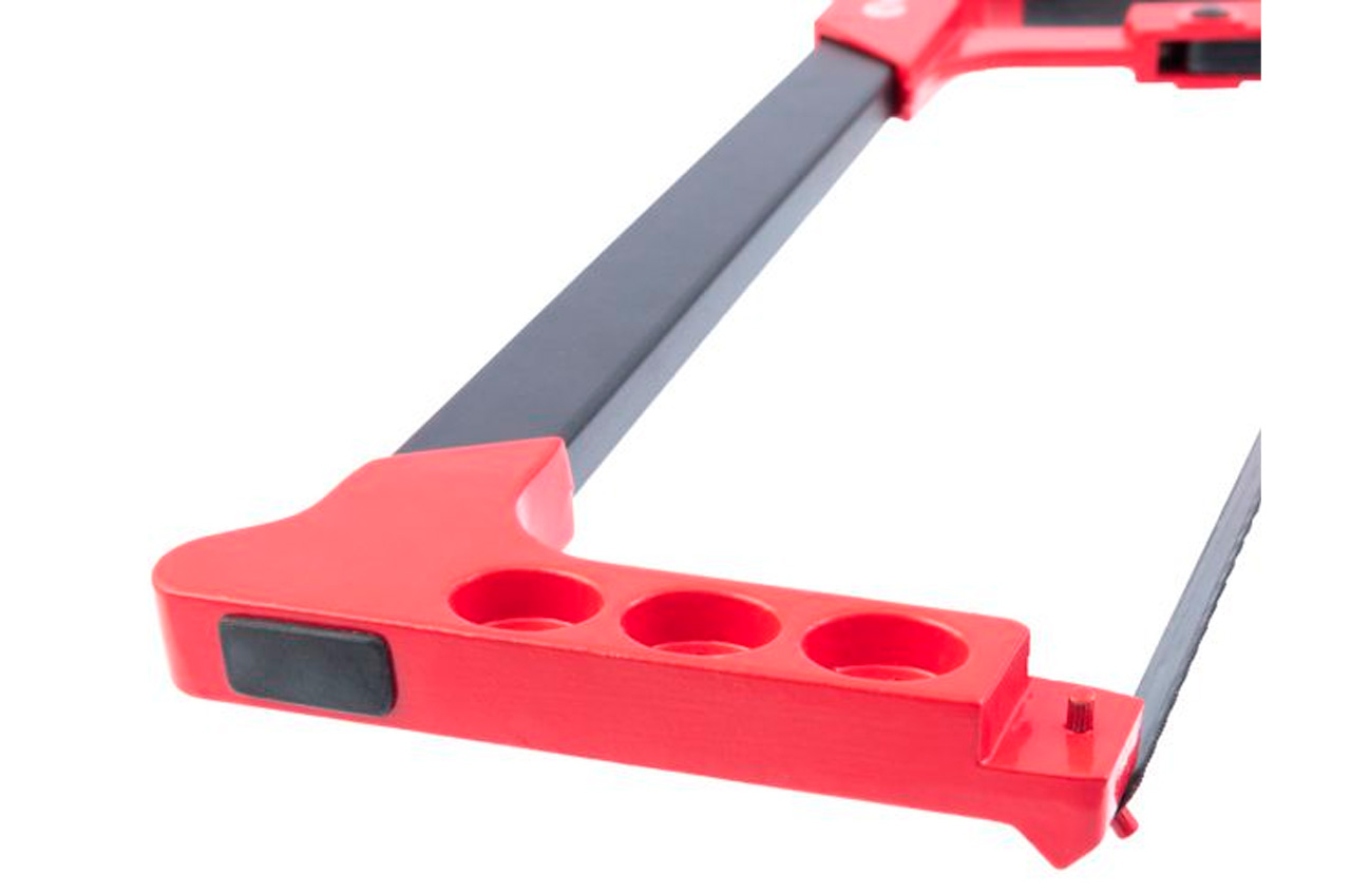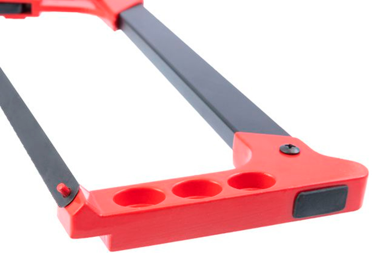 Ножовка по металлу под полотно 300 мм имеет стальную раму и оснащена эргономичной алюминиевой прорезиненной рукояткой. Применяется рычажный механизм фиксирования и натяжения полотна. Возможность установки полотна под углом в 90° и 45°. Материал рукоятки: алюминий с резиновым покрытием