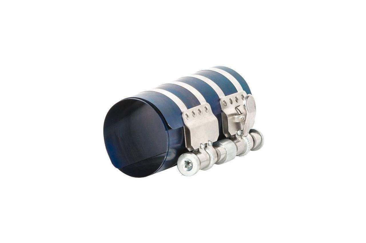 Предназначена для обжима и фиксации поршневых колец при их монтаже и замене. Применяется при ремонте двигателя. Изготовлена из высококачественной пружинной стали и снабжена храповым фиксирующим механизмом. Насечки на одной из ее сторон служат для предотвращения соскальзывания хромированной стягивающей ленты. В комплект входит четырехгранный ключ для затягивания обжимки.