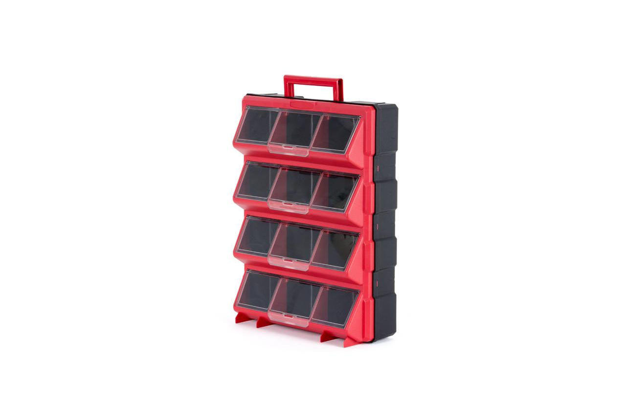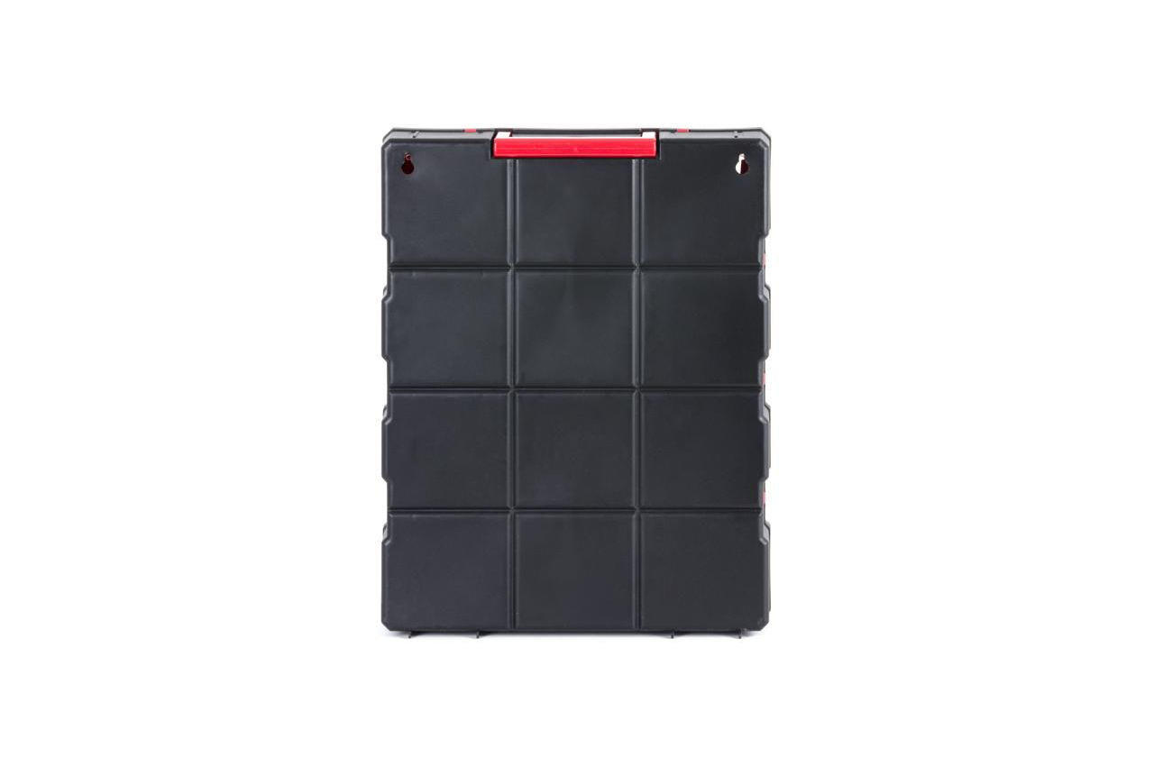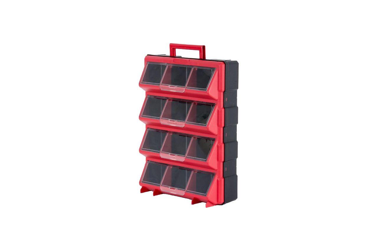 12 больших отделений с прозрачной цельной крышкой на весь горизонтальныяй ряд. Крышки имеею две точки фиксации в закрытом и открытом состоянии. Органайзер имеет отверстия на задней стороне для подвешивания, но помимо этого снабжен складной ручкой для переноса. Конструкция органайзера позволяет пользоваться им как в вертикальном положении, так и горизонтальном. Количество секций: 12 шт; Габаритные размеры: 475 х 380 х 135 мм