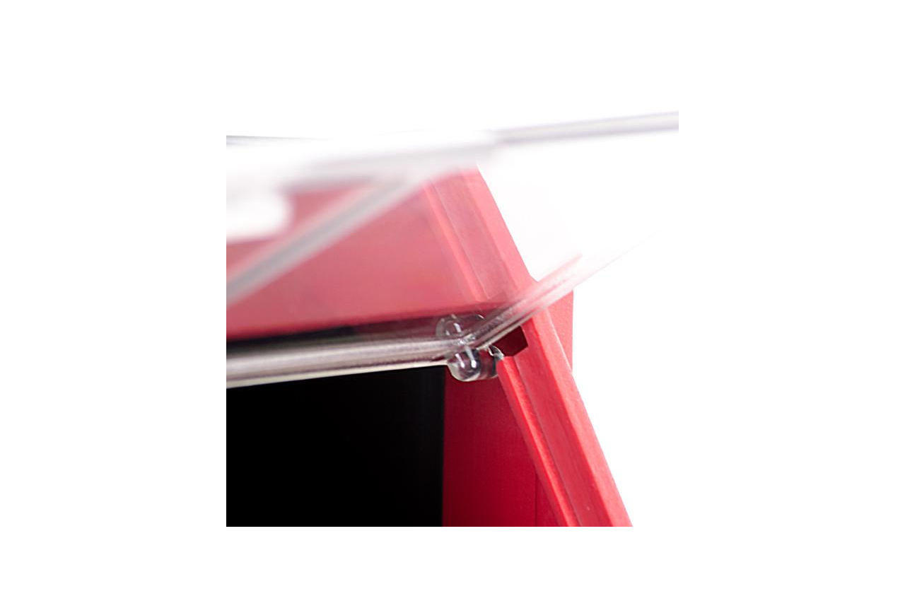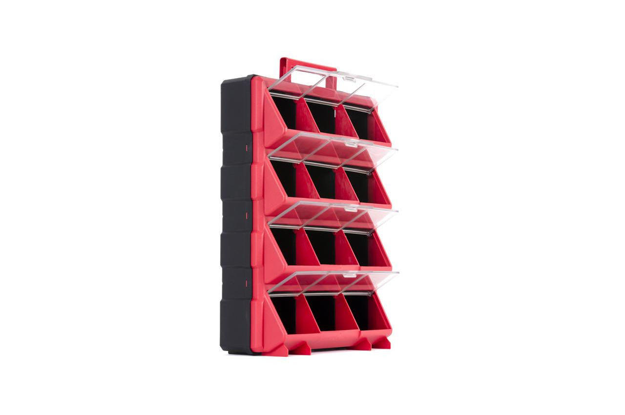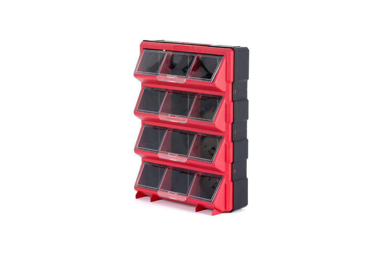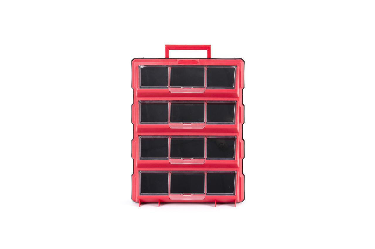 12 больших отделений с прозрачной цельной крышкой на весь горизонтальныяй ряд. Крышки имеею две точки фиксации в закрытом и открытом состоянии. Органайзер имеет отверстия на задней стороне для подвешивания, но помимо этого снабжен складной ручкой для переноса. Конструкция органайзера позволяет пользоваться им как в вертикальном положении, так и горизонтальном. Количество секций: 12 шт; Габаритные размеры: 475 х 380 х 135 мм