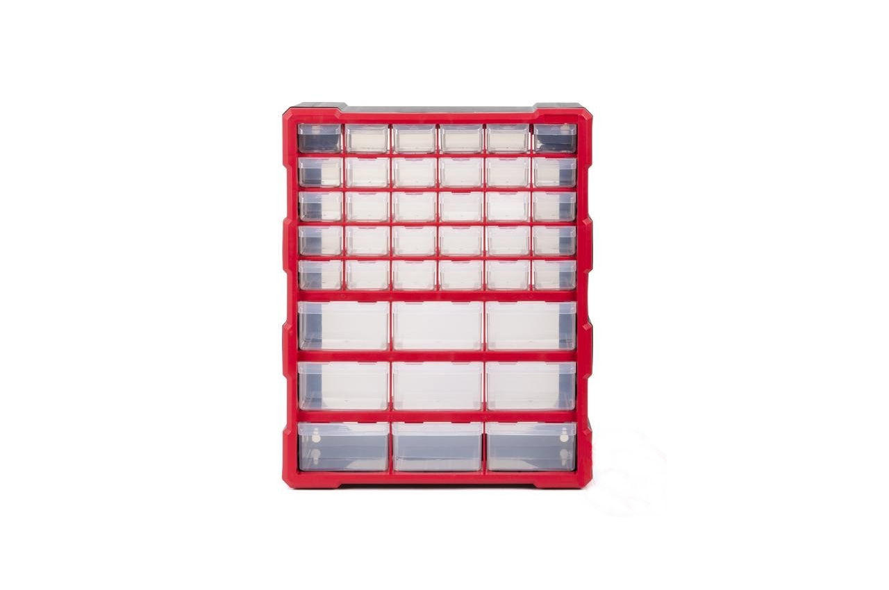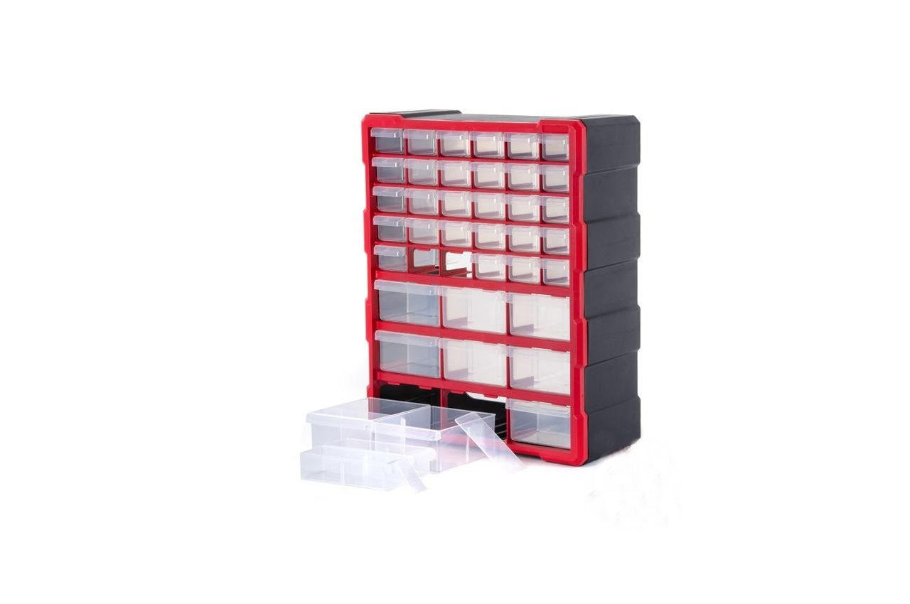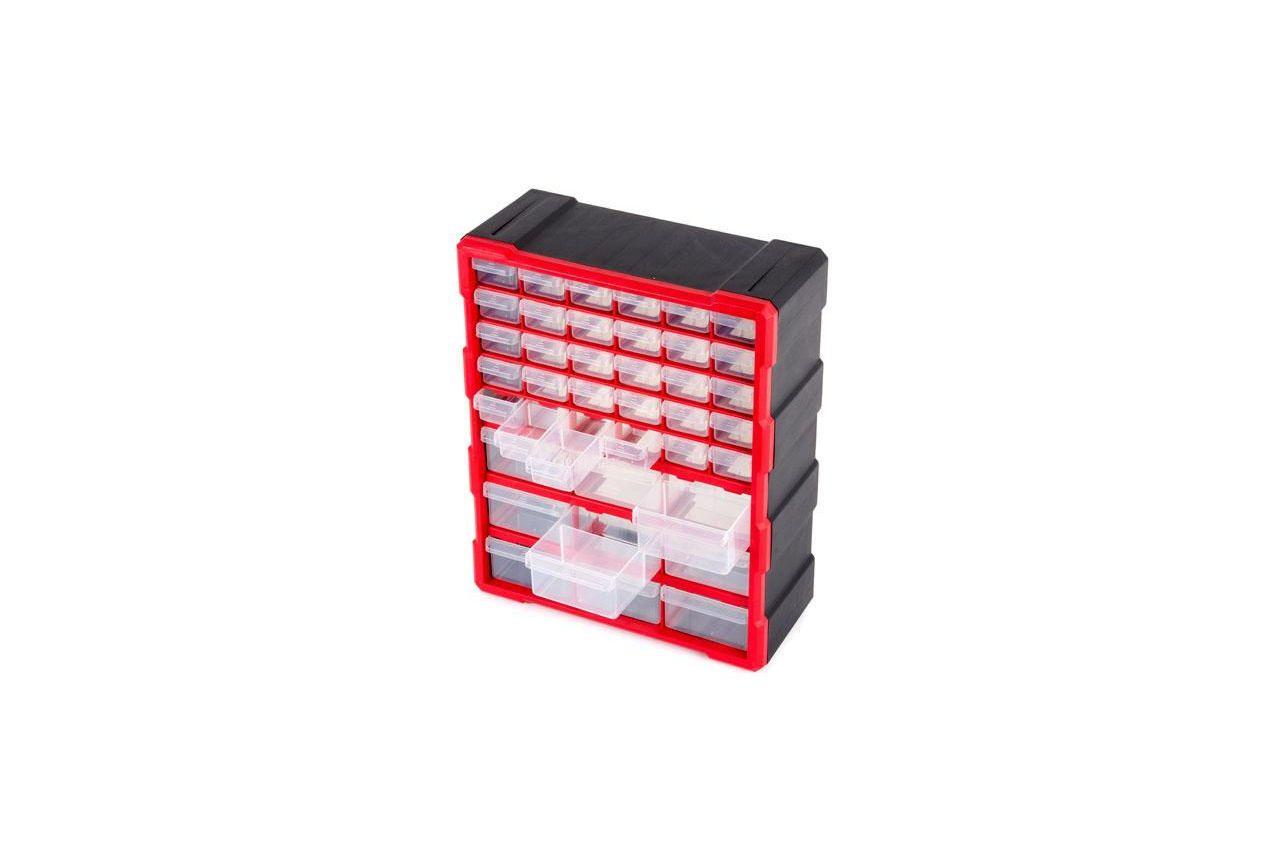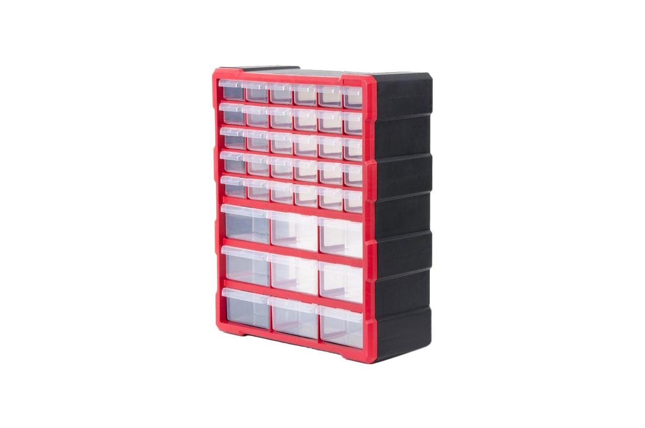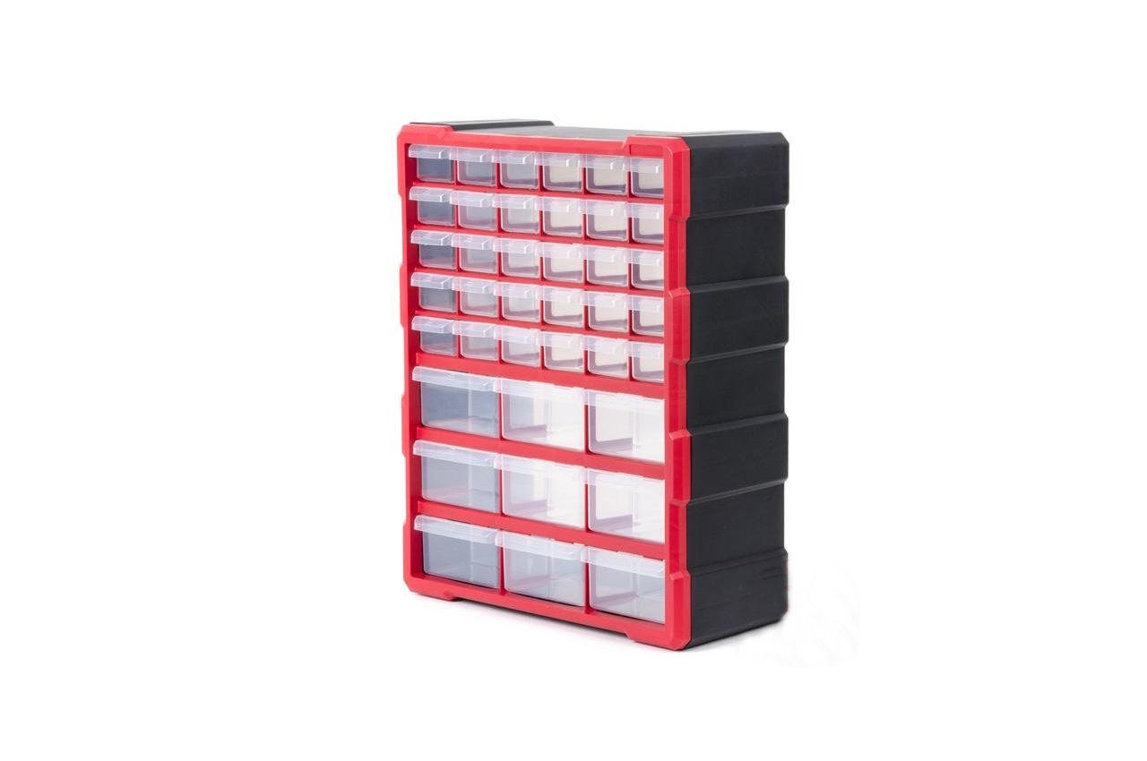 Корпус изготовлен из прочного пластика, а его форма позволяет устанавливать органайзер на поверхность или подвесить на стену. Прозрачные ячейки не дадут запутаться при поиске необходимого инструмента. Все якейки оснащены съемными перегородками для большего удобства хранения деталей. 30 малых ячеек. 9 больших ячеек. Количество секций: 39 шт; Габаритные размеры: 475х380х160 мм