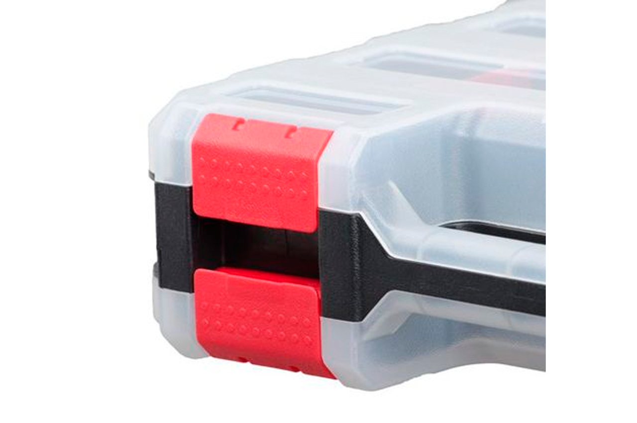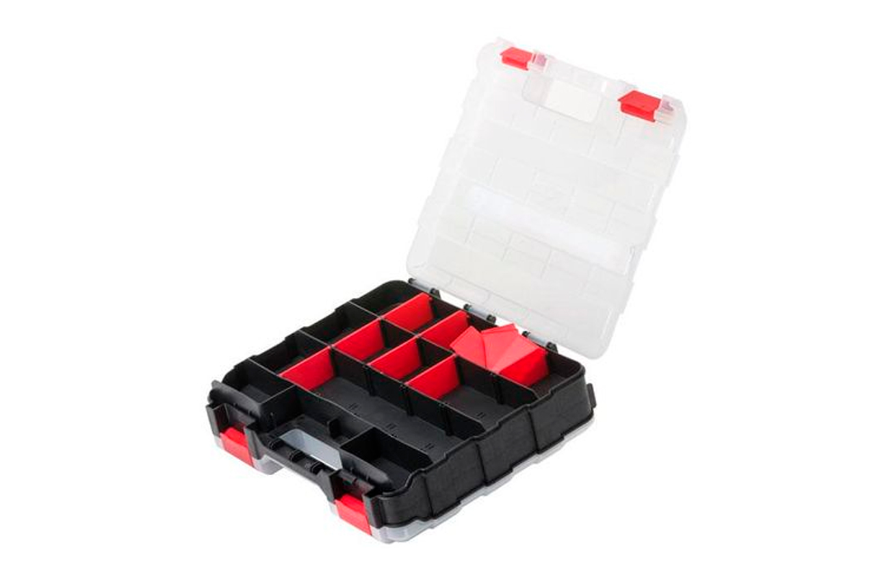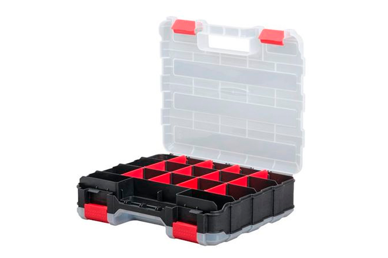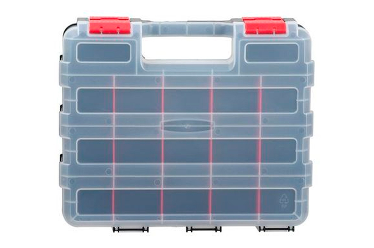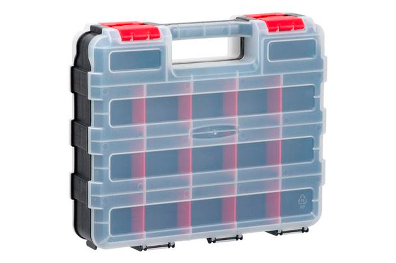 В вашем распоряжении 34 секции, по 17 с каждой стороны. В этот ящик можно положить инструмент длиной до 30см, благодаря съёмным перегородкам между секциями. Крышка изготовлена из полипропилена и усилена ребрами жесткости, устойчива к сколам и позволяет хранить органайзеры один на другом. Прозрачность крышки позволяет быстро находить необходимые предметы. Надежные мощные замки не дают рассыпаться содержимому, даже при вертикальной переноске. Ручка усилена и повторяет форму руки, что очень удобно при транспортировке. Размер съемных ячеек: 60х65х34 мм; Размер несъемных ячеек: 85х44х34 мм; Количество секций: 34 ед.; Габаритные размеры: 320х270х80 мм
