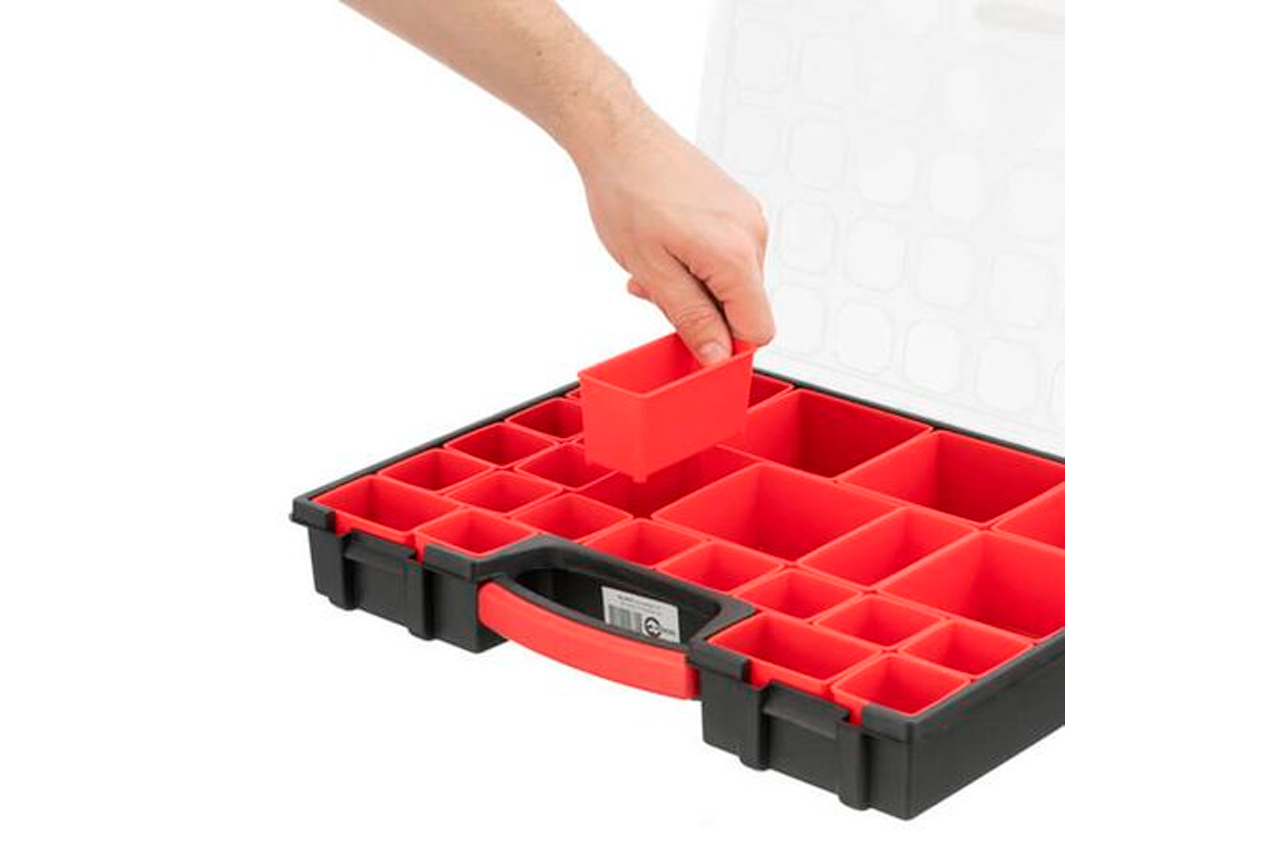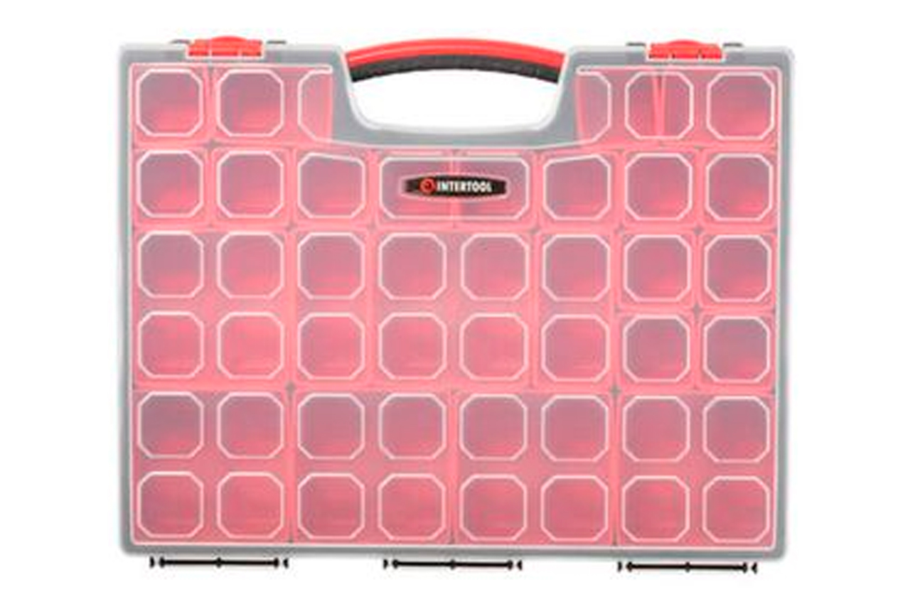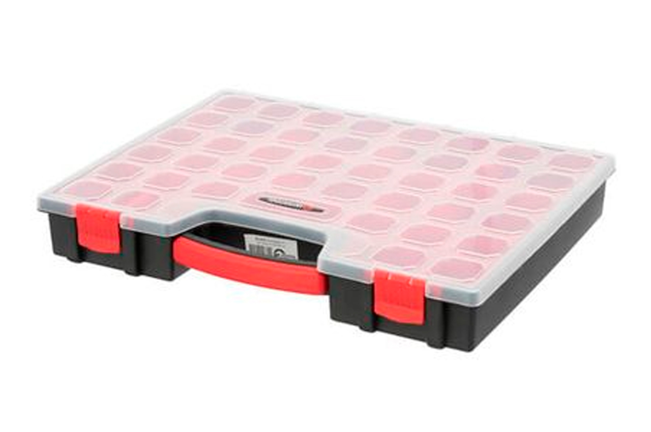 Удобный и вместительный органайзер BX-4033 (41.5х33х6 см) подходит для хранения и транспортировки небольших предметов (крепежных элементов, мелких инструментов, метизов, фурнитуры, запчастей, рыболовных принадлежностей и прочих мелочей). Особенности: Вместительный органайзер с двумя надежными замками. Ничего не выпадает, не перемешивается, благодаря отдельным секциям. Съемные лотки (секции) могут применятся как отдельные единицы для хранения мелких деталей вне органайзера. Органайзер изготовлен из прочного, толстого пластика. Вмещает в себе 24 лотка (секции) различных размеров. Большие и меньшие лотки можно менять местами, комбинировать их расположение для максимального удобства использования. В этот органайзер можно положить любой инструмент длиной до 41 см и шириной до 33 см, благодаря лоткам, которые снимаются. Два замка надежно прижимают крышку и не дают пересыпаться даже небольшим деталям. Крышка изготовлена из прочного полипропилена и устойчива к сколам. Прозрачность крышки помогает быстро находить необходимые предметы. Удобная ручка усилена и повторяет форму руки, что очень удобно при транспортировке. Количество секций: 24 шт; Габаритные размеры: 415х330х60 мм