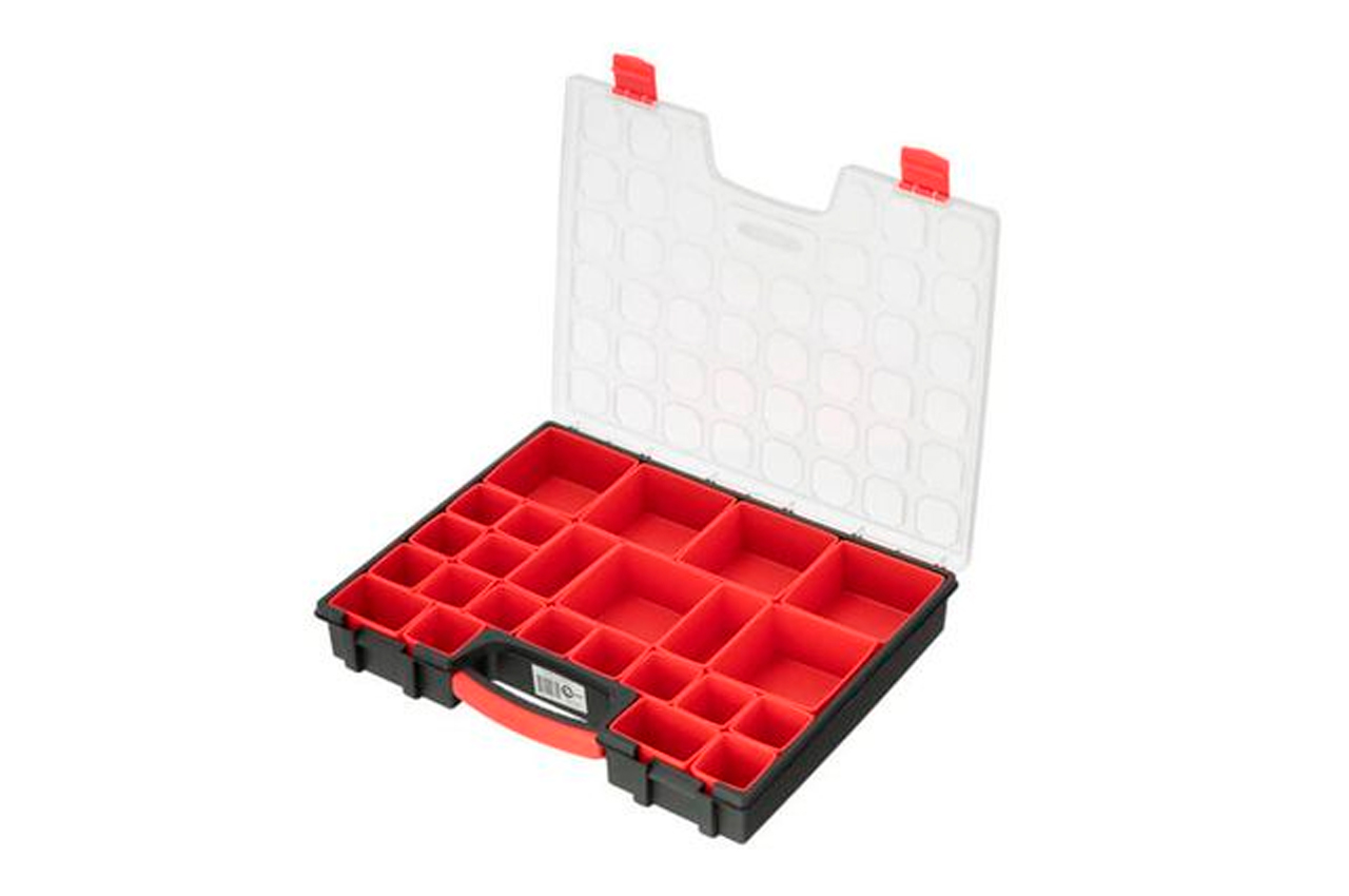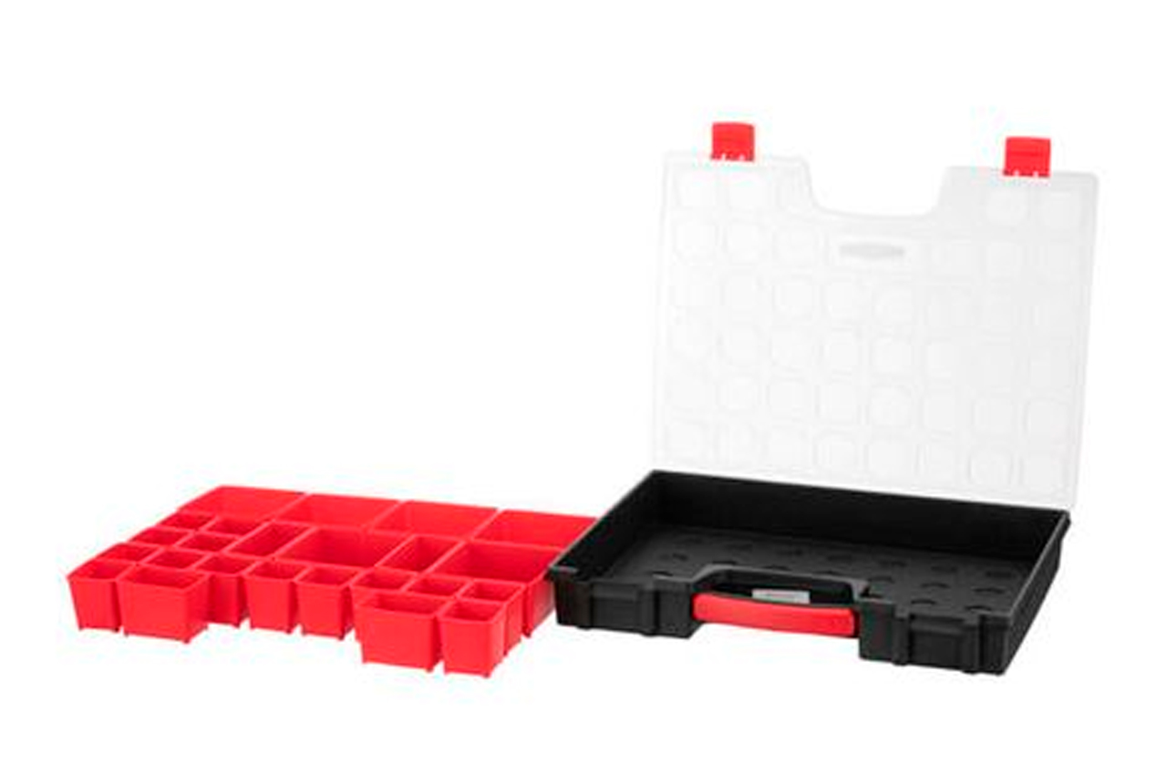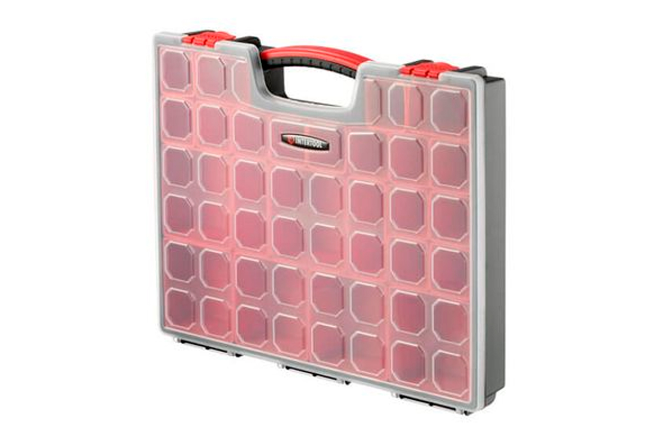Удобный и вместительный органайзер BX-4033 (41.5х33х6 см) подходит для хранения и транспортировки небольших предметов (крепежных элементов, мелких инструментов, метизов, фурнитуры, запчастей, рыболовных принадлежностей и прочих мелочей). Особенности: Вместительный органайзер с двумя надежными замками. Ничего не выпадает, не перемешивается, благодаря отдельным секциям. Съемные лотки (секции) могут применятся как отдельные единицы для хранения мелких деталей вне органайзера. Органайзер изготовлен из прочного, толстого пластика. Вмещает в себе 24 лотка (секции) различных размеров. Большие и меньшие лотки можно менять местами, комбинировать их расположение для максимального удобства использования. В этот органайзер можно положить любой инструмент длиной до 41 см и шириной до 33 см, благодаря лоткам, которые снимаются. Два замка надежно прижимают крышку и не дают пересыпаться даже небольшим деталям. Крышка изготовлена из прочного полипропилена и устойчива к сколам. Прозрачность крышки помогает быстро находить необходимые предметы. Удобная ручка усилена и повторяет форму руки, что очень удобно при транспортировке. Количество секций: 24 шт; Габаритные размеры: 415х330х60 мм
