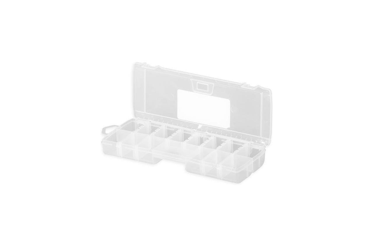 Органайзер можно использовать для хранения микросхем, гвоздей, винтов, гаек, болтов, шайб, сережек, бусин, канцелярских кнопок, зажимов, рыболовных снастей и других мелких деталей, предметов. Имеет габаритные размеры 300х115х40 мм. Выполнен из прочного прозрачного пластика.