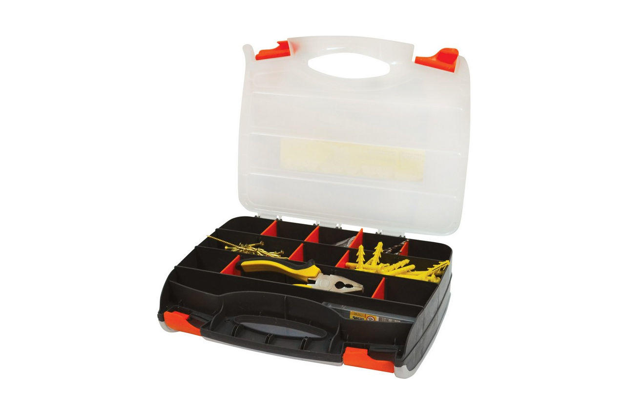Органайзер 12,5" 2-в-1 (кейс с ячейками с обеих сторон) имеет габаритные размеры 320х260х80 мм. Выполнен из прочного пластика с прозрачными крышками. Все поперечные перегородки снимаются.