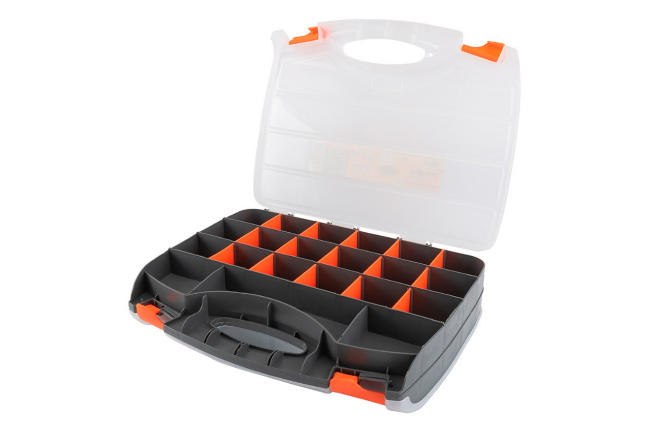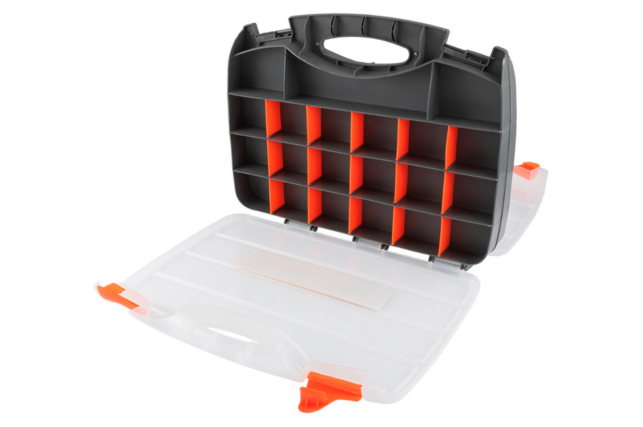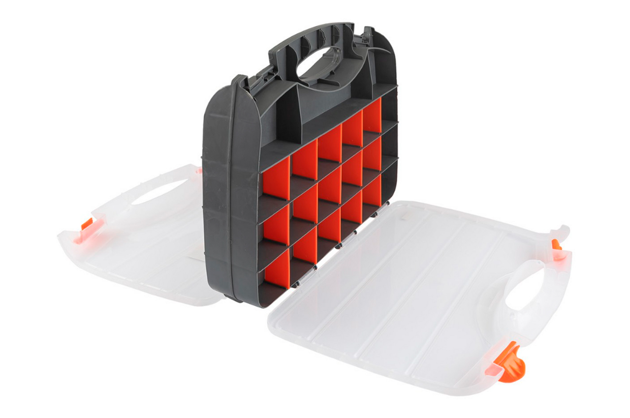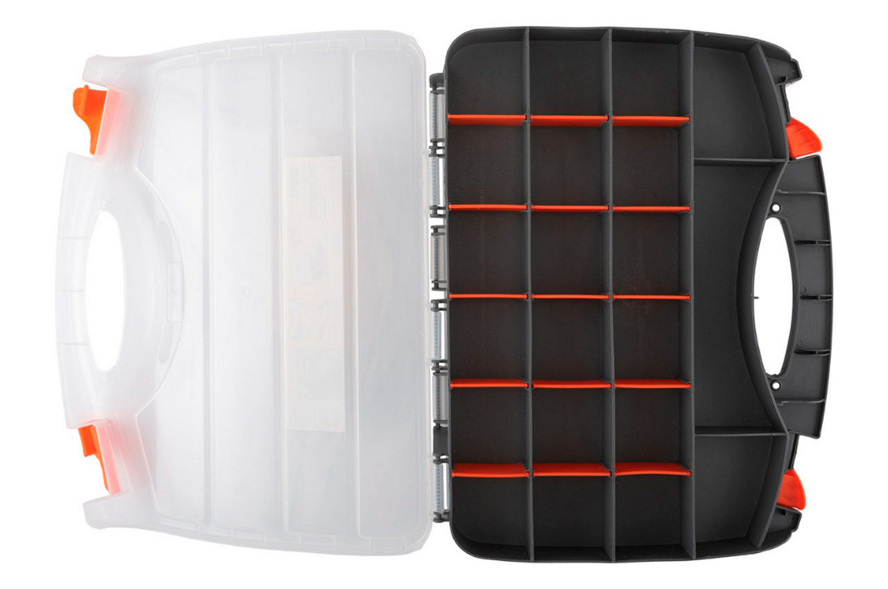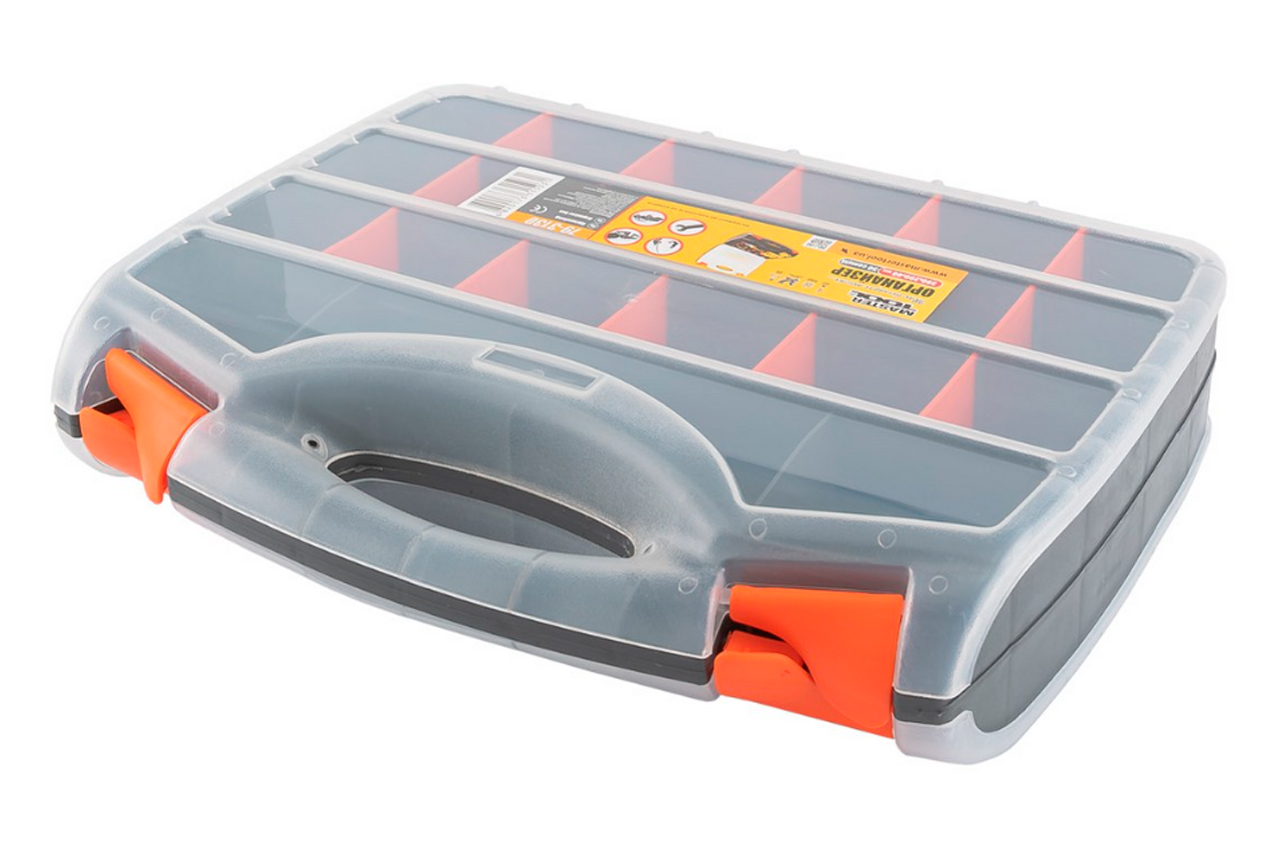 Органайзер 15" 2-в-1 (кейс с ячейками с обеих сторон) имеет габаритные размеры 380х290х80 мм. Выполнен из прочного пластика с прозрачными крышками. Все поперечные перегородки снимаются.