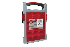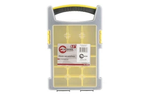 Мини-органайзер пластиковый, 8.5". Имеет габаритные размеры 210x338x62 мм. Черный корпус и прозрачная крышка. Каждая ячейка выполнена в виде квадратного стаканчика. Предназначен для хранения крепежа, мелких предметов. Изготовлен из ударопрочного пластика.
