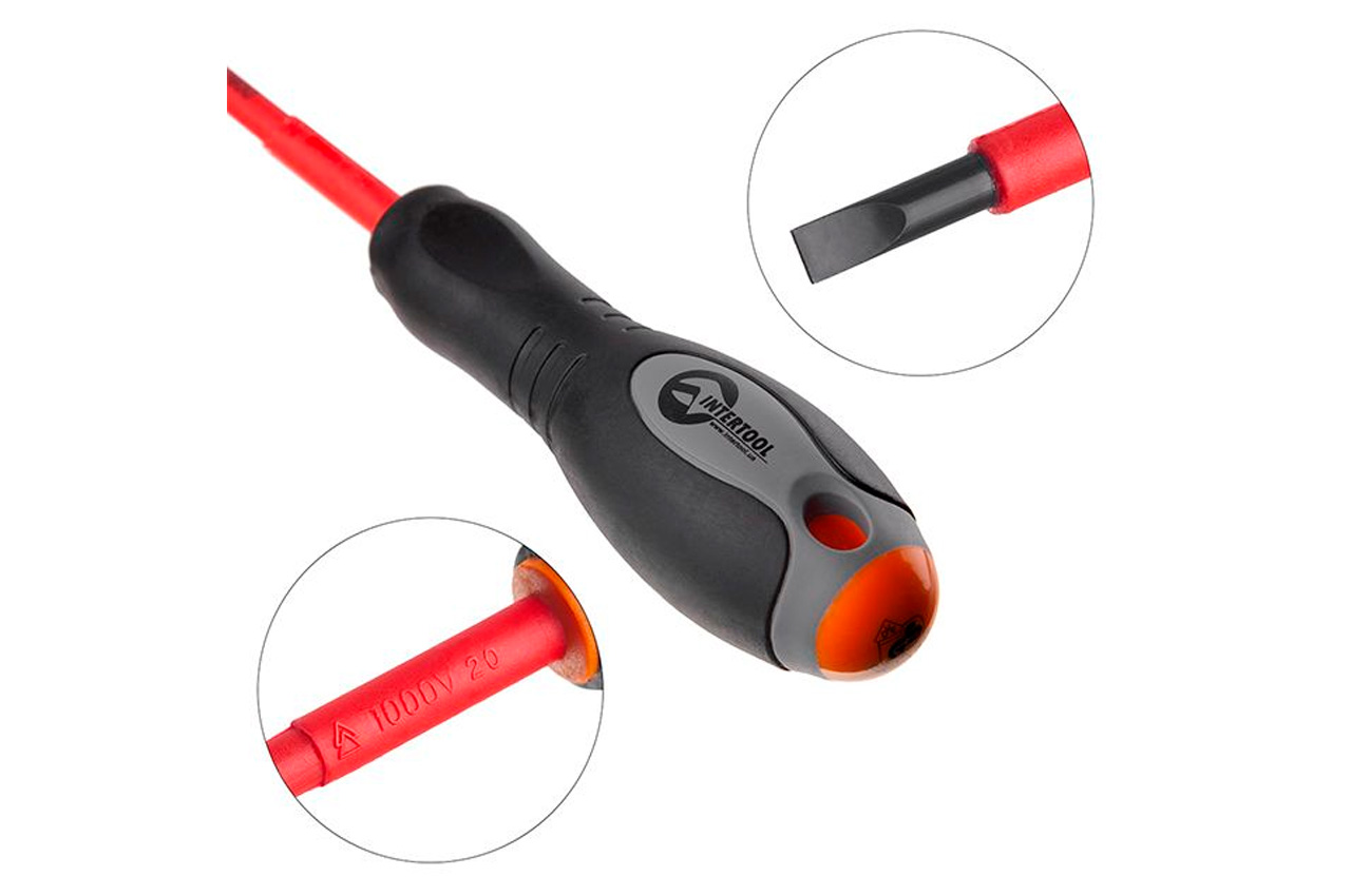Отвертка шлицевая (плоская) предназначена для монтажа и демонтажа деталей и элементов конструкций, находящихся под напряжением до 1000 В. Имеет оснащенный изоляционным покрытием стержень и противоскользящую рукоятку.