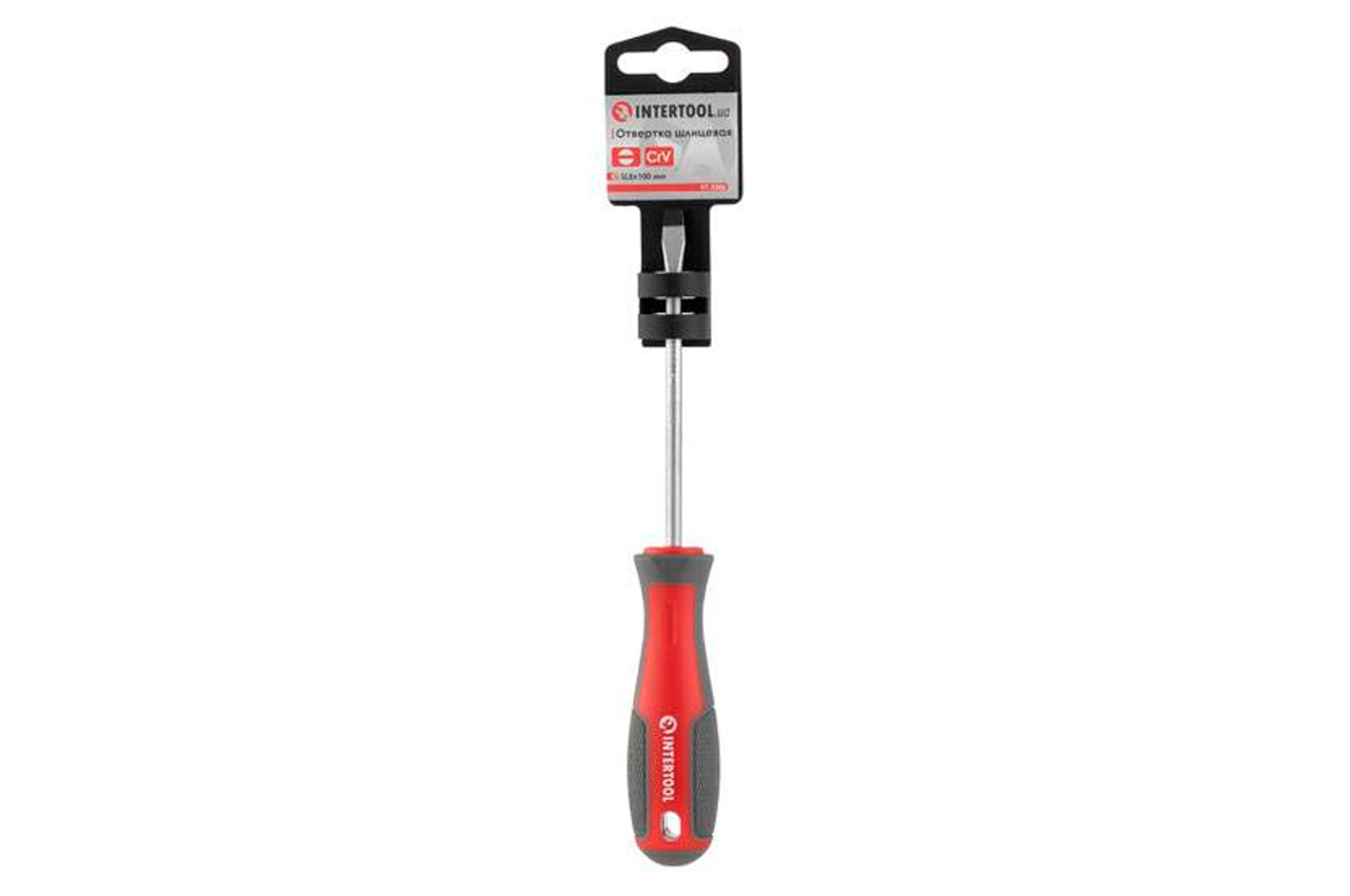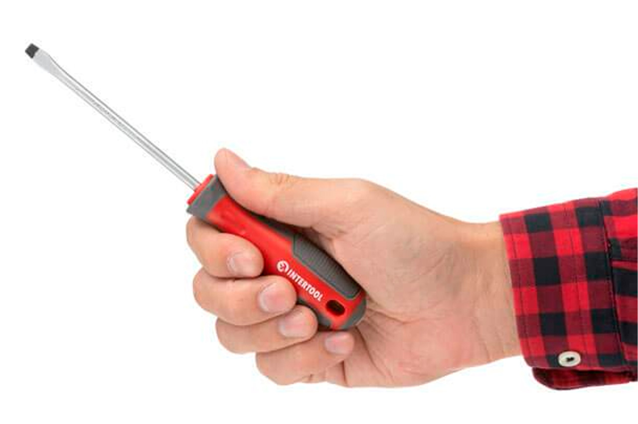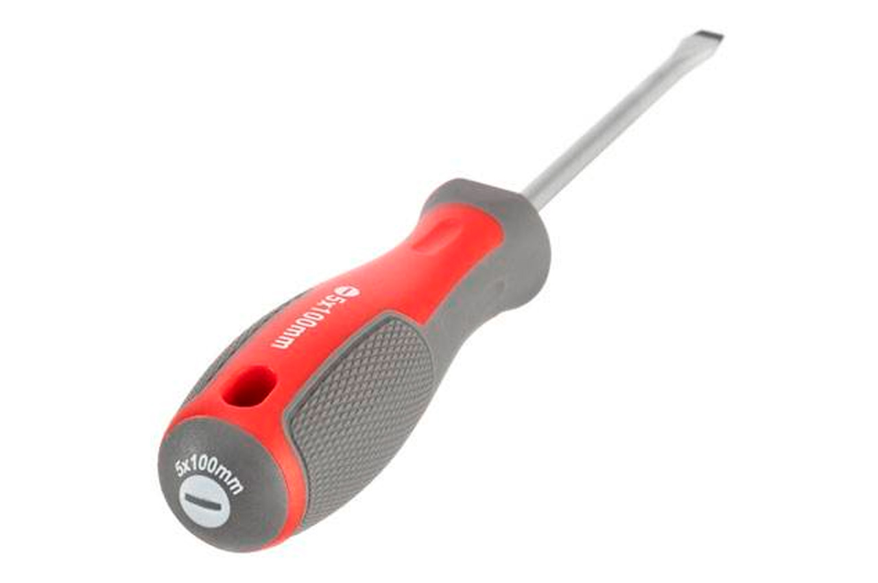 Отвертка изготовлена по последним технологиям и соответствует высоким запросам мастеров. Предназначена для монтажа и демонтажа резьбовых соединений с типом шлица SL5. Такая отвертка станет отличным помощником в домашнем арсенале инструмента, а также в собственной мастерской, на производстве. Высокое качество стали Стержень отвертки изготовлен из прочной Cr-V стали, которая известна всем мастерам своей надежностью и выносливостью. В составе этой стали присутствуют хром и ванадий, которые придают изделию высокую стойкость к износу. Также сталь отличается долговечностью и не подвержена хрупкому разрушению. Конструкция отвертки продумана до мелочей Стержень глубоко посажен в рукоятку и крепиться в двух местах, что исключает возможность срыва. Намагниченный наконечник Отвертка имеет усиленный магнитный наконечник, который удерживает крепеж и облегчает работу в труднодоступных местах. Удобная рукоятка Форма ручки обеспечивает максимальную эффективность от приложенного усилия. Прорезиненная двухкомпонентная рукоятка удобно лежит в руке и не выскальзывает из ладони. Яркая маркировка на конце позволяет быстро найти необходимый тип и размер отвертки. Материал стержня отвертки: Cr-V сталь; Материал рукоятки: двухкомпонентная, прорезиненная; Длина отвертки: 100 мм