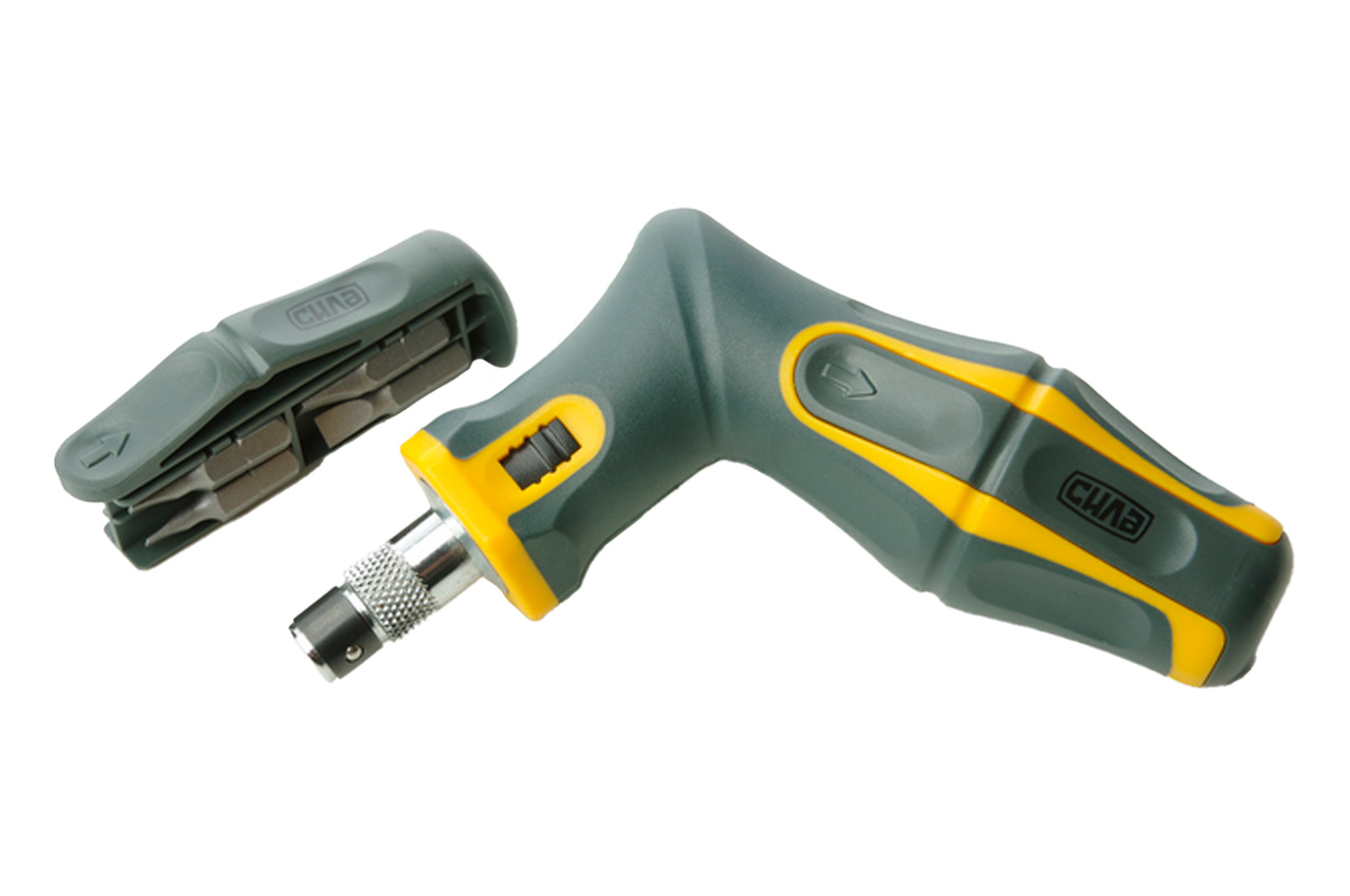 Отвертка изогнутая силовая c реверсом (16 бит). Изготовлена из хромо-ванадиевой стали. Магнитный битодержатель. Биты: PH0, PH1, PH2, PH3, SL3, SL4, SL5, SL6, PZ0, PZ1, PZ2, PZ3, T10, T15, T20, T25.Отсек для сменных бит в рукоятке.
