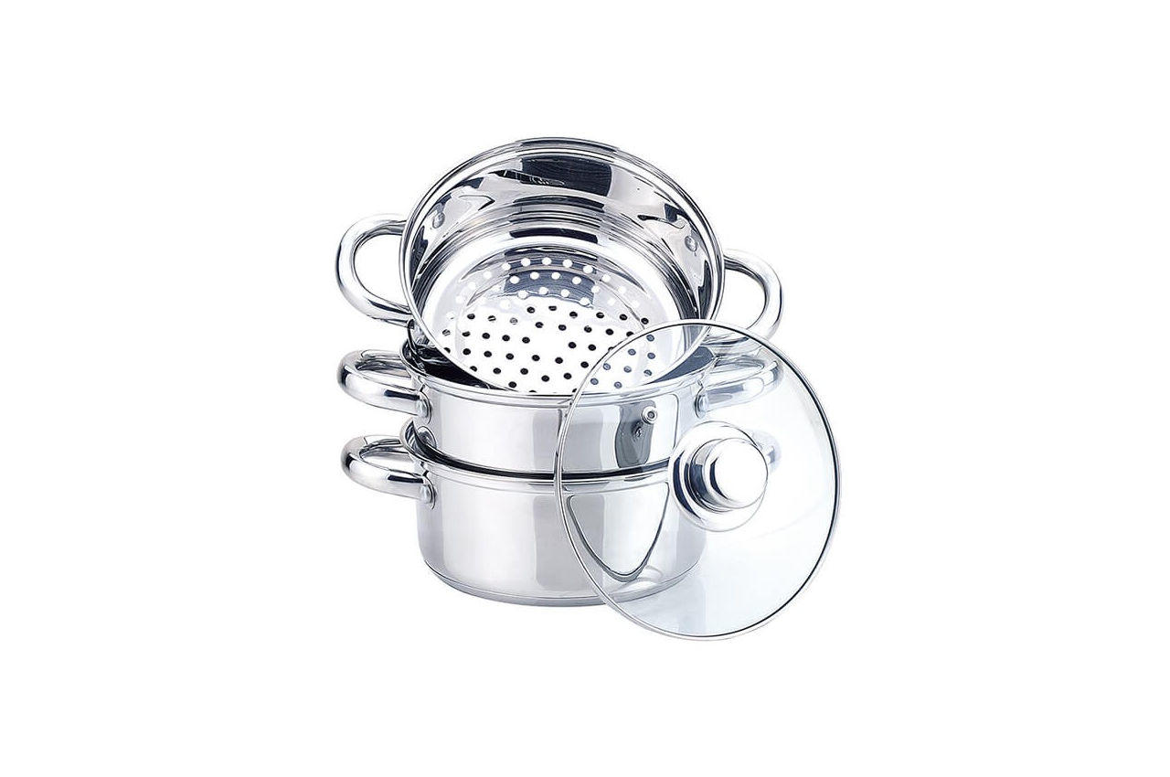 Пароварка из высококачественной нержавеющей стали. Мнослойное термоаккумулирующее дно. Стеклянная крышка. Возможно использовать на всех типах плит.