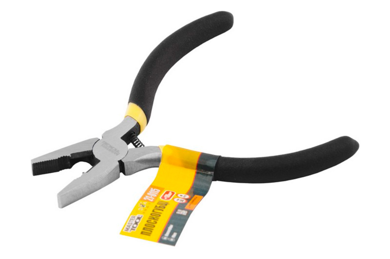 Плоскогубцы длиной 120 мм, изготовленные из высокоуглеродистой стали, Ручки имеют покрытие из термопластичной резины. Рабочие поверхности имеют ребристую насечку и заостренные кромки возле шарнира. Применяются для выполнения слесарных, монтажных и других работ.