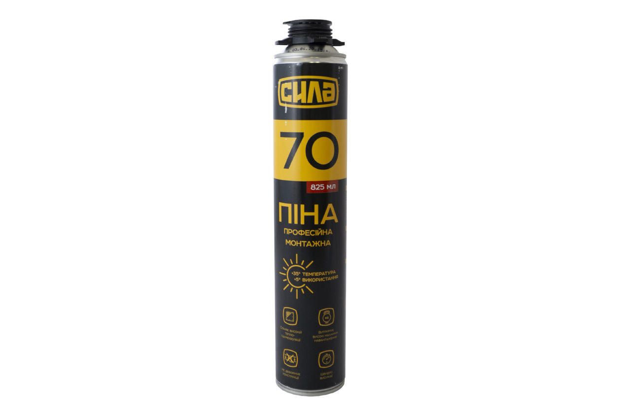 Пена монтажная Сила - 825 мл Pro 699508 это вспененный полиуретановый однокомпонентный герметик, который используется для соединения отдельных элементов между собой, для утепления различных конструкций, для звукоизоляции этих конструкций. Кроме того, монтажная пена, расширяясь, заполняет все щели и трещины. Пена отличается тем, что прекрасно липнет практически к любым материалам.