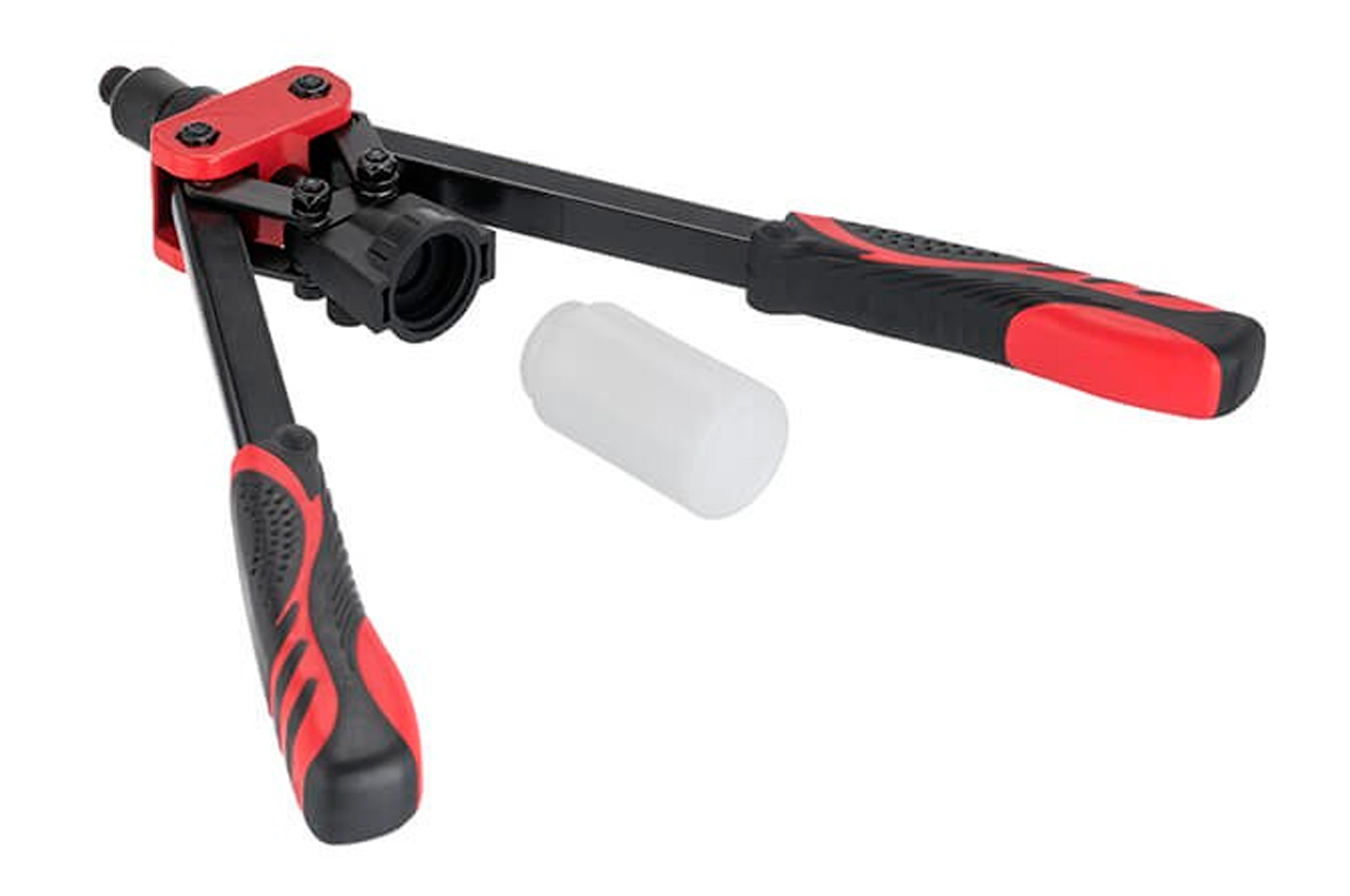 Двухручный заклепник RT-0017 серии STORM предназначен для скрепления любых материалов с помощью вытяжных алюминиевых и стальных заклепок разных диаметров (3,2; 4,0; 4,8 мм). Используется во многих областях деятельности: на строительстве, для ремонта автомобилей и, конечно же, в быту. Заклепник изготовлен из усиленной стали, а три зажимных кулачка выполнены из стали с добавлением хром-молибдена (СrMo), которые увеличивают рабочий ресурс инструмента и способствуют длительному сроку службы. Общая длина заклепника составляет 330 мм. Компактный размер инструмента в сочетании с крепким корпусом из алюминиевого сплава позволяют сохранить небольшой вес и удобство в работе. Заклепник оснащен съемным контейнером для отработанной части заклепки, поэтому ничего не валяется на Вашем рабочем месте и не мешает в работе. Полностью прорезиненные рукоятки с рифленым нанесением обеспечивают надежный захват инструмента и противостоят соскальзыванию даже загрязненных рук. Все насадки оснащены специальными насечками для быстрой и комфортной замены в инструменте.