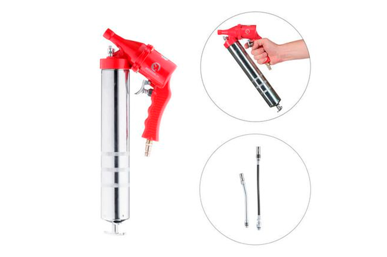 Пистолет для выдавливания смазки пневматический + две насадки. Диаметр шланга: 6-8 мм; Рабочее давление: до 8 атм