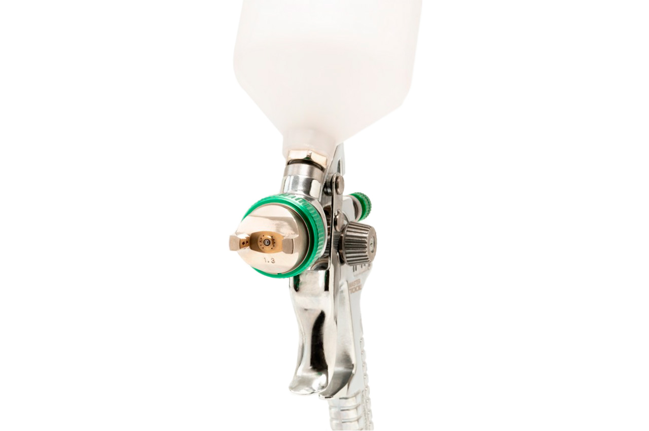 Пневмопистолет HVLP, пластиковый бачок. Применяется для нанесения лакокрасочных материалов, (таких как лак, олифа, краска, грунтовка, глянец, глазурь, эмаль) и клея на поверхности из пластика, металла, дерева, керамики. Используется в строительстве, мебельной промышленности, автомобильном сервисе и т. д.