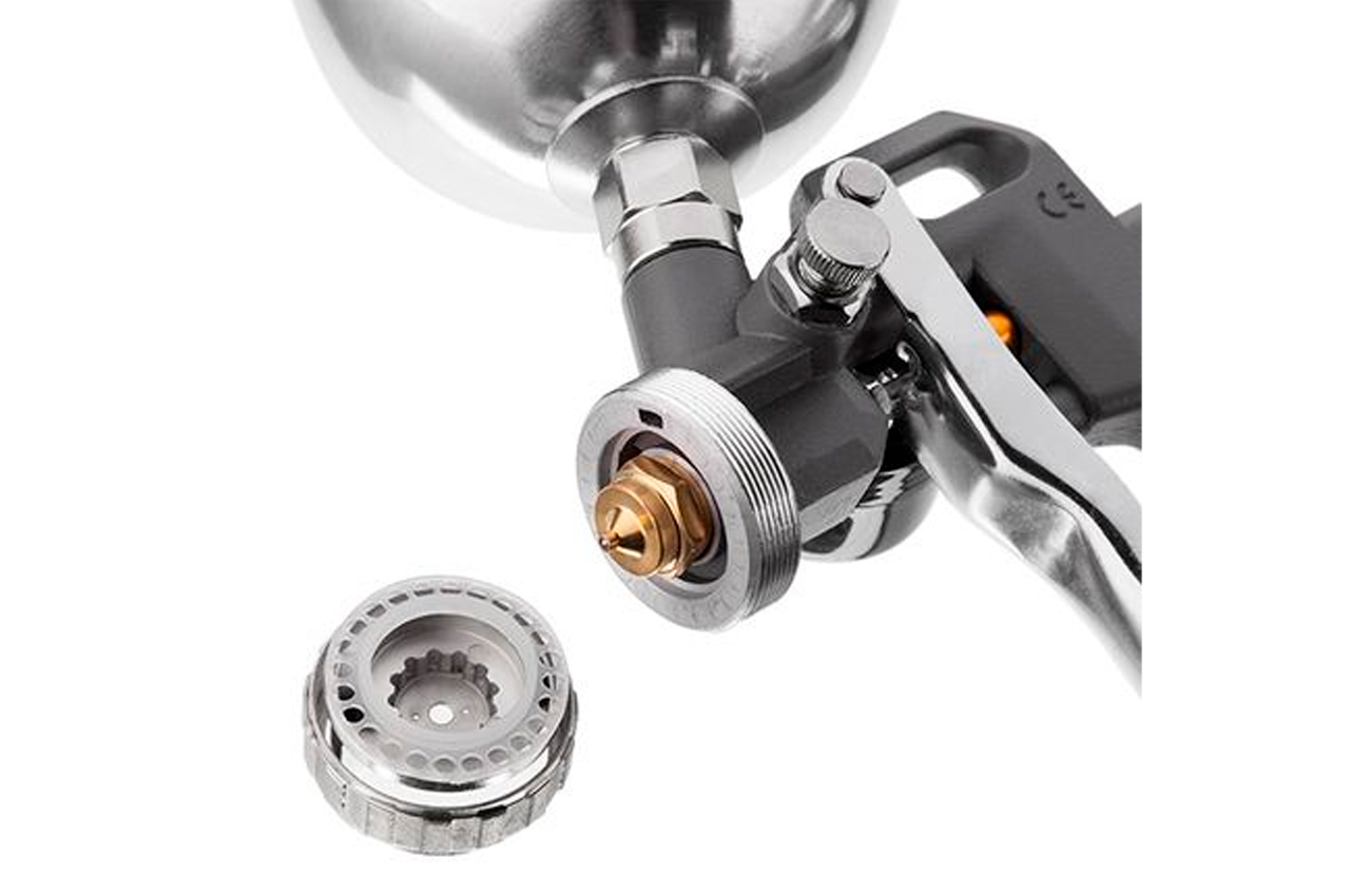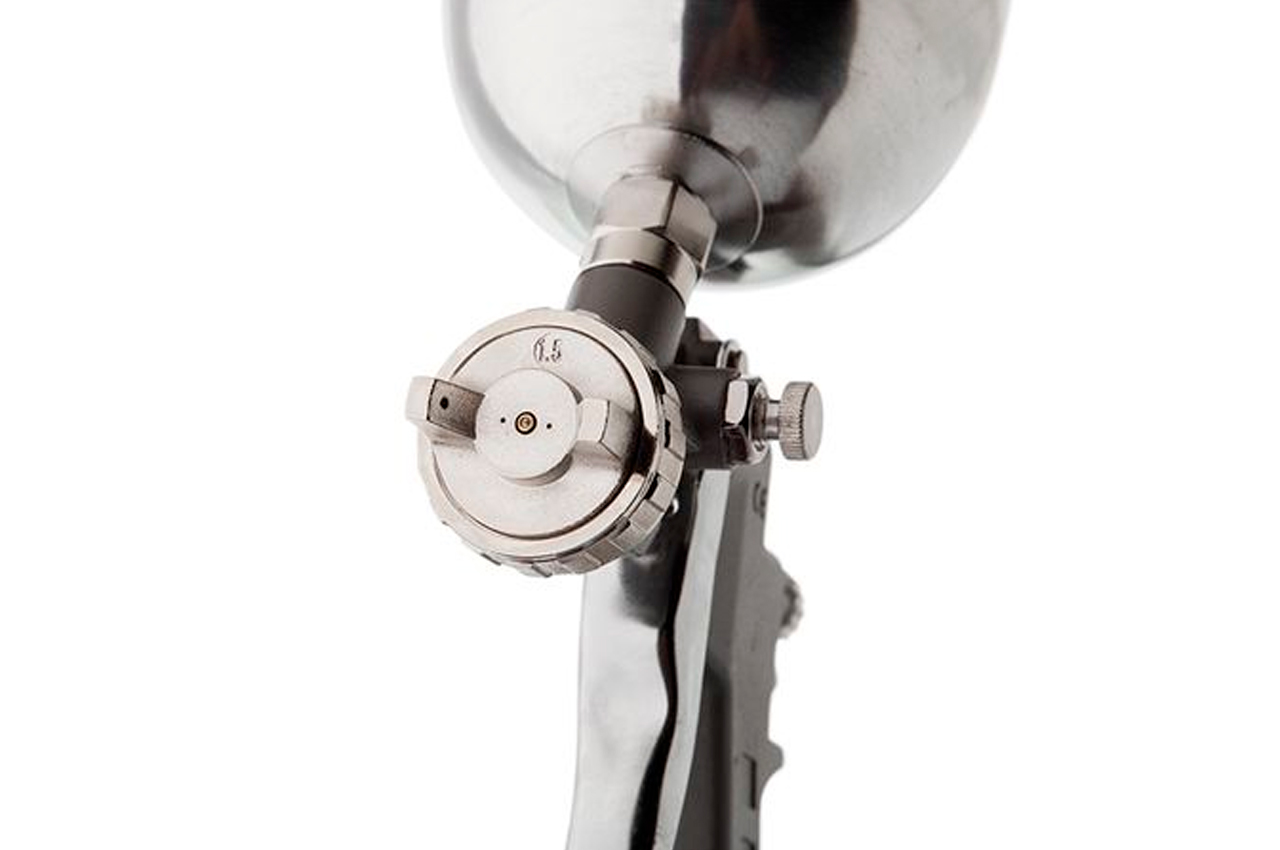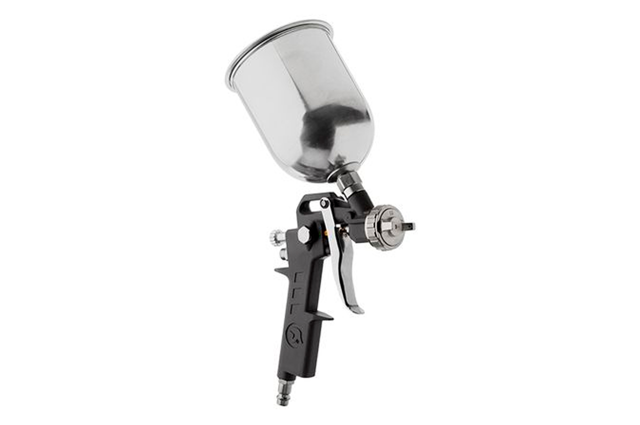 Краскораспылитель пневматический изготовлен с использованием технологии НР (High Pressure высокое давление при малом расходе воздуха). Данный краскораспылитель комплектуется верхним металлическим бачком объемом 600 мл. Размер форсунки составляет 1,5 мм, а расход воздуха 130-190 л/мин. Рабочее давление агрегата достигает 5 атм. Рабочее давление: до 5 атм; Расход воздуха: 130-190 л/мин; Диаметр форсунки: 1.5 мм; Диаметр шланга: 6-8 мм; Объем бачка: 600 мл; Расположение бачка: верхнее; Материал бачка: металл