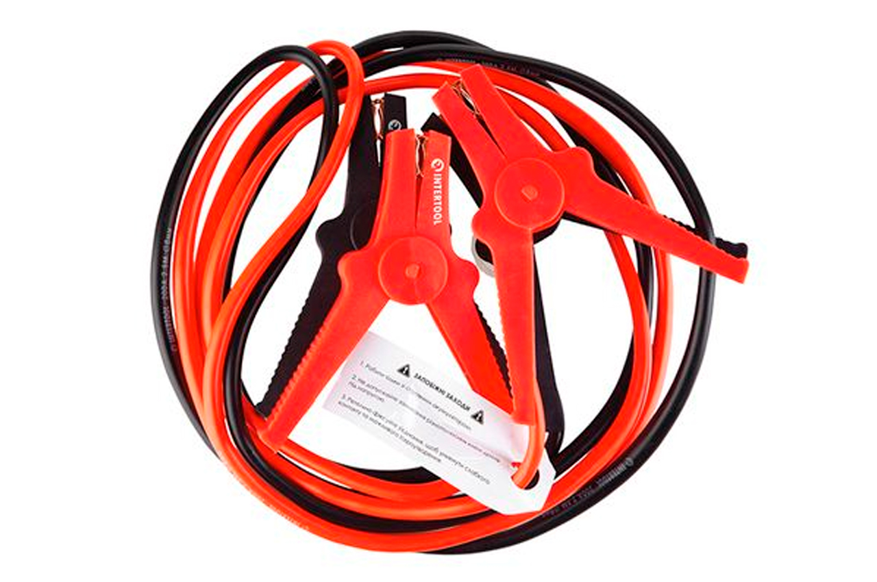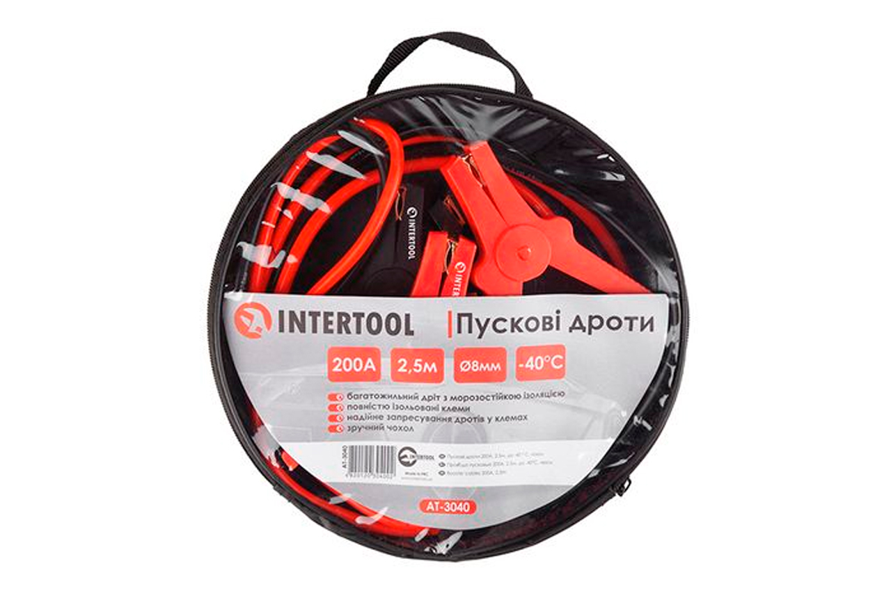 Провод для прикуривания автомобиля AT-3040 с техническими параметрами 200А и 2,5 метра от интернет-магазина «Цилиндр» предназначается для запуска двигателя авто с севшим аккумулятором. В комплектации идет два провода черного и красного цвета. Жилы кабеля изготовлены из меди, и покрыты силиконовой изоляцией. Длина проводов по 2,5 метра, а максимальная сила пускового тока, на который рассчитаны кабели, составляет 200 Ампер. Провода имеют быстросъемные зажимы типа «крокодил». Пусковые провода позволяют оперативно осуществить запуск двигателя автомобиля Максимальный ток: 200 А
