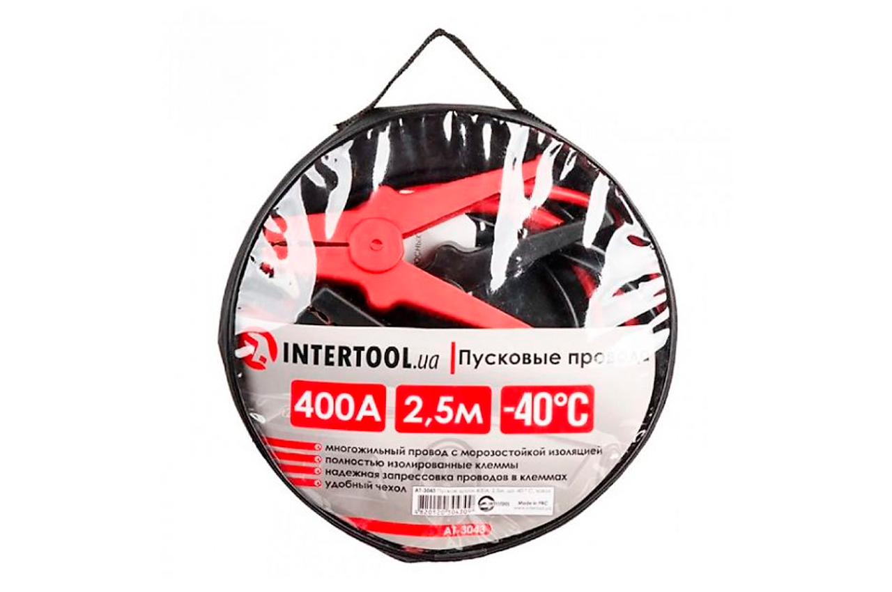 Провод для прикуривания автомобиля с техническими параметрами 400А и 2,5 метра предназначается для запуска двигателя авто с севшим аккумулятором. В комплектации идет два провода черного и красного цвета. Жилы кабеля изготовлены из меди, и покрыты силиконовой изоляцией. Длина проводов по 2,5 метра, а максимальная сила пускового тока, на который рассчитаны кабели, составляет 400 Ампер. Провода имеют быстросъемные зажимы типа «крокодил». Пусковые провода позволяют оперативно осуществить запуск двигателя автомобиля с севшим аккамулятором Максимальный ток: 400 А