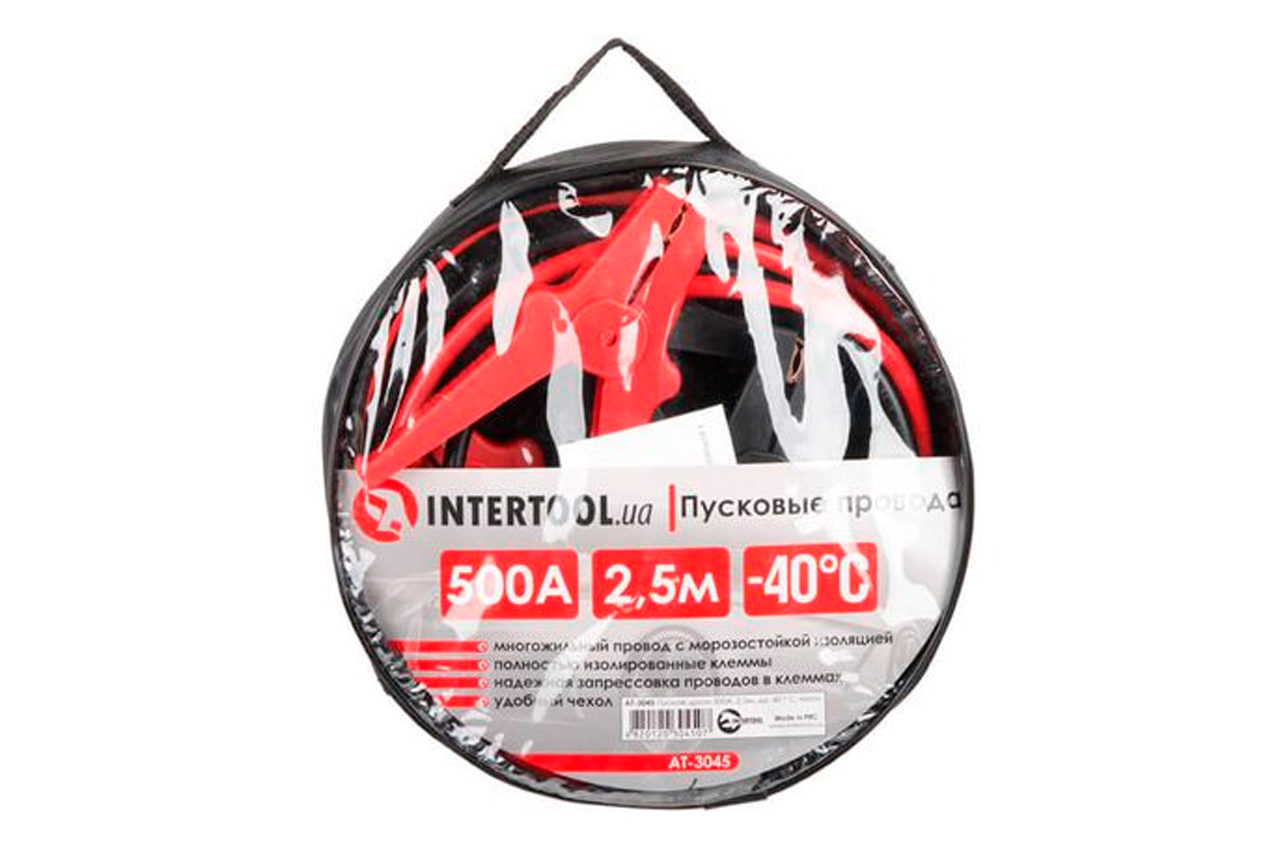 Провод для прикуривания автомобиля с техническими параметрами 500А и 2,5 метра предназначается для запуска двигателя авто с севшим аккумулятором. В комплектации идет два провода черного и красного цвета. Жилы кабеля изготовлены из меди, и покрыты силиконовой изоляцией. Длина проводов по 2,5 метра, а максимальная сила пускового тока, на который рассчитаны кабели, составляет 500 Ампер. Провода имеют быстросъемные зажимы типа «крокодил». Пусковые провода позволяют оперативно осуществить запуск двигателя автомобиля с севшим аккамулятором Максимальный ток: 500 А