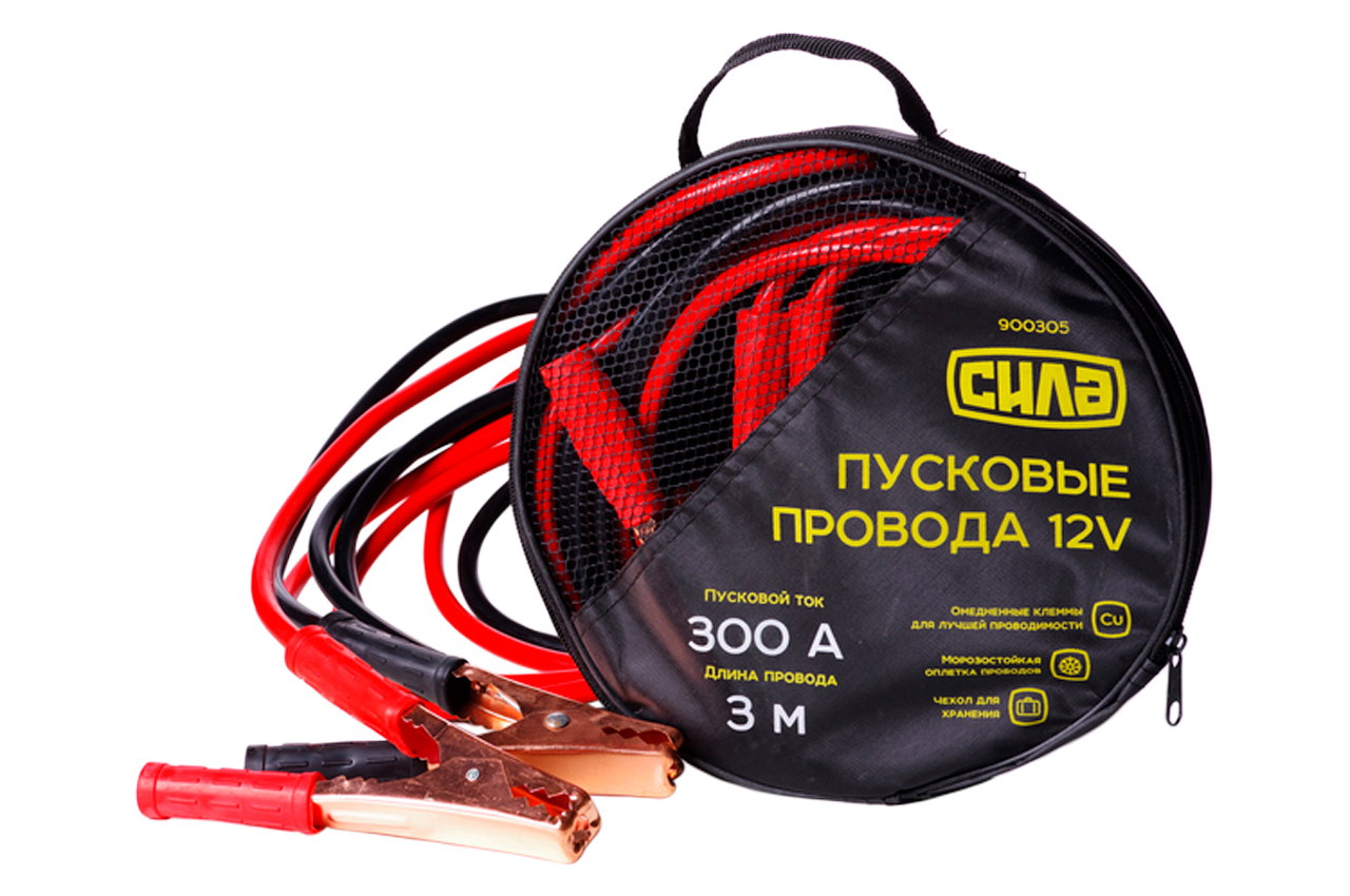 Провода пусковые для прикуривания с расчётом на ток до 300 А. Для запуска авто при недостаточном заряде аккумулятора. Используются медные усиленные крокодилы с плотным обхватом. Материал клемм: Омедненные; Морозостойкость: -25°C; Напряжение: 12 В