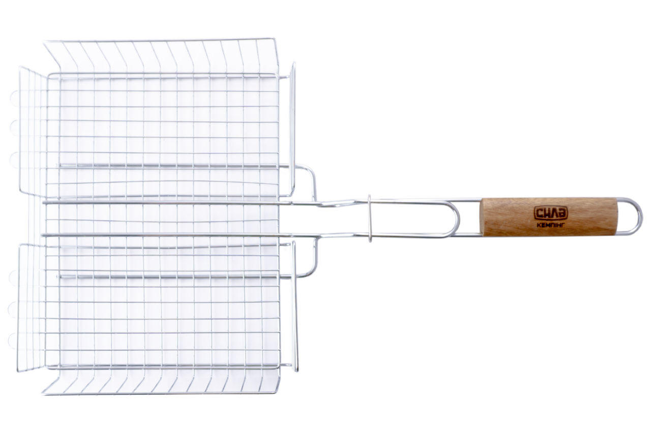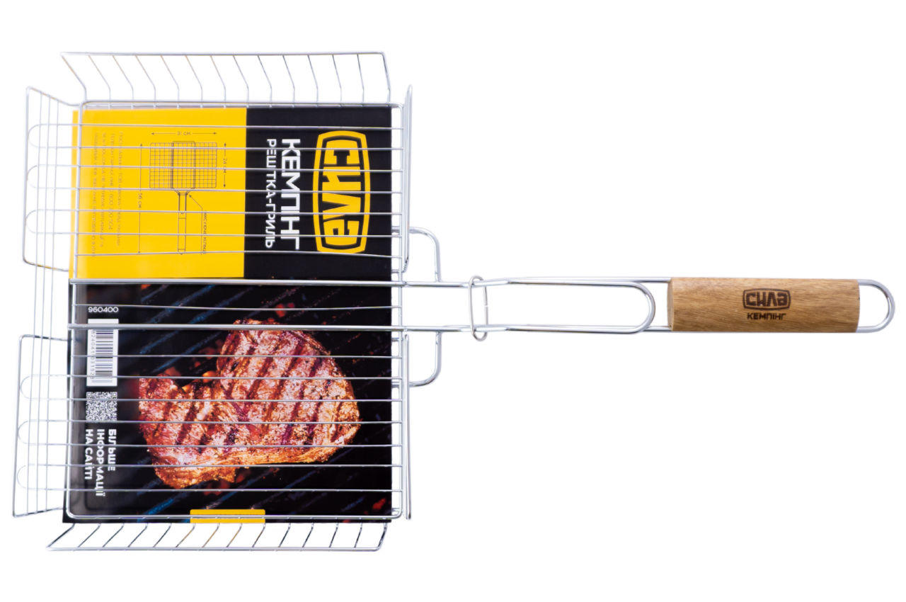 Решетка-гриль Сила - 310 x 240 x 55 мм. С ее помощью можно легко и быстро приготовить мясные стейки, рыбу и овощи на открытом огне. Удобная ручка с деревянной вставкой не нагревается. Благодаря надежной фиксации и прижиму продукты прожаривается равномерно, а интересная форма переплетения прутьев придаст очень аппетитный вид готовому блюду.