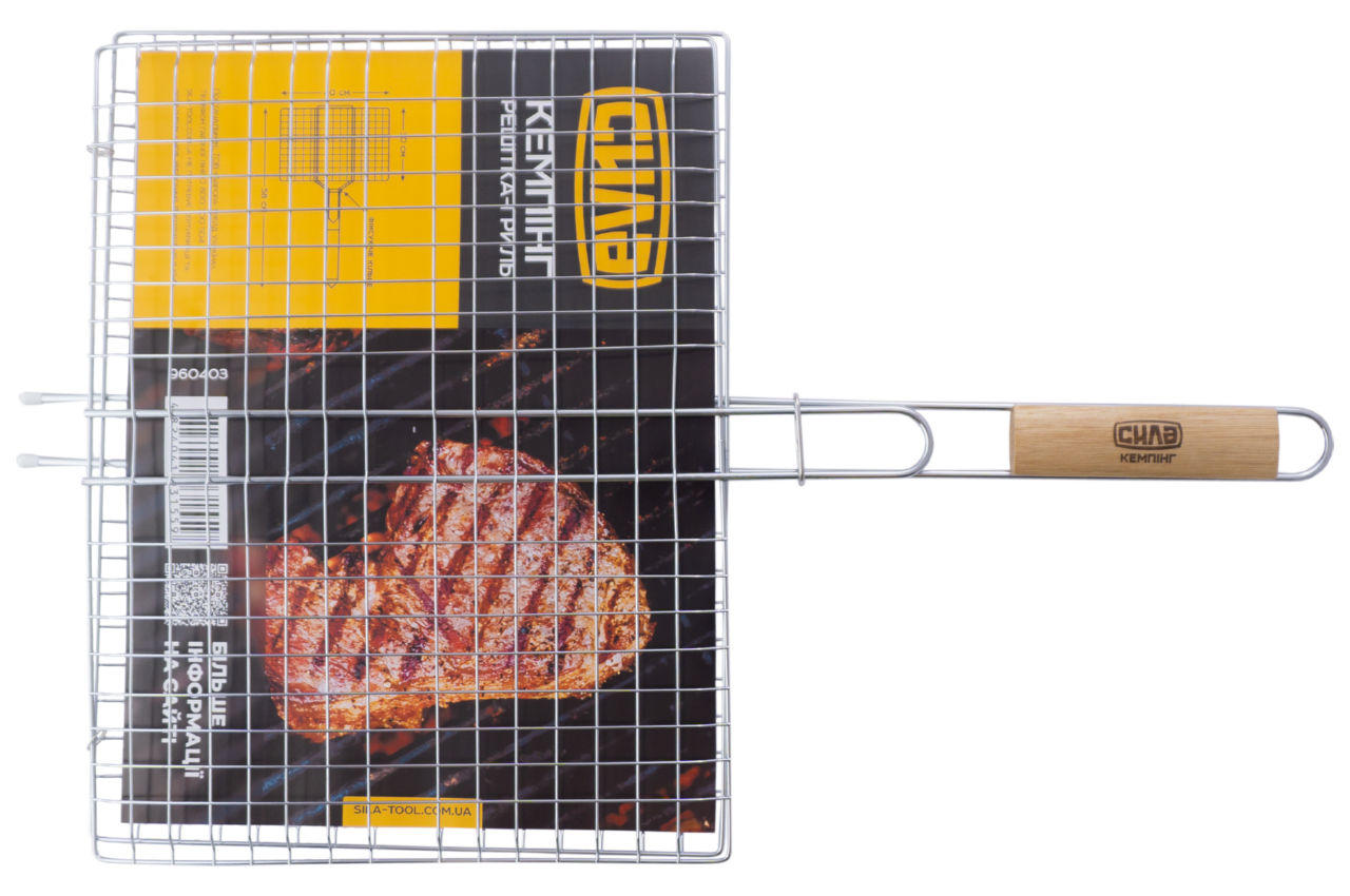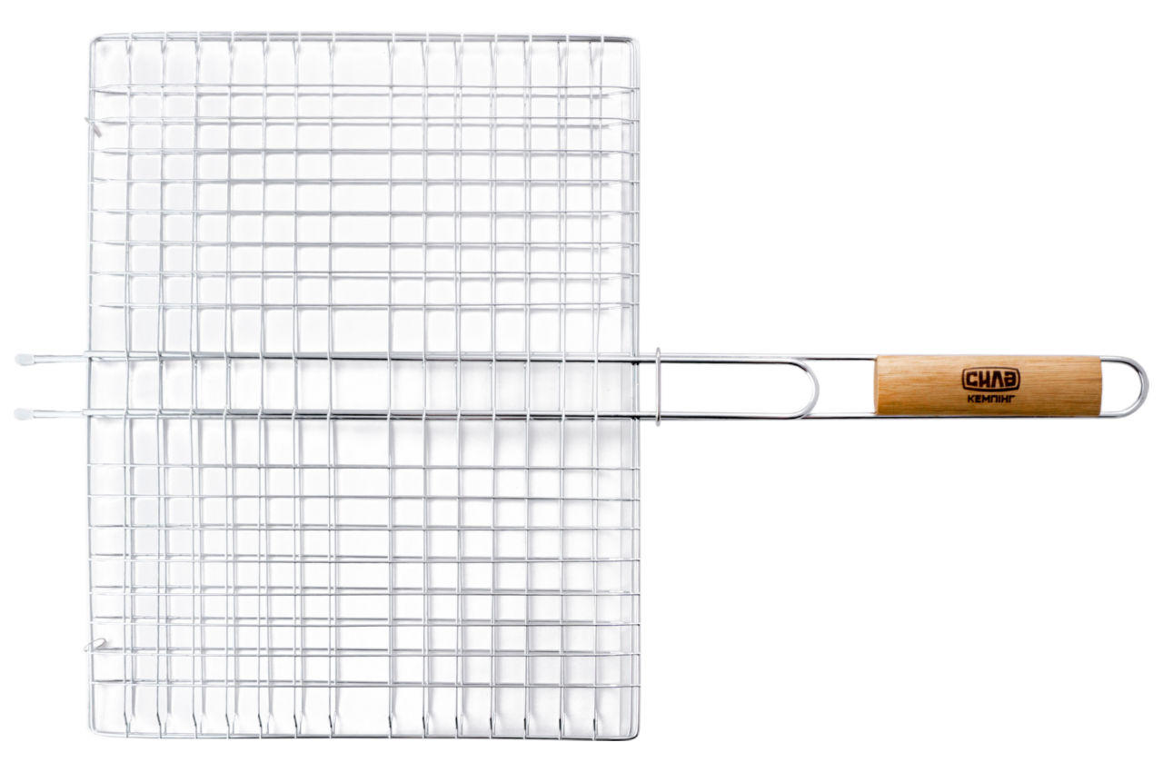 Решетка-гриль Сила - 400 x 300 мм. С ее помощью можно легко и быстро приготовить мясные стейки, рыбу и овощи на открытом огне. Удобная ручка с деревянной вставкой не нагревается. Благодаря надежной фиксации и прижиму продукты прожаривается равномерно, а интересная форма переплетения прутьев придаст очень аппетитный вид готовому блюду.