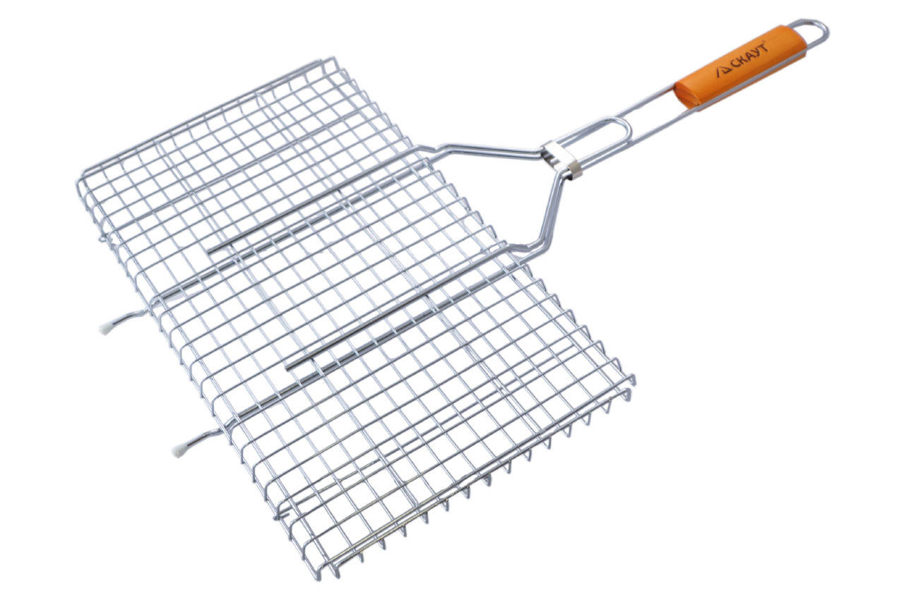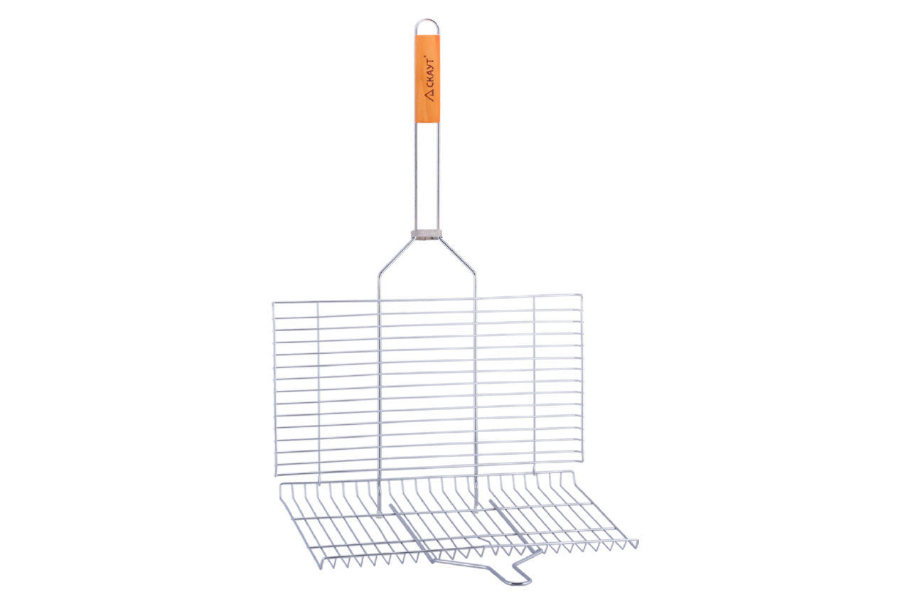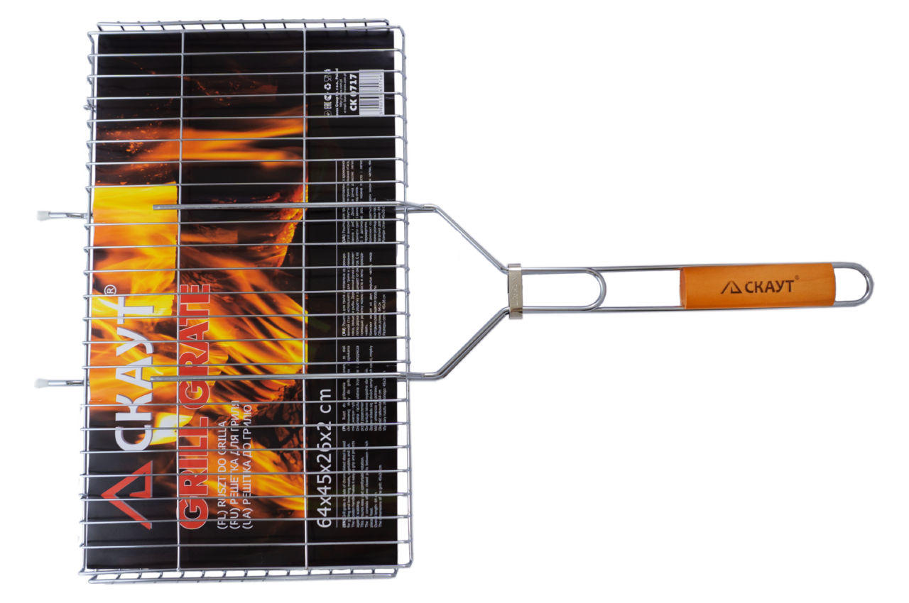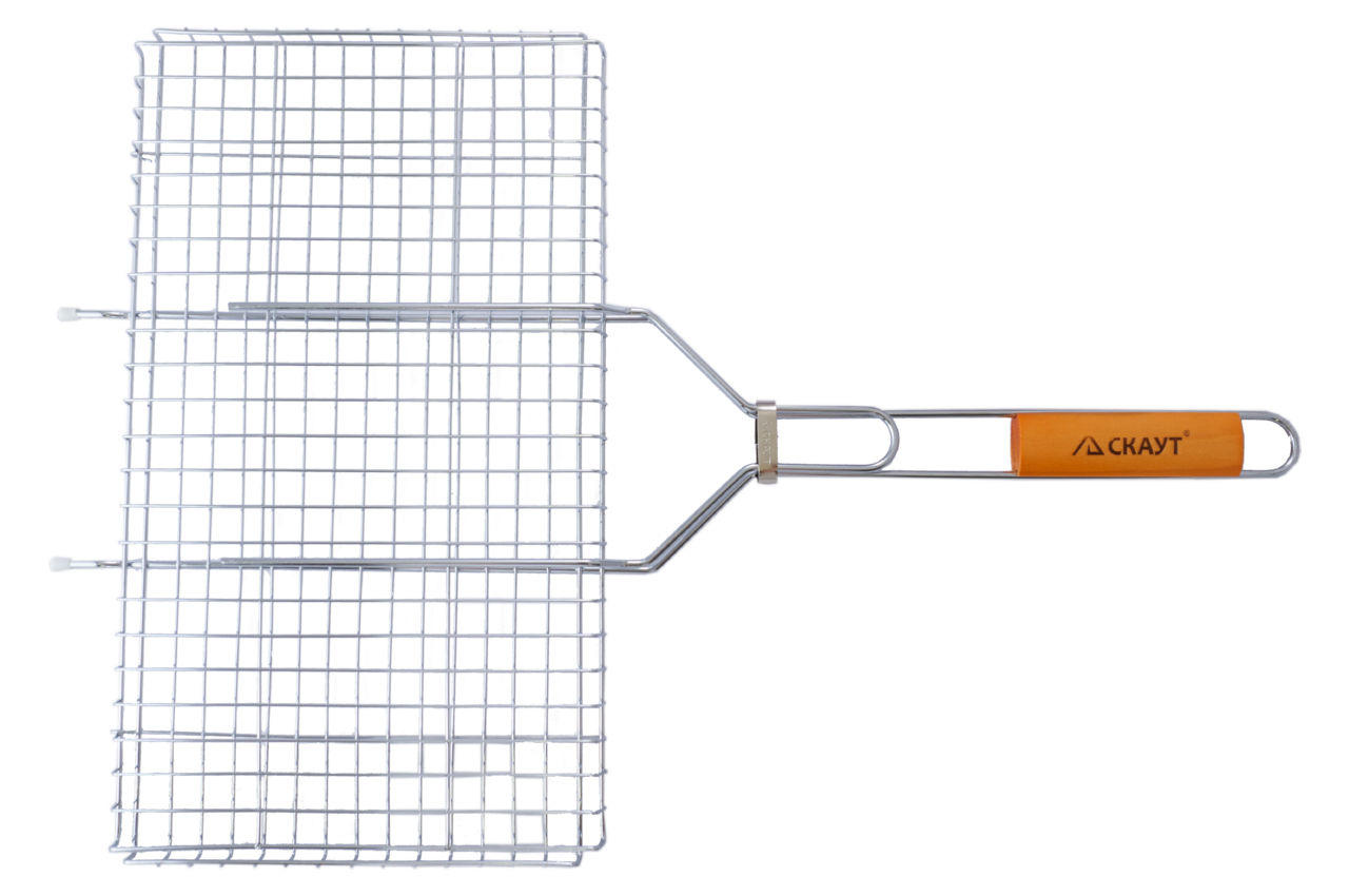 Решетка-гриль Скаут - 450 x 260 x 20 мм это двойная стальная решетка покрытая хромом, предназначенная для запекания курятины. Данная сетка специально создавалась для приготовления мяса курицы или другой птицы. Конструкция решетки изготовлена из нержавеющей хромированной стали, поэтому она защищена от воздействия высоких температур и прутья не поддаются деформации. Она также не выделяет вредные вещества при жарке.