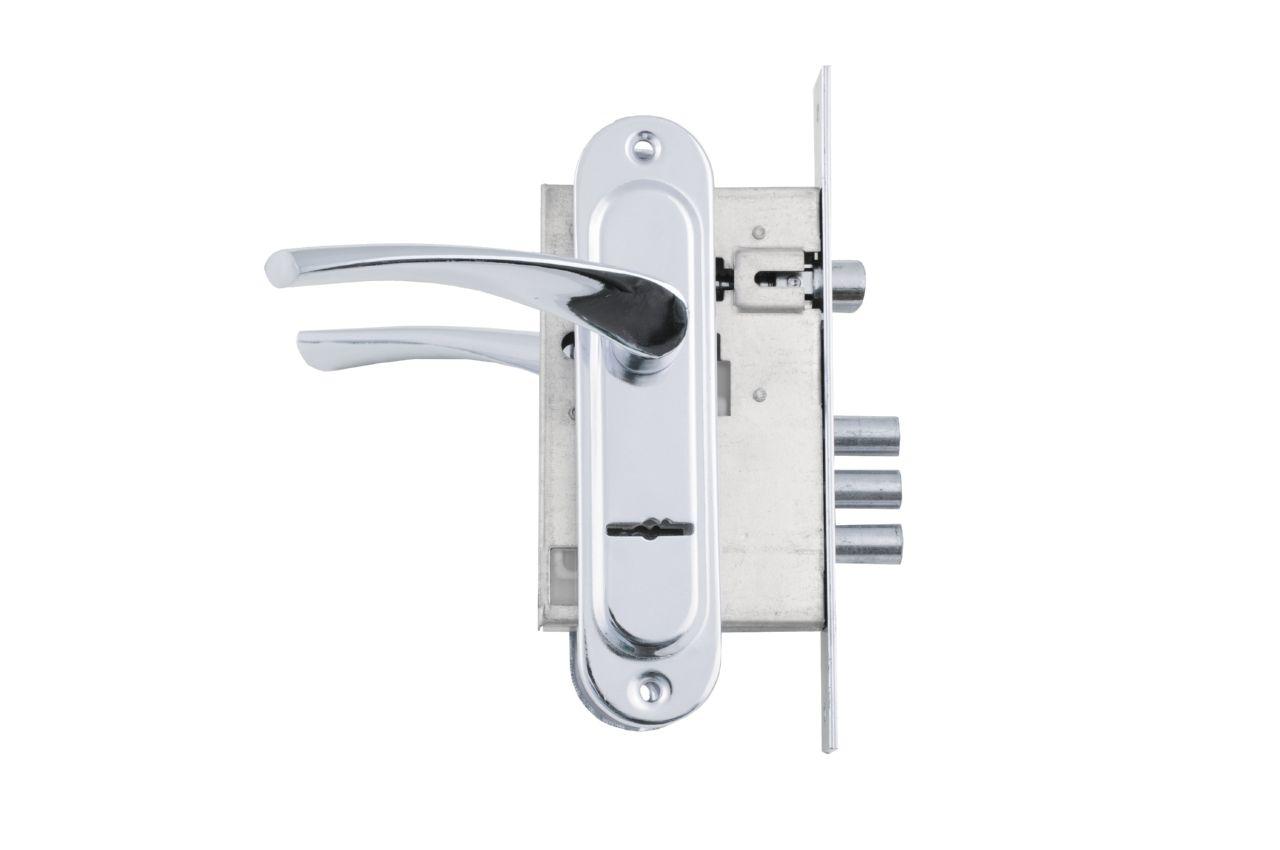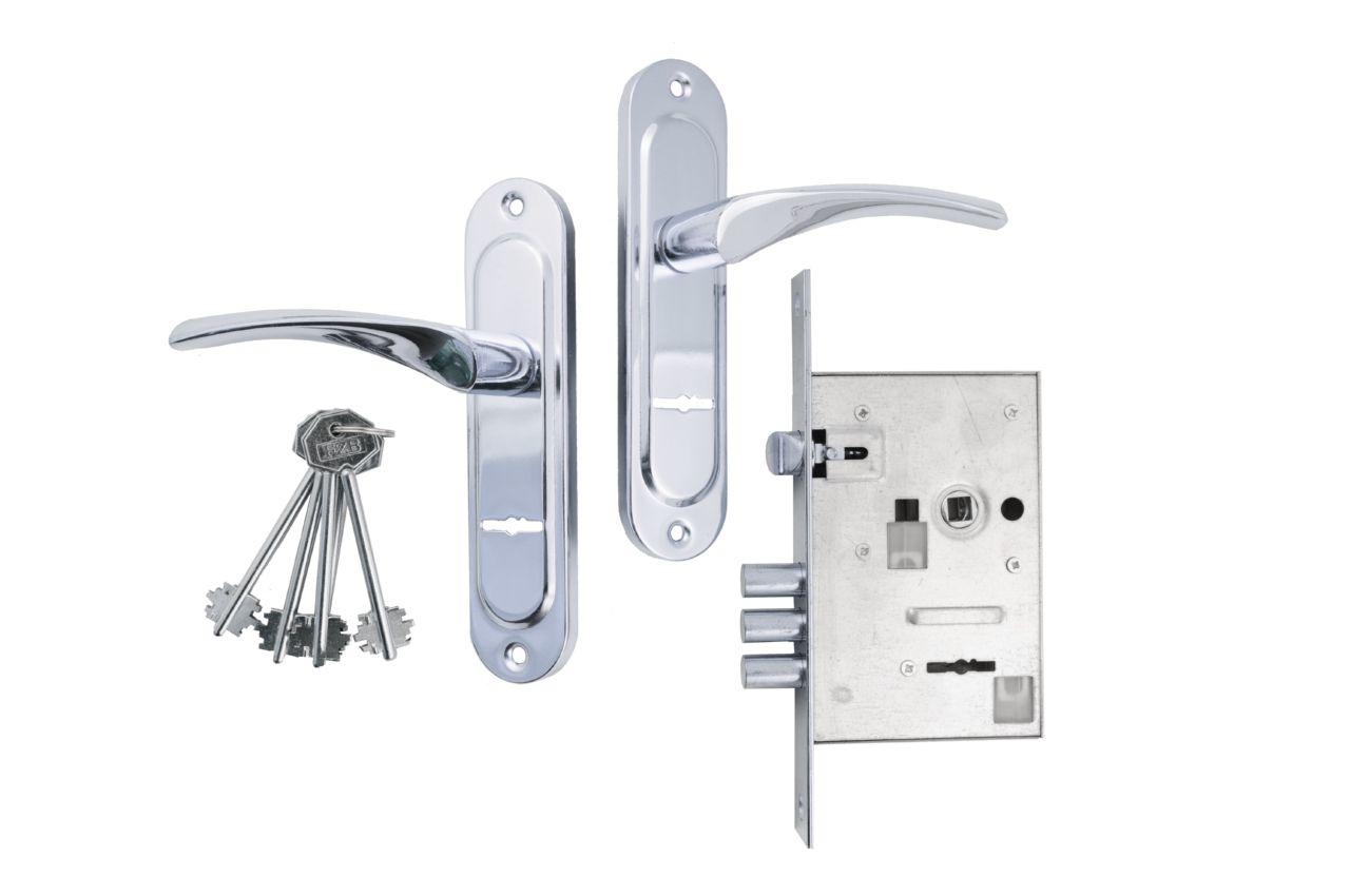 Комплект фурнитуры, включающий в себя дверные ручки на планке, врезной замок и комплект ключей. Планка изготовлена из прочного металла, а ручка из алюминия, что обеспечивает долговечность и удобство в использовании. Хромированное покрытие (CP) придает зеркальный блеск и защиту от коррозии, подчеркивая современный стиль двери. Подходит для установки на межкомнатную и входную дверь.