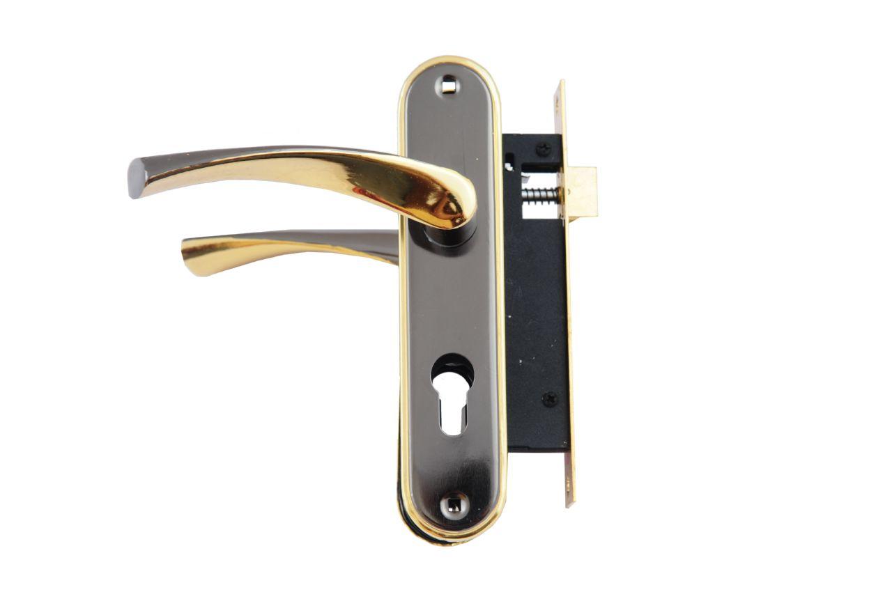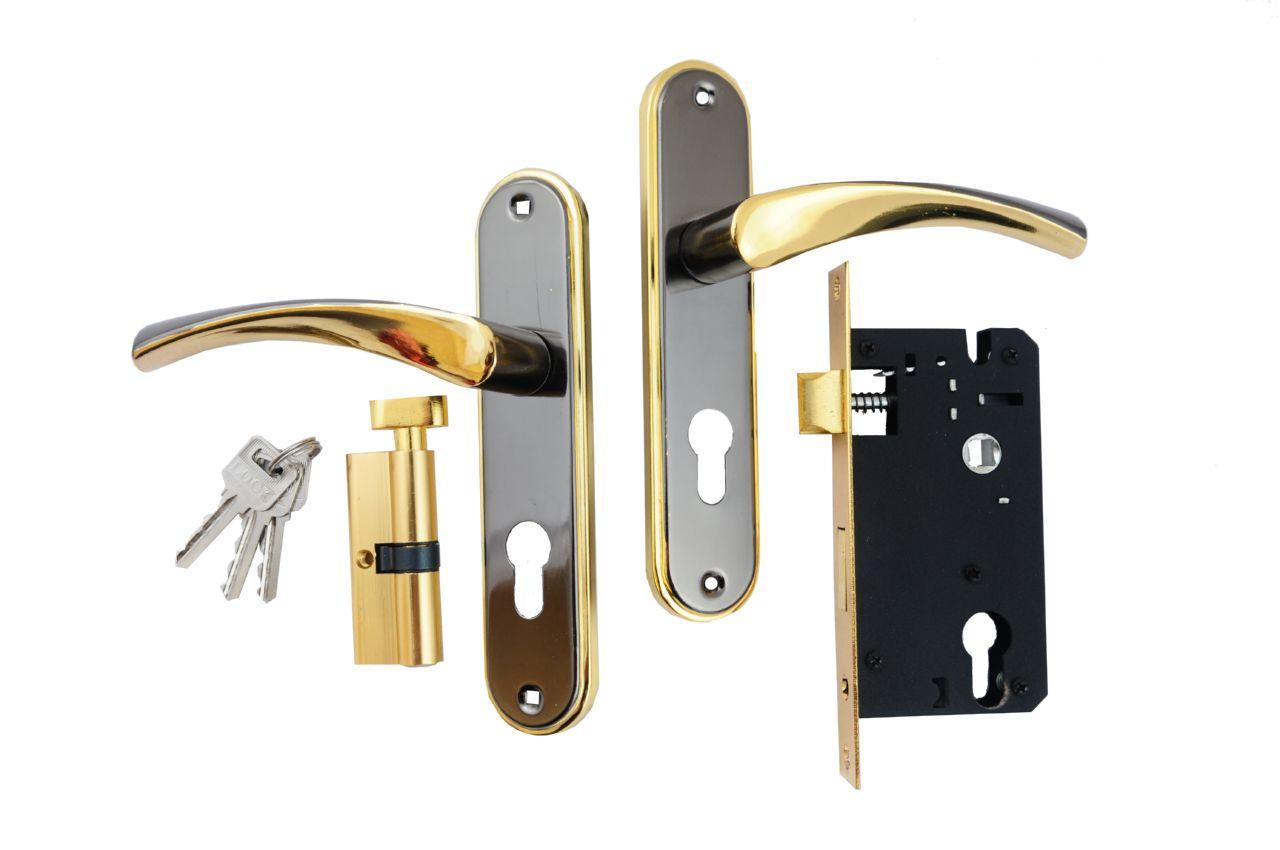 Ручка дверная на планке с корпусом замка и секретом (3 ключа). Ручка - алюминий. Планка - металл. Межосевое расстояние - 58мм.