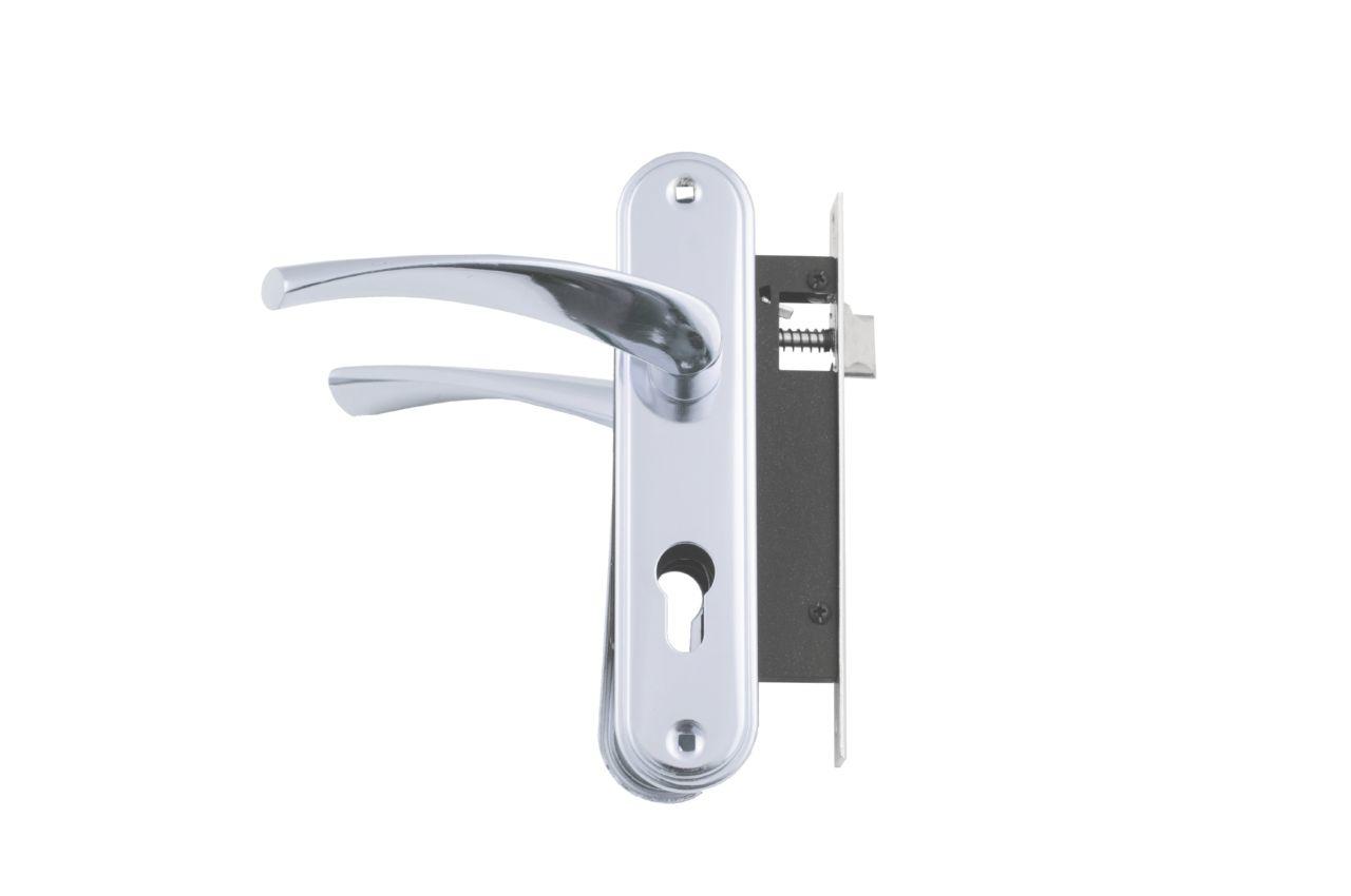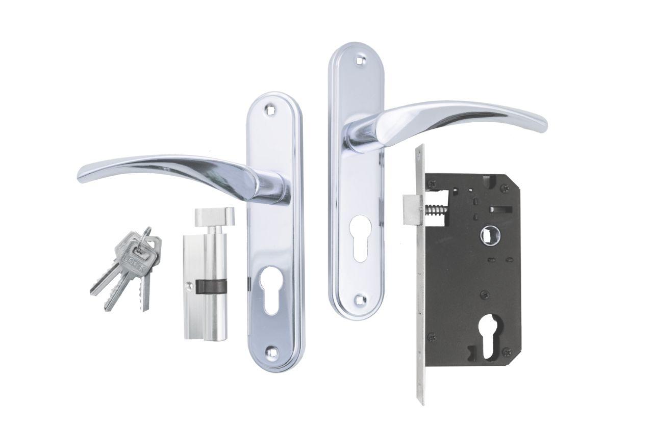 Ручка дверная на планке с корпусом замка и секретом (3 ключа). Ручка - алюминий. Планка - металл. Межосевое расстояние - 58мм.