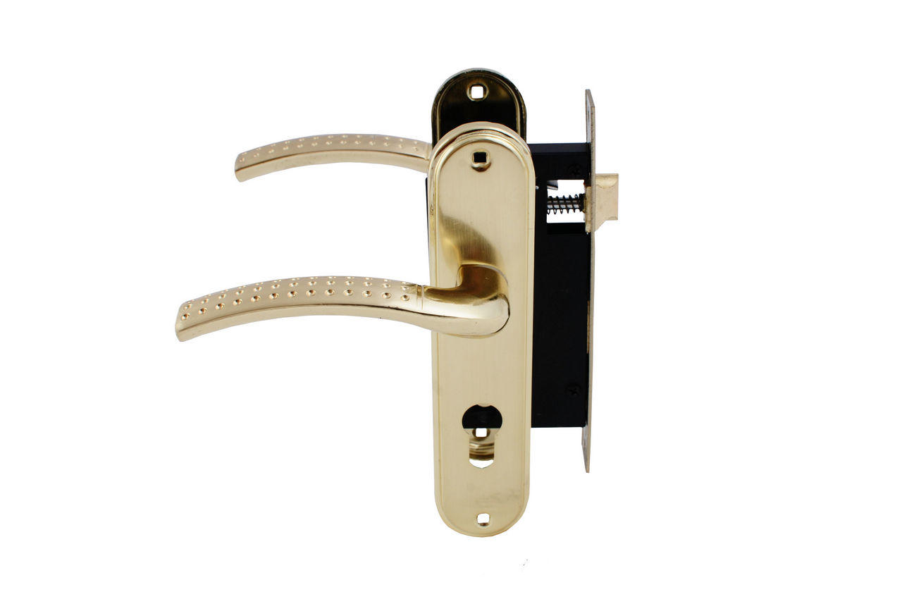 Ручка дверная на планке с корпусом замка и секретом (3 ключа). Ручка - алюминий. Планка - металл. Межосевое расстояние - 58мм.
