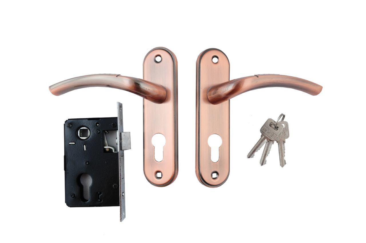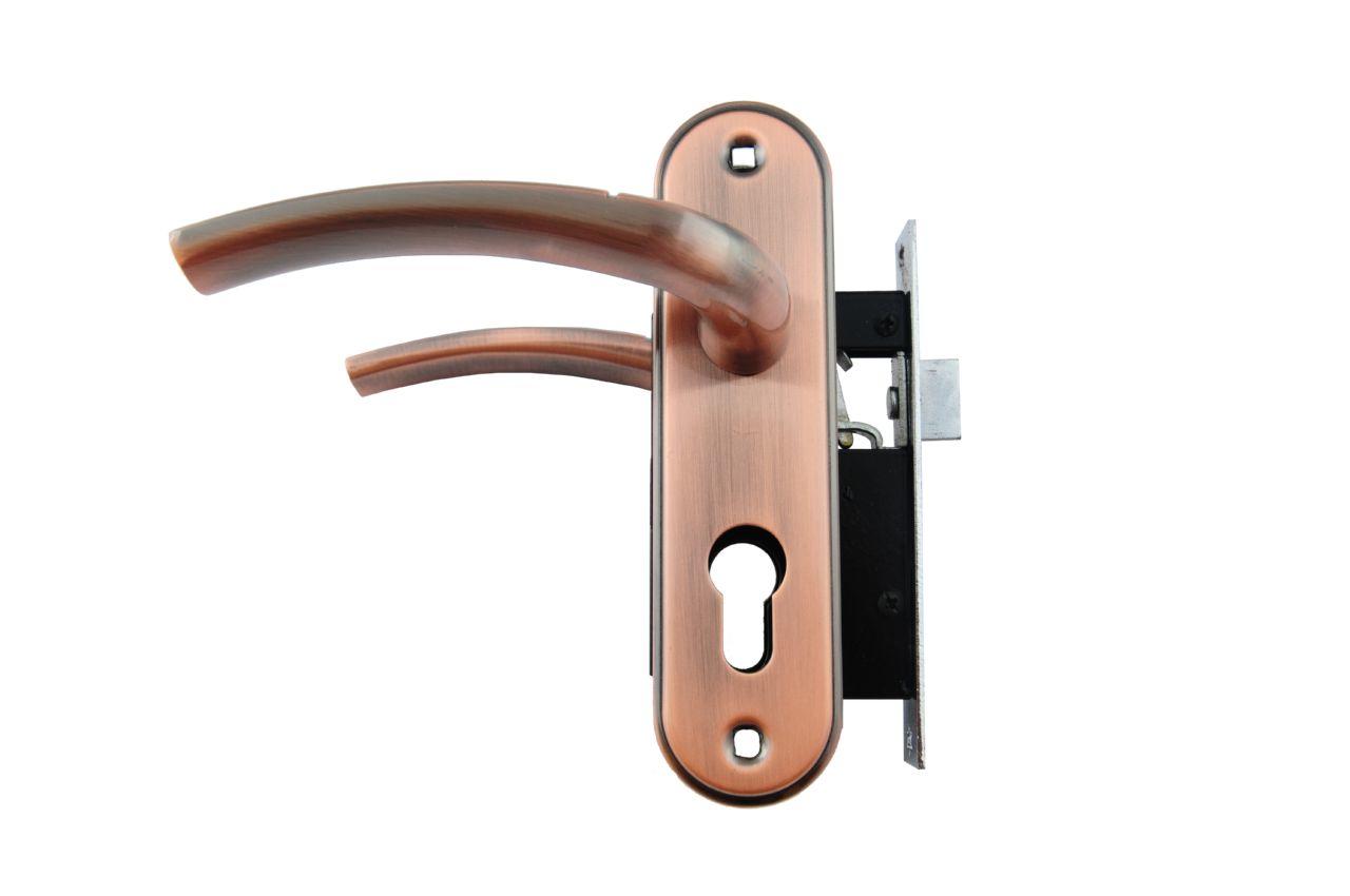 Ручка дверная на планке в комплекте с врезным замком под цилиндр. Материал: металл-планка/алюминий-ручка.