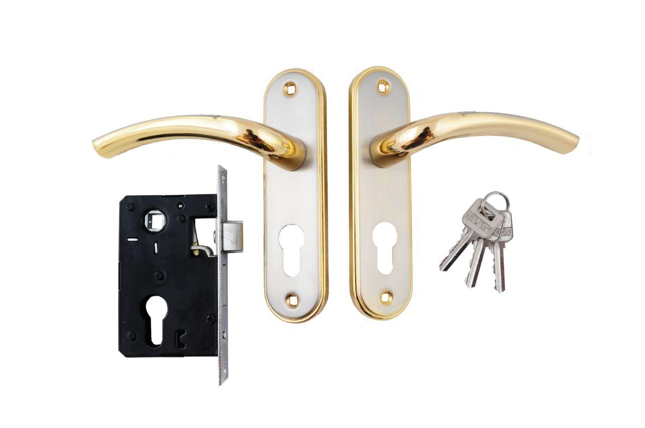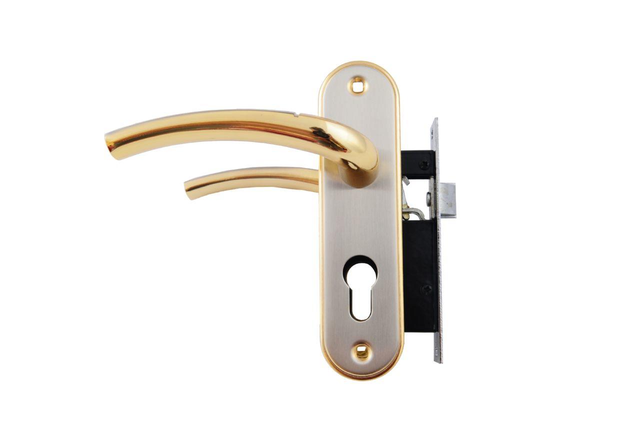 Ручка дверная на планке в комплекте с врезным замком под цилиндр. Материал: металл-планка/алюминий-ручка.