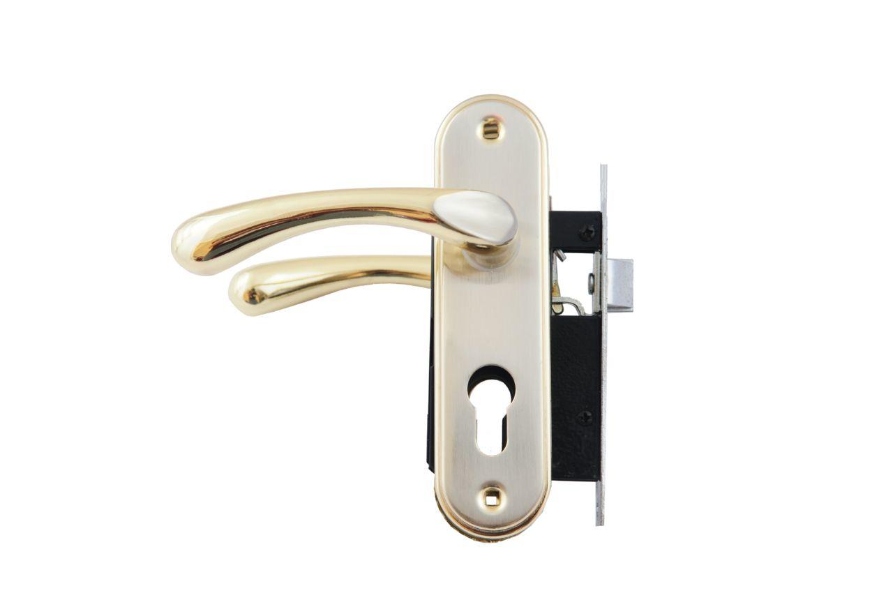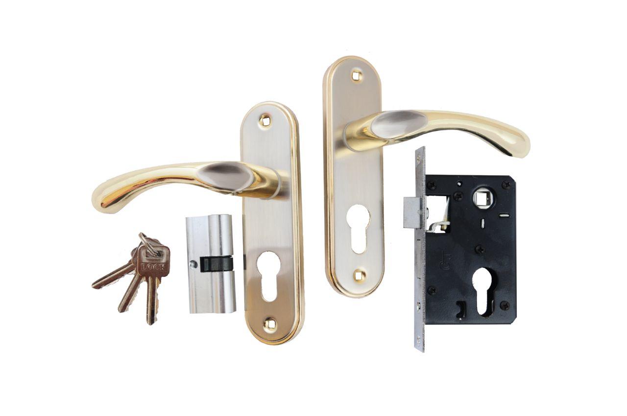 Ручка дверная на планке в комплекте с врезным замком под цилиндр. Материал: металл-планка/алюминий-ручка.