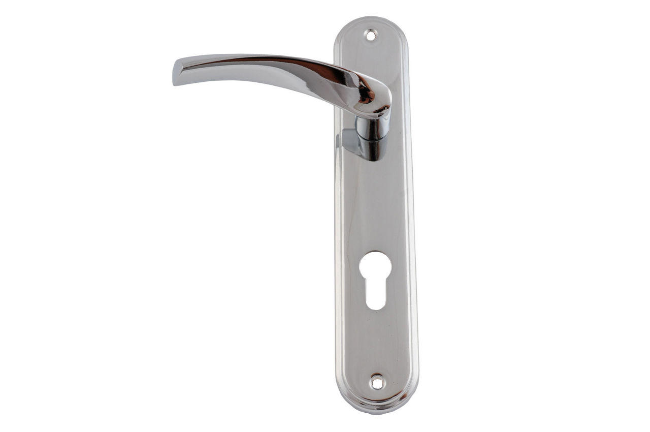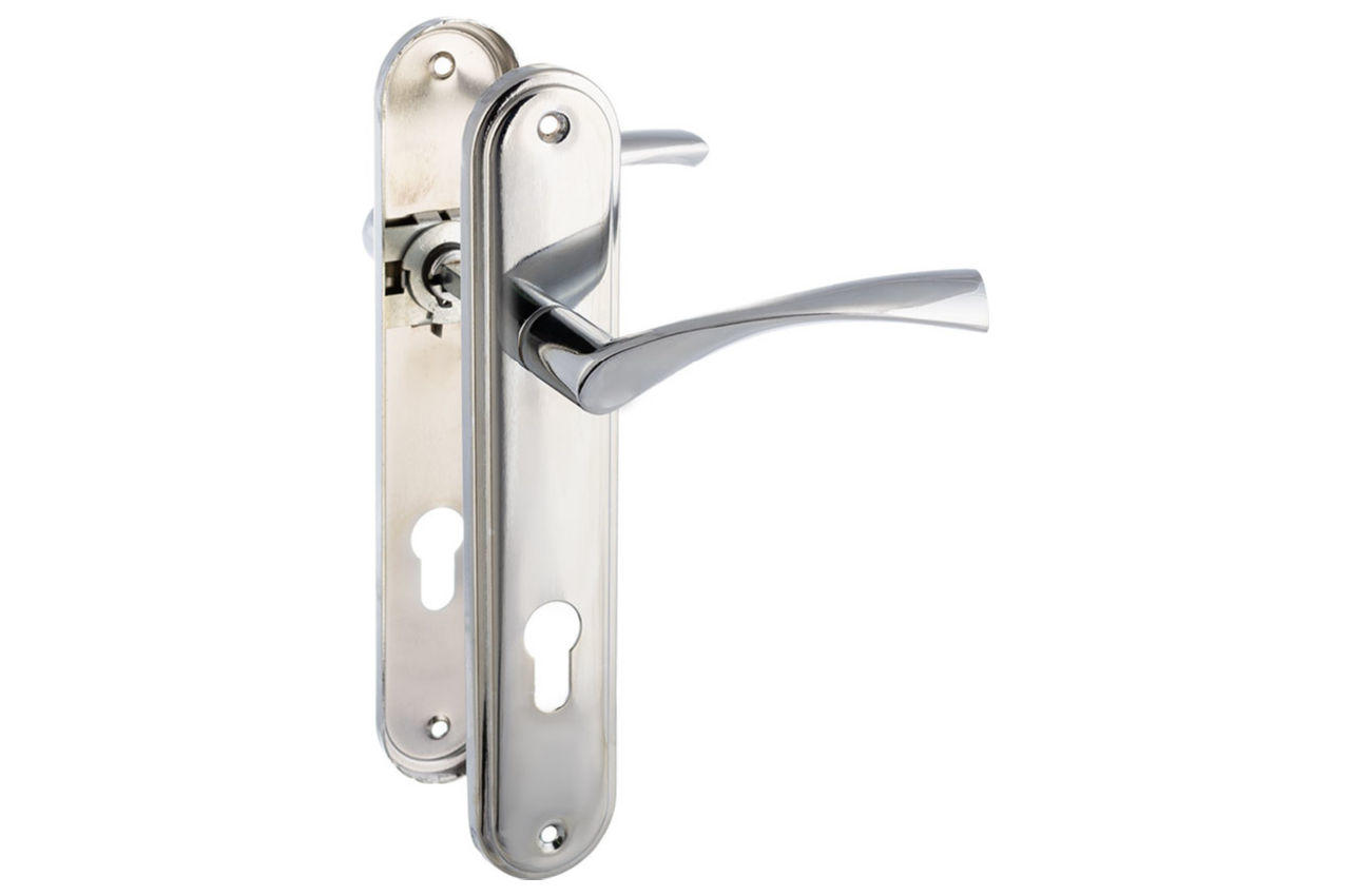 Дверная межкомнатная ручка на планке с отверстием под секрет. Предназначена для установки на межкомнатную дверь и совместима с замками под цилиндр. Планка изготовлена из металла, ручка из цинка, что обеспечивает надежность, прочность и долговечность. Покрытие СР (хром) придает эстетический вид и защищает от царапин и коррозии.