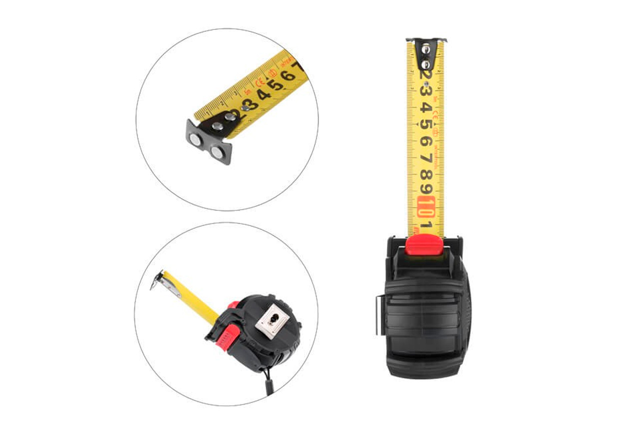 Рулетки STORM – отличное решение для измерения любых величин с высокой точностью. Особенности: Точное измерение величин Долговечность и надежность Простота и практичность в работе Удобная и компактная рулетка MT-0826 с высокой эргономикой идеально лежит в руке. Все элементы выполнены аккуратно из надежных материалов. Корпус изготовлен из ударопрочного ABS-пластика с дополнительными резиновыми вставками. Приятные на ощупь резиновые вставки с ребрами жесткости не позволят рулетке выскользнуть даже из влажных рук, а также уберегут от механических повреждений, т.к. минимизируют ударный шок при падении на любую поверхность. Стальное полотно рулетки имеет нейлоновое покрытие, которое предотвращает появление коррозии и стирание разметки даже при интенсивном использовании. Толщина полотна составляет 0,135 мм, ширина 25 мм, что позволяет использовать рулетку для особо длинных замеров без заломов полотна. Делать замеры такой рулеткой удобно и легко, поскольку кнопки фиксации полотна находятся в близком доступе для пальцев, размещенные сверху и снизу на корпусе. Зацеп на ленте с магнитом, обеспечивает надежное сцепление с металлом во время измерений. Компактные габариты и металлический зацеп позволяют удобно носить инструмент на ремне, а также на запястье во время работы, с помощью тканевого ремешка. Рулетка упакована в пластиковый стенд-блистер. Соответствует европейскому стандарту точности. Выбирайте свой вариант: Артикул Длина ленты, (м) Ширина ленты, (мм) Материал ленты Магнитный зацеп Автостоп Двусторонняя шкала Материал корпуса MT-0823 3 16 сталь да нет нет ABS-пластик MT-0825 5 19 сталь да нет нет ABS-пластик MT-0826 5 25 сталь да нет нет ABS-пластик MT-0828 8 25 сталь да нет нет ABS-пластик Магнитный зацеп: да; Автостоп: нет; Двусторонняя шкала: нет; Длина ленты: 5 м; Ширина ленты: 25 мм; Материал корпуса: ABS-пластик; Материал ленты: сталь с нейлоновым покрытием
