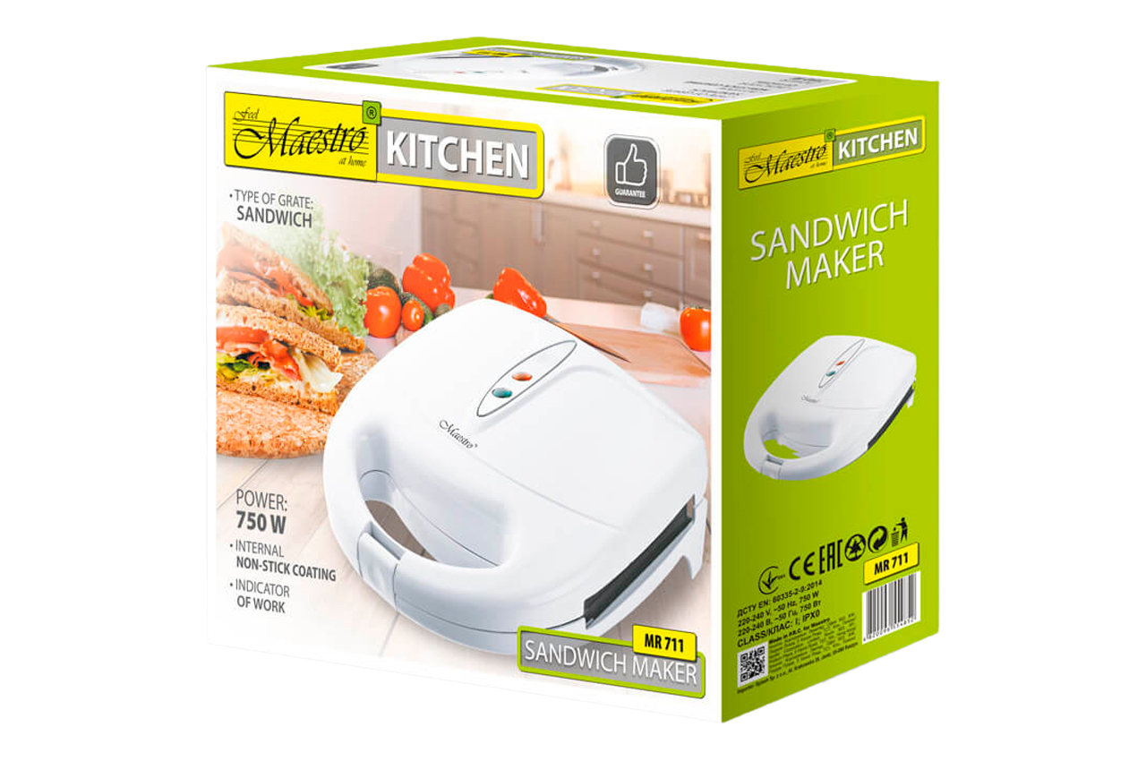 Сендвичница Maestro MR 711 еще называется бутербродницей. Этот кухонный прибор предназначается для быстрого приготовления горячих бутербродов, омлетов, тостов и десертов. Это универсальный кухонный прибор, который является незаменимой вещью на кухне в семьях, где любят бутерброды и омлеты. Приготовление этих блюд с бутербродницей Maestro MR 711 станет настоящим праздником. Прибор прост в использовании и управлении, он легко чистится, и является просто незаменимым дополнением на каждой кухне. Благодаря эргономичному дизайну, прибором приятно не только пользоваться, но еще и хранить на видном месте. Производитель Maestro предусмотрел в конструкции прибора индикаторы работы и готовности. С их помощью не понадобится периодически открывать крышку, чтобы визуально определить готовность блюда. Благодаря антипригарному покрытию, бутербродница никогда не допустит, чтобы ее кулинарные творения были испорчены. Сендвичница не только заменяет сковороду на плите, но еще и позволяет готовить безвредные блюда. Все это достигается благодаря типу решетки sandwich, которая имеет специальные углубления (отделения) в количестве 4 штук. Для качественного приготовления блюд, прибор оснащен ручкой с замком. С таким прибором на кухне каждая хозяйка сможет создать свое уникальное кулинарное творение.