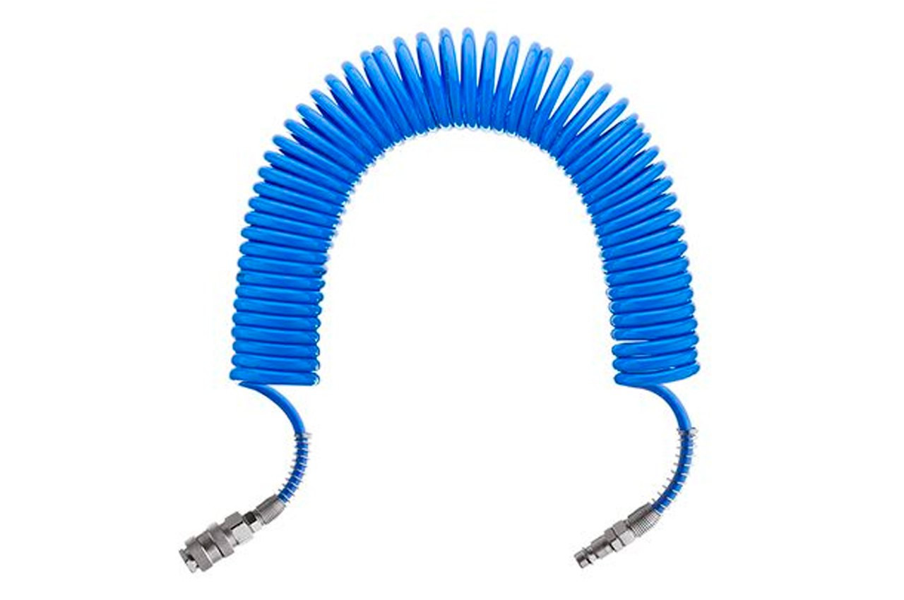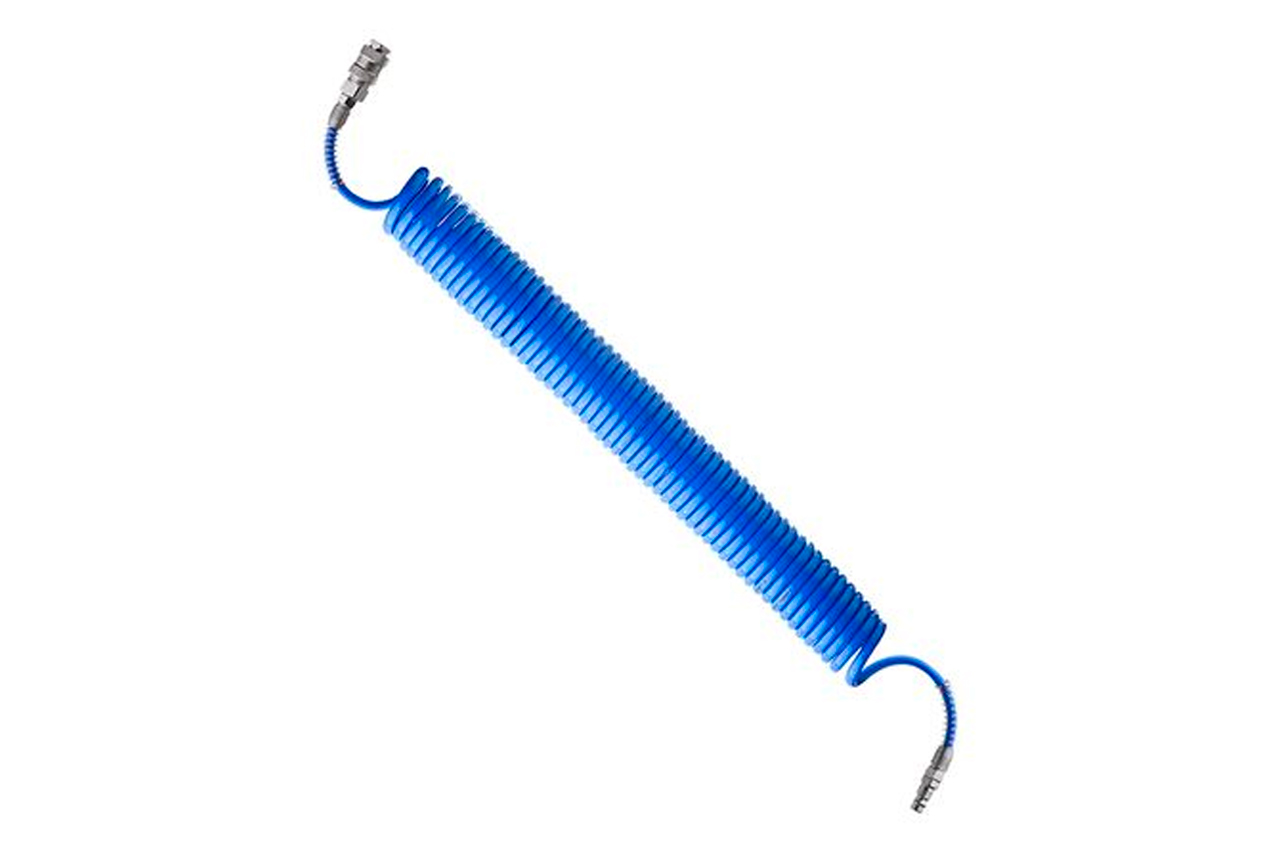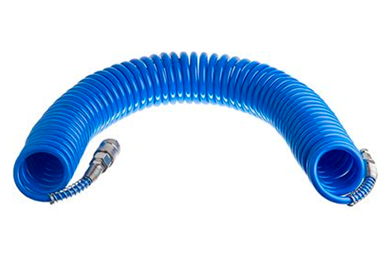 Шланг спиральный, изготовленный из полиуретана, используется для присоединения пневматических инструментов к компрессору. Длина шланга - 10 м, диаметр - 5,5 х 8 мм. Рабочее давление до 15 атм.