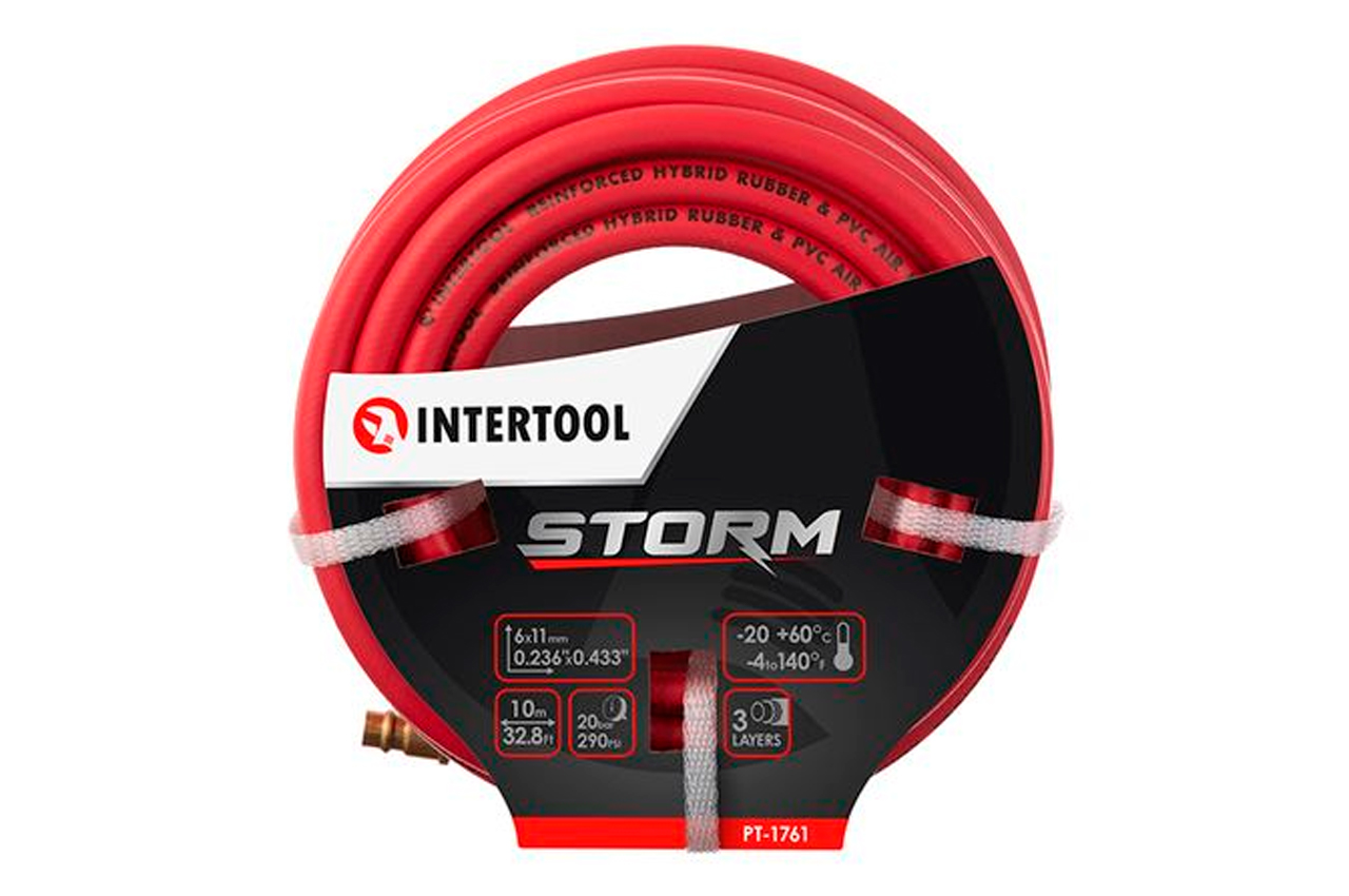 Шланг изготовлен из армированного гибридного состава и собрал в себе лучшие свойства резины и поливинилхлорида. Специальная формула сырья, из которого изготавливаются слои шланга, делают его эластичным, при этом устойчивым к низким и высоким температурам, износоустойчивым, маслостойким. Гибридные шланги стойкие к изломам и механическим повреждениям. Прочное армирование и толстые стенки шланга обеспечивает работу шланга с давлением воздуха до 20 атм. Все шланги оснащены латунными быстроразъемными соединениями, которые имеют ряд преимуществ перед стальными, такие как долговечность, устойчивость к коррозии, больший срок эксплуатации и т.д. Преимущества: Трехслойный эластичный, износостойкий. Устойчивый к воздействию масел и влаги. Давление до 20 атм. Температура эксплуатации от -20°С до + 60°С. Латунные быстроразъемные соединения. Модель PT-1761 PT-1762 PT-1763 PT-1771 PT-1772 PT-1773 PT-1781 PT-1782 PT-1783 Длина, м 10 20 30 10 20 30 10 20 30 Диаметр, мм 6*11 6*11 6*11 8*15 8*15 8*15 10*17 10*17 10*17 Быстроразъемные соединения (латунь) + + + + + + + + + Длина шланга: 10 м; Диаметр шланга: 6*11 мм; Рабочее давление: до 20 бар; Температура внешней среды: от -20 до +60 °С