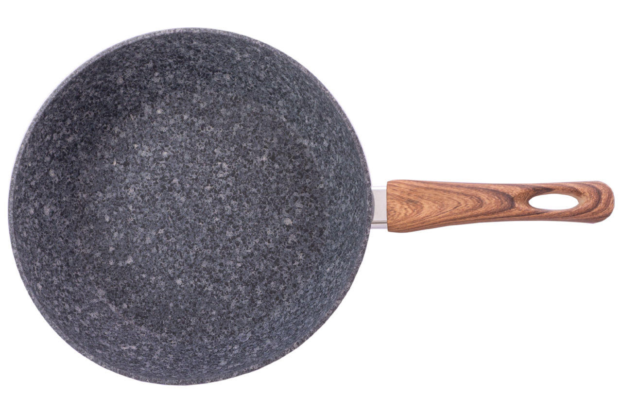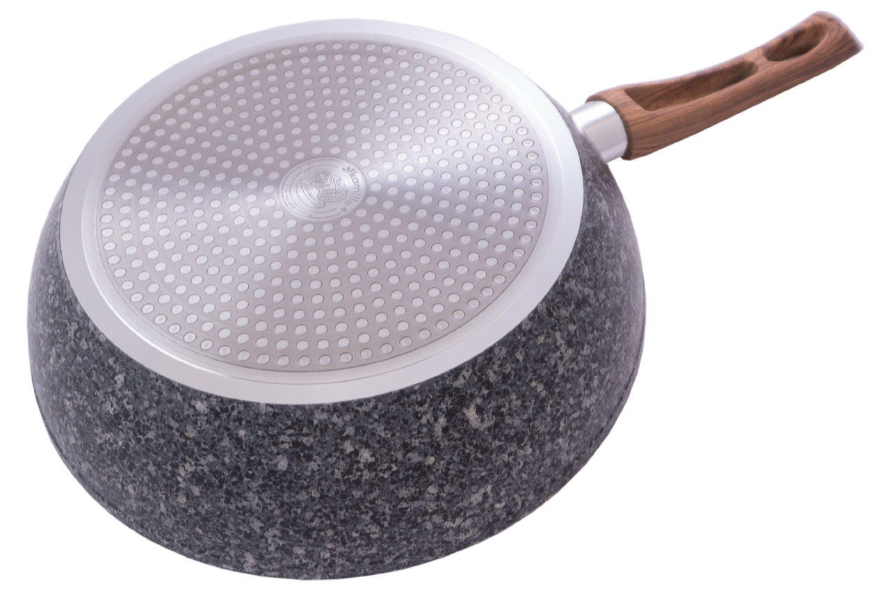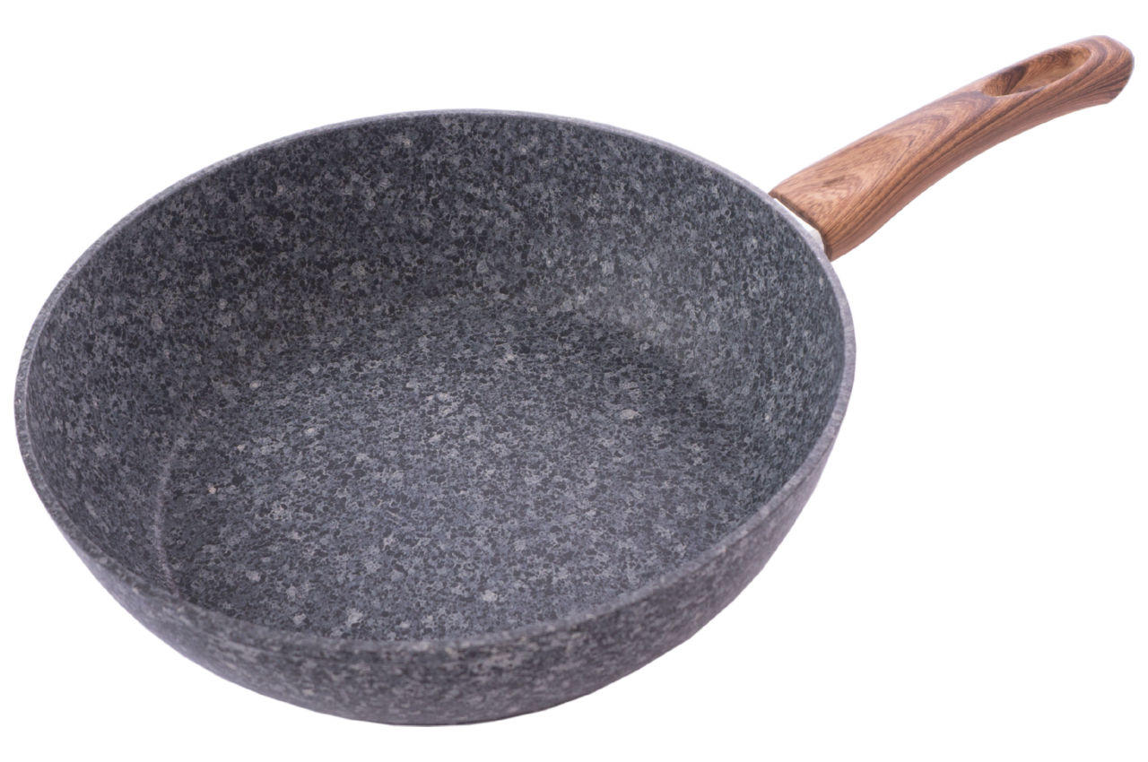 Благодаря прочному гранитному покрытию, такая сковорода устойчива к механическим воздействиям, за счет чего значительно увеличивается срок ее службы. Сковорода нагревается равномерно, не создавая перегретых участков и холодных краев, даже в тех случаях, когда процесс приготовления еды идет на небольшом огне. Диаметр: 28см. Высота 8см. Длина ручки: 19,5см. Материал: алюминий. Материал ручки: бакелит с рисунком "под дерево". Антипригарное покрытие: гранитное PTFE.