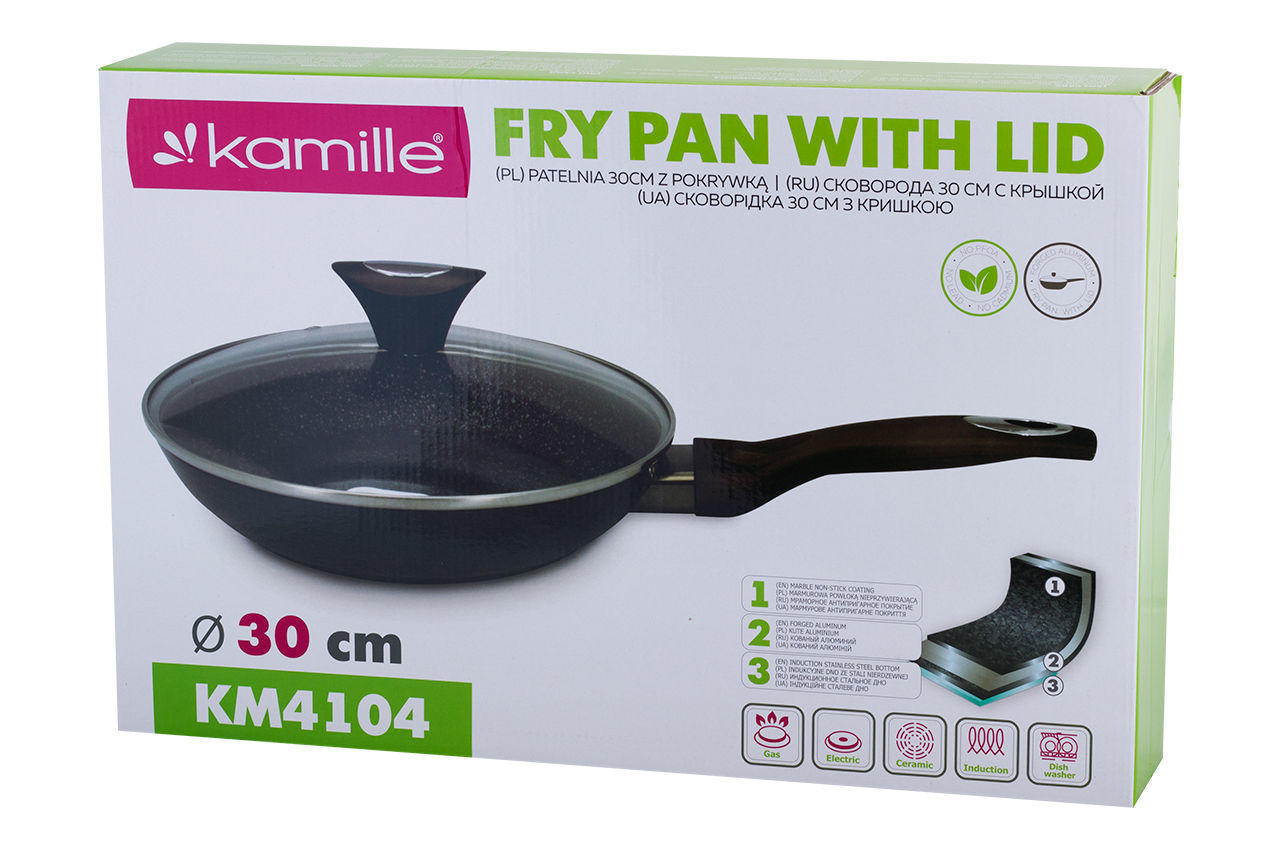 Сковорода антипригарная Kamille - 300 мм Black Marble с крышкой. Благодаря прочному антипригарному покрытию такая сковорода устойчива к механическим воздействиям, за счет чего значительно увеличивается срок ее службы. Сковорода нагревается равномерно, не создавая перегретые участки и холодные края, даже в тех случаях, когда процесс приготовления пищи идет на небольшом огне. В результате сокращается время приготовления блюда и уменьшается риск есть смесь недожаренной или пережаренной пищи.