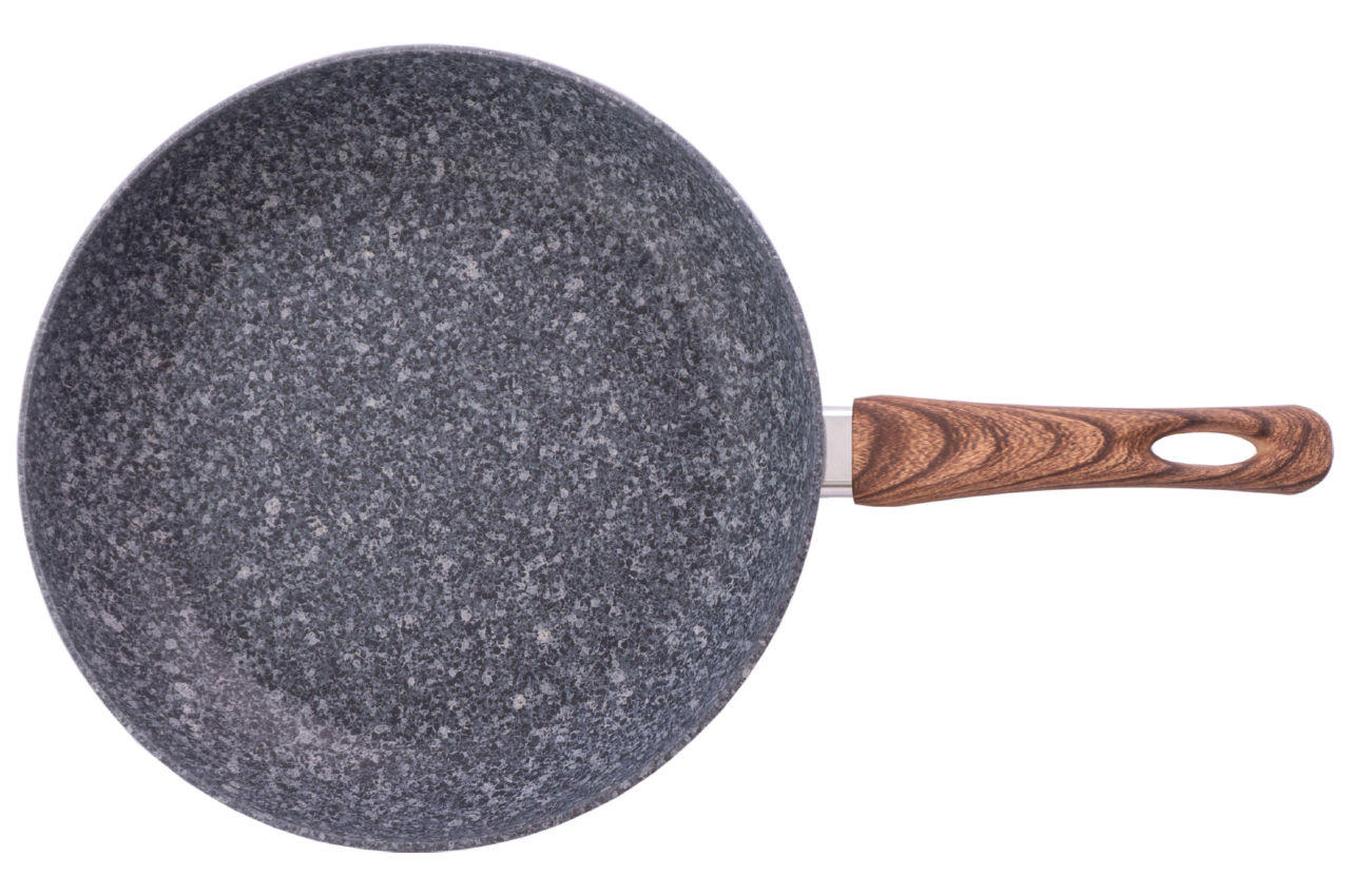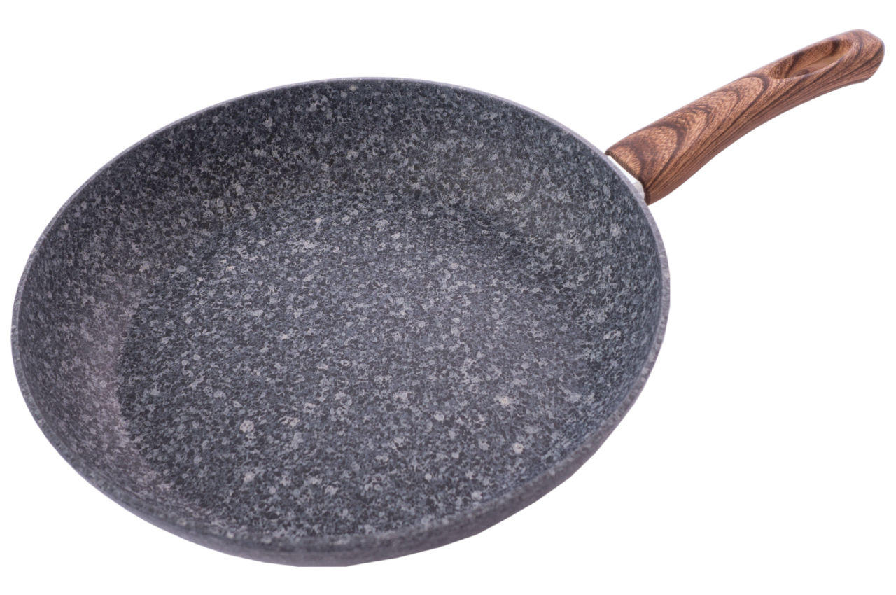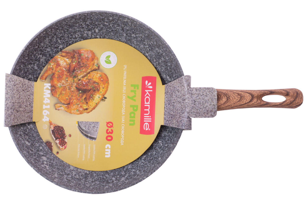 Сковорода антипригарная Kamille - 300 мм Granite. Благодаря прочному гранитному покрытию, такая сковорода устойчива к механическим воздействиям, за счет чего значительно увеличивается срок ее службы. Сковорода нагревается равномерно, не создавая перегретых участков и холодных краев, даже в тех случаях, когда процесс приготовления еды идет на небольшом огне. Диаметр: 30см. Высота 6см. Длина ручки: 19,5см. Материал: алюминий. Материал ручки: бакелит с рисунком "под дерево". Антипригарное покрытие: гранитное PTFE.