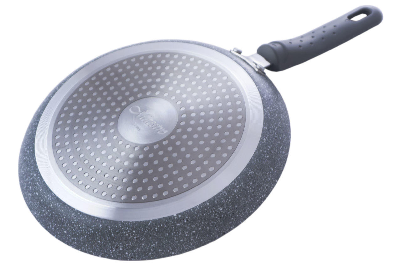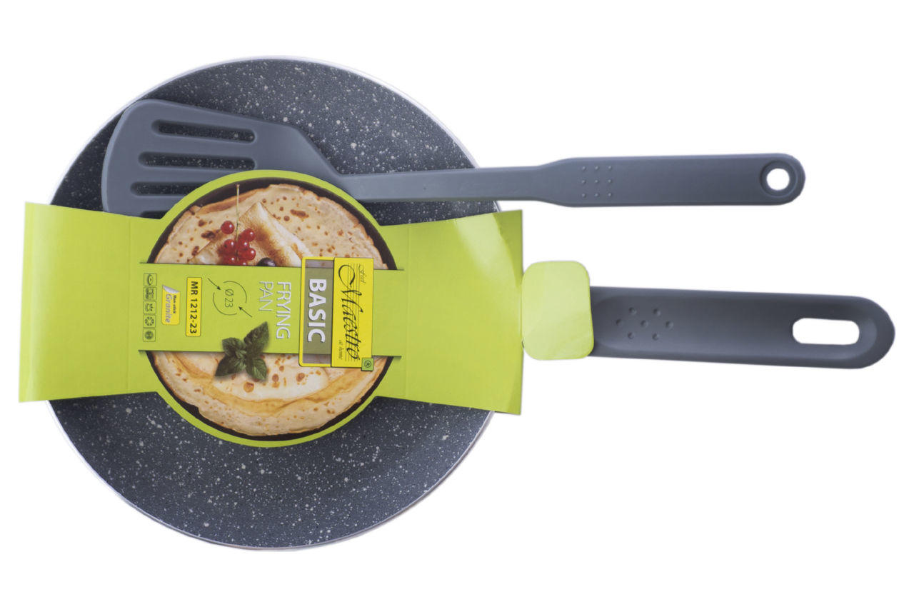 Сковорода для блинов антипригарная Maestro – 230 мм Granite с лопаткой. MR-1212-23 диаметром 23 см со стойким антипригарным покрытием Granite подходит для всех источников тепла, в частности для индукции. Сковорода проста и удобна в использовании, легко моется. Выпускается в сером изготовлении корпуса.