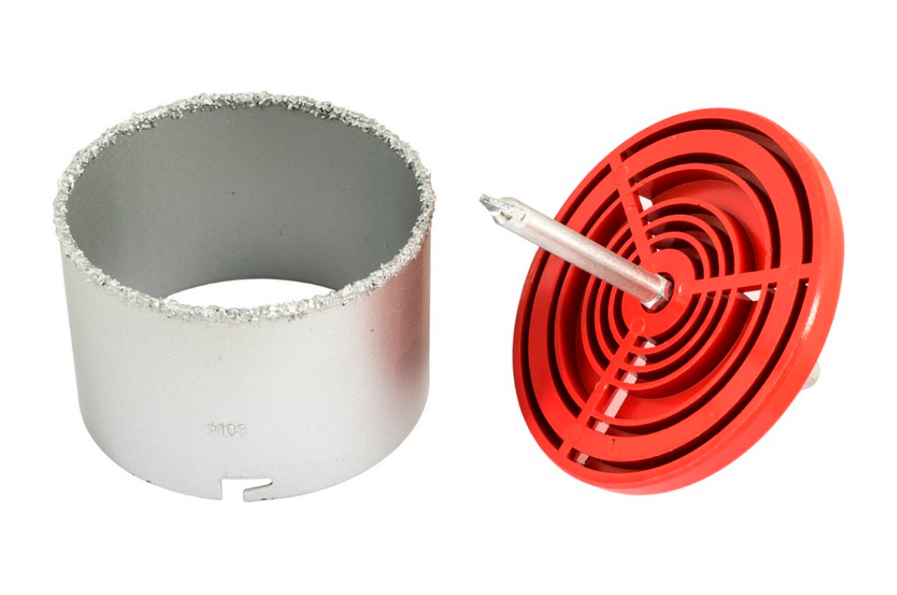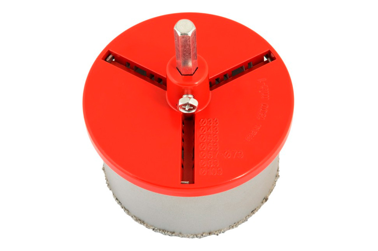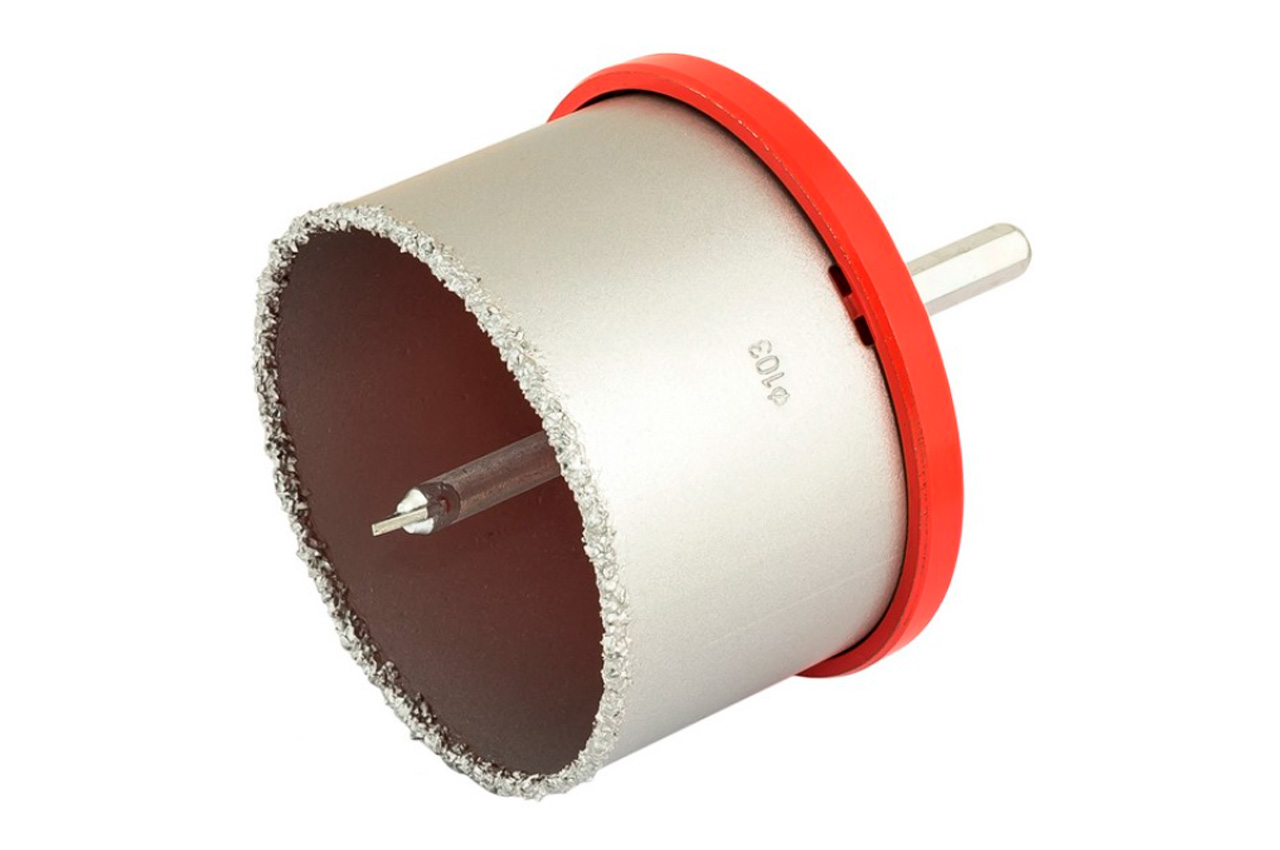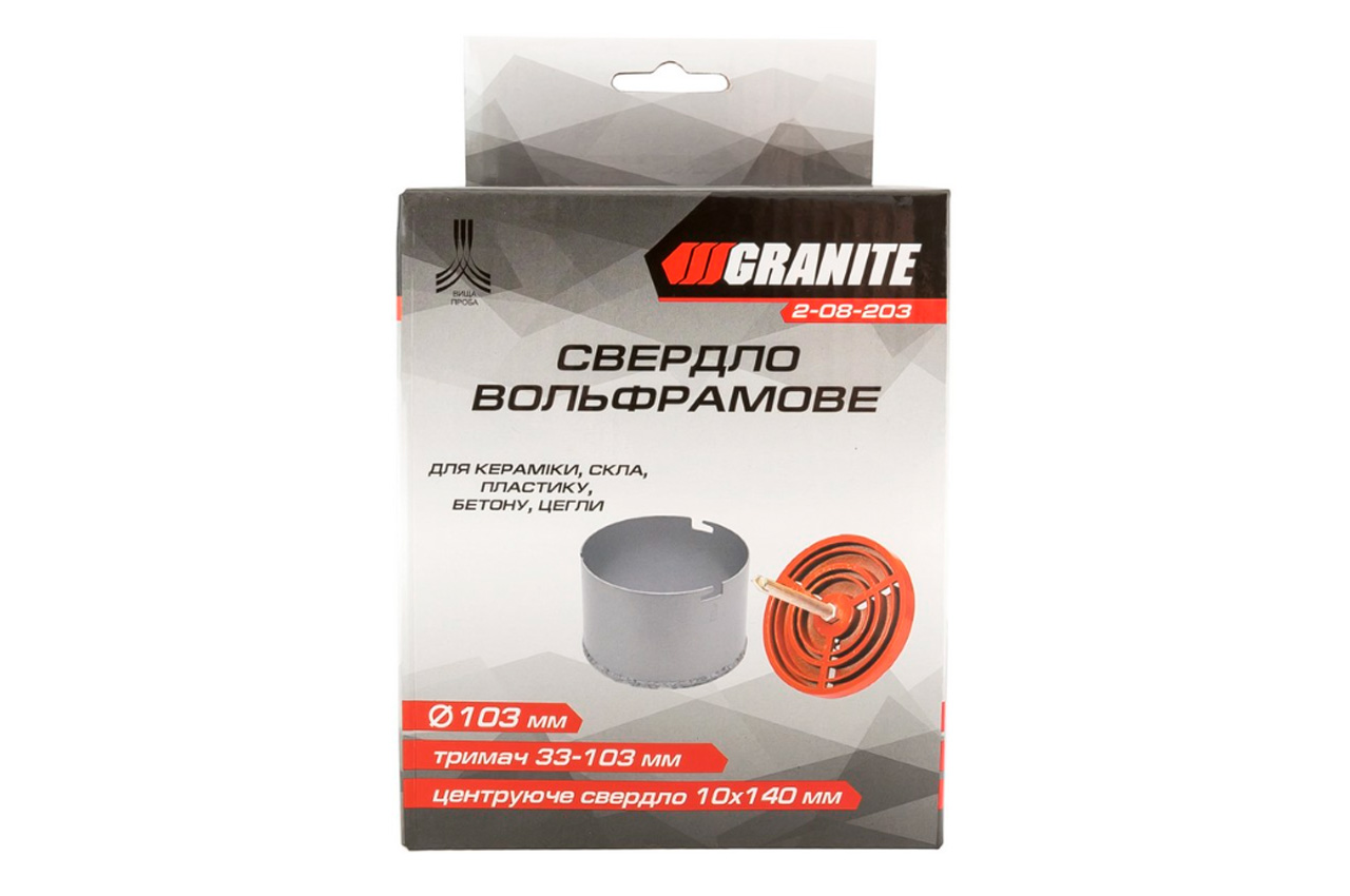 Изготовлено из стали с вольфрамовым напылением; используется для керамики, стекла, пластика, бетона, кирпича; при сверлении бетона и кирпича требует охлаждения водой; рекомендуемая частота вращения 800-1500 об/мин; в комплекте есть держатель (подходит для Ø33-103 мм) и центрирующее сверло 10х140 мм