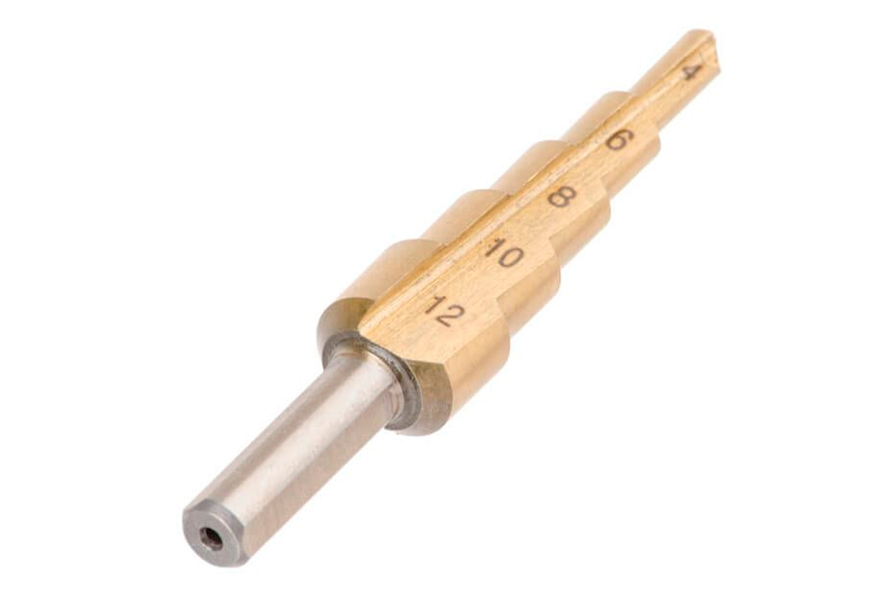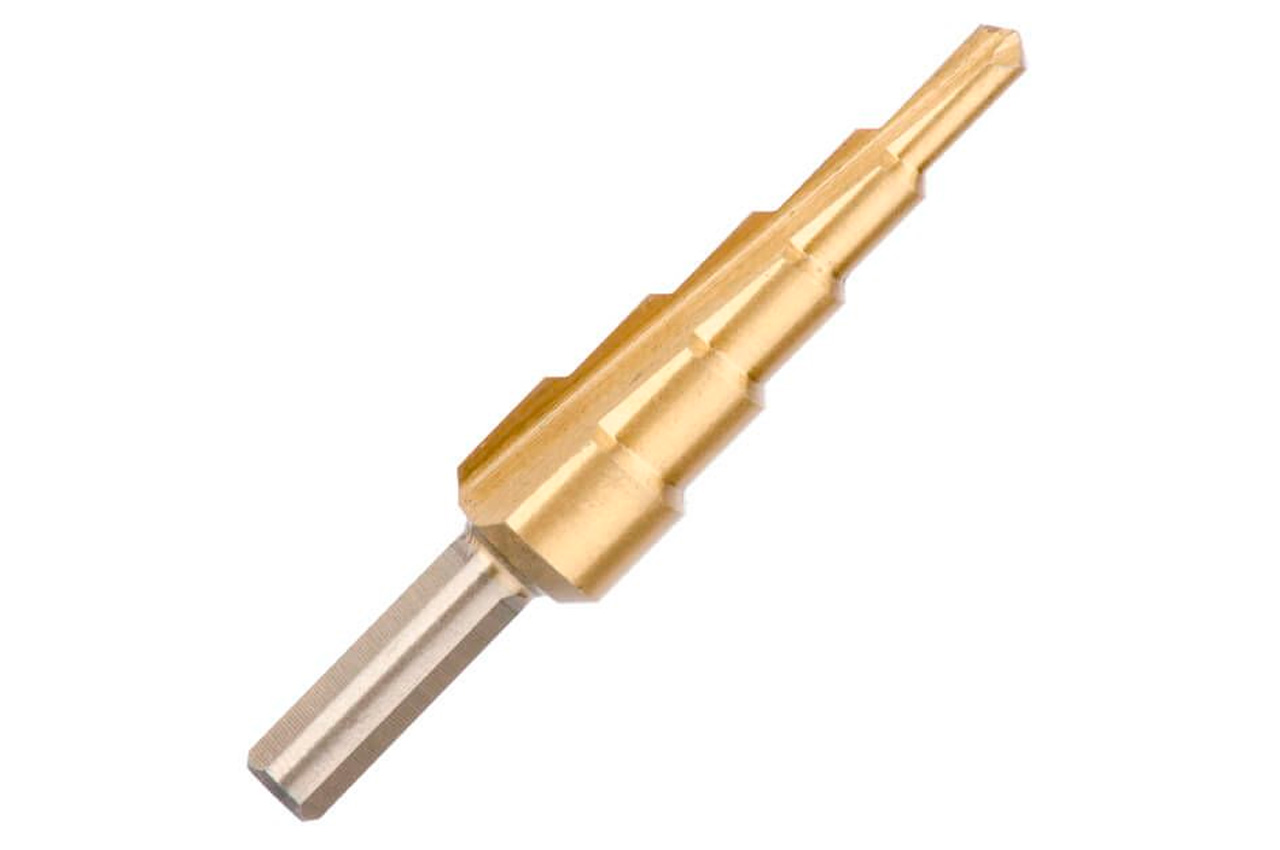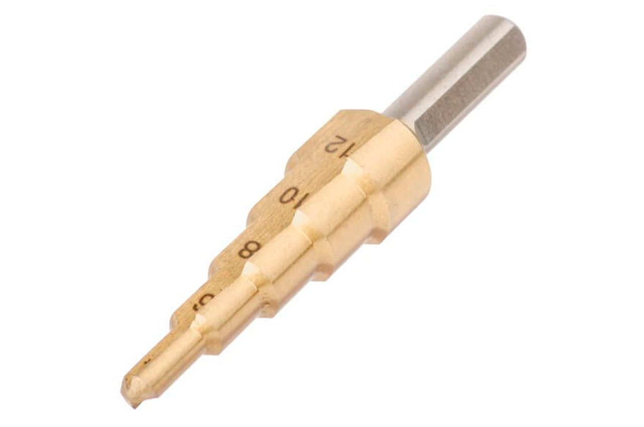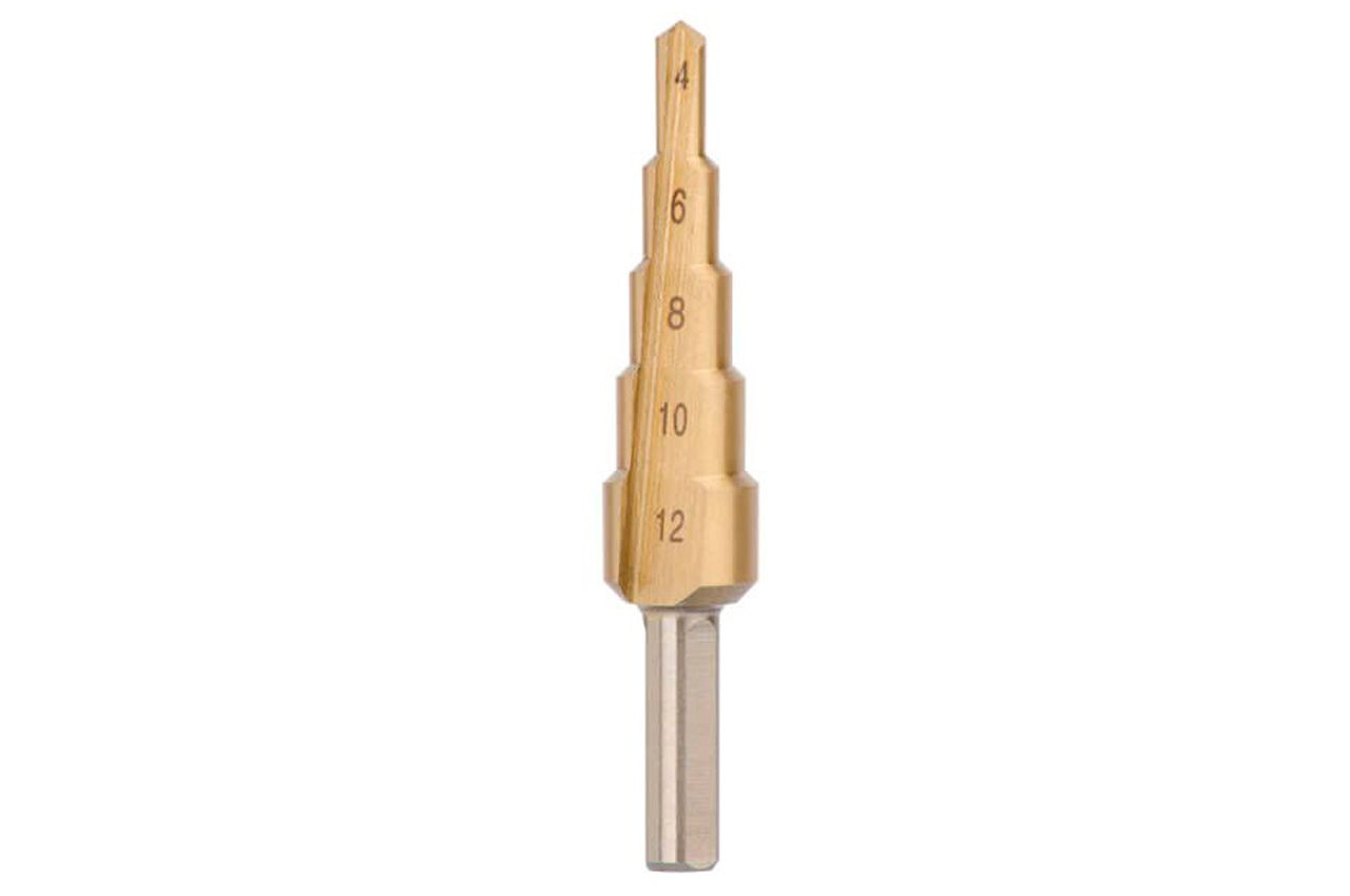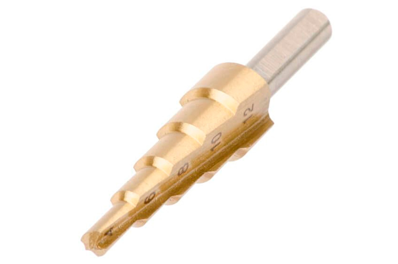 Ступенчатое (шаговое) сверло – отличный помощник для деликатного сверления отверстий большого диаметра в листовых металлах и пластике. Ступенчатая структура позволяет сверлить отверстия разного диаметра (4-12 мм), без замены режущего инструмента. Цилиндрический хвостовик позволяет устанавливать сверло в дрель, шуруповерт или сверлильный станок. Шаг: 2 мм; Максимальная глубина сверления: 4 мм; Диаметр хвостовика: 6 мм; Количество ступеней: 5; Диаметр сверла: 4, 6, 8, 10, 12 мм