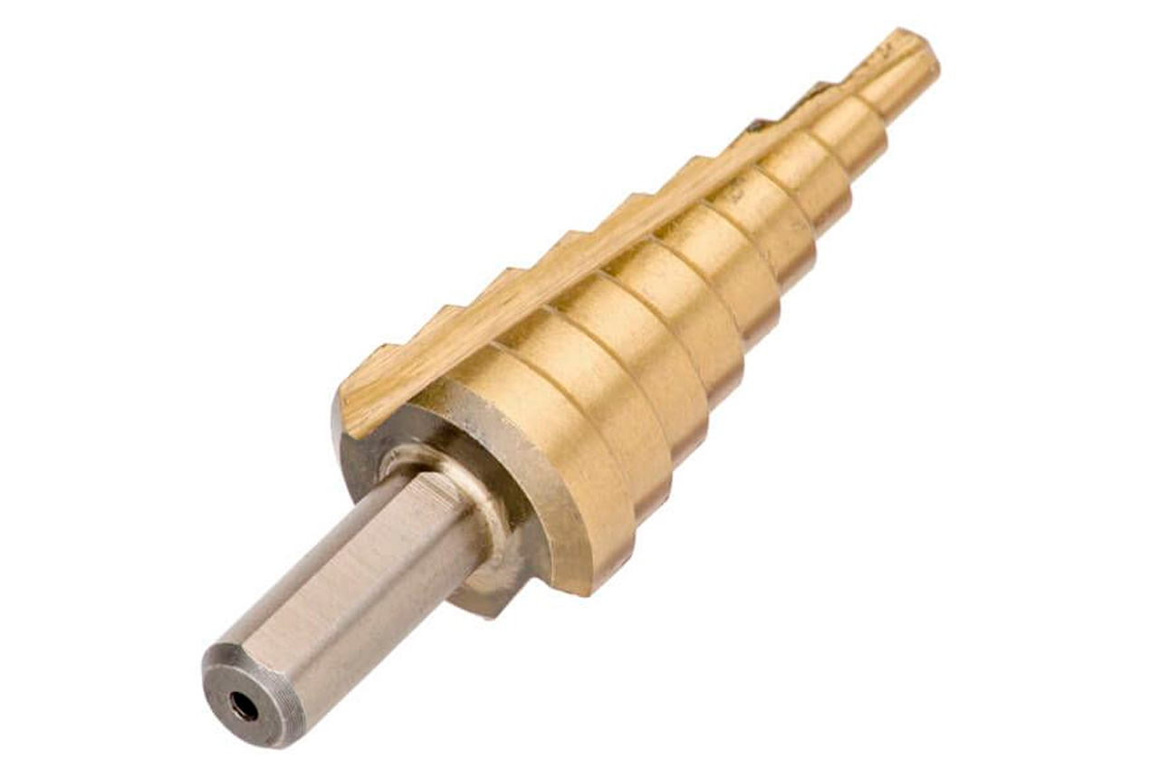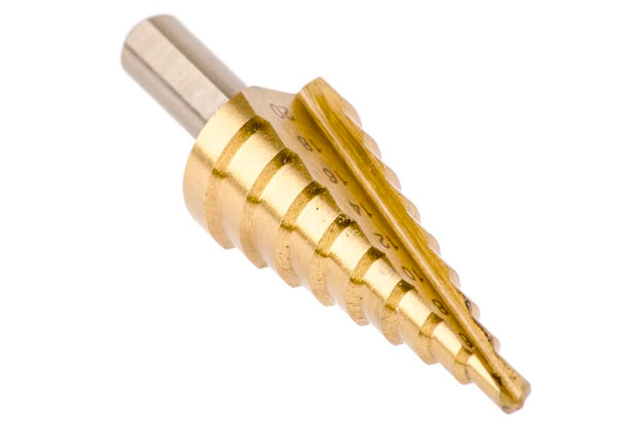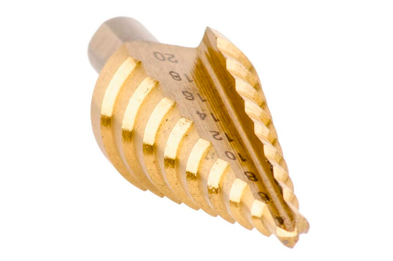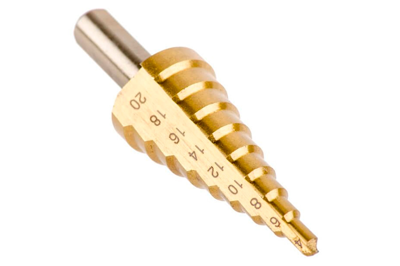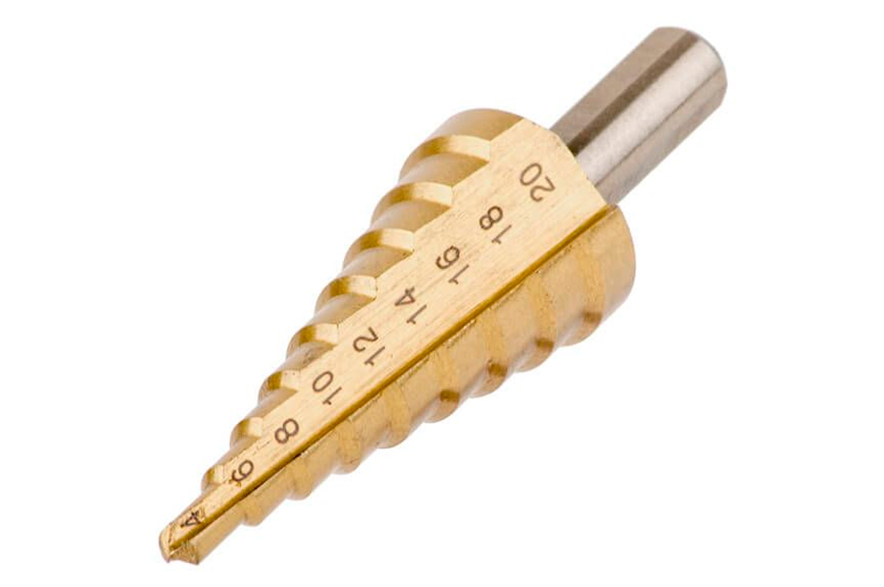 Ступенчатое (шаговое) сверло – отличный помощник для деликатного сверления отверстий большого диаметра в листовых металлах и пластике. Ступенчатая структура позволяет сверлить отверстия разного диаметра (4-20 мм), без замены режущего инструмента. Цилиндрический хвостовик позволяет устанавливать сверло в дрель, шуруповерт или сверлильный станок. Шаг: 2 мм; Максимальная глубина сверления: 4 мм; Хвостовик: цилиндрический 8 мм; Количество ступеней: 9; Диаметр сверла: 4, 6, 8, 10, 12, 14, 16, 18, 20 мм