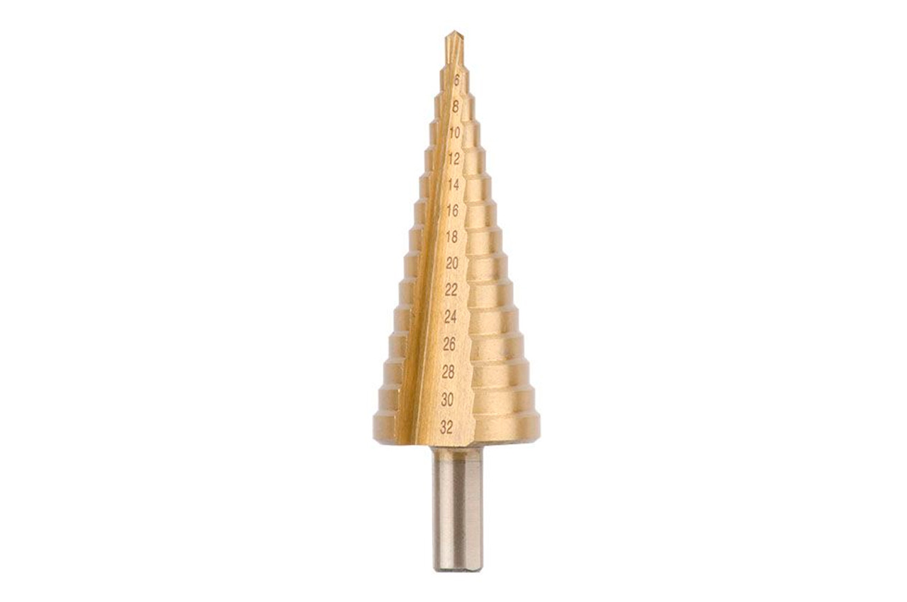 Ступенчатое (шаговое) сверло – отличный помощник для деликатного сверления отверстий большого диаметра в листовых металлах и пластике. Ступенчатая структура позволяет сверлить отверстия разного диаметра (4-32 мм), без замены режущего инструмента. Цилиндрический хвостовик позволяет устанавливать сверло в дрель, шуруповерт или сверлильный станок. Шаг: 2 мм; Максимальная глубина сверления: 4; Хвостовик: цилиндрический 10 мм; Количество ступеней: 15; Диаметр сверла: 4, 6, 8, 10, 12, 14, 16, 18, 20, 22, 24, 26, 28, 30, 32 мм